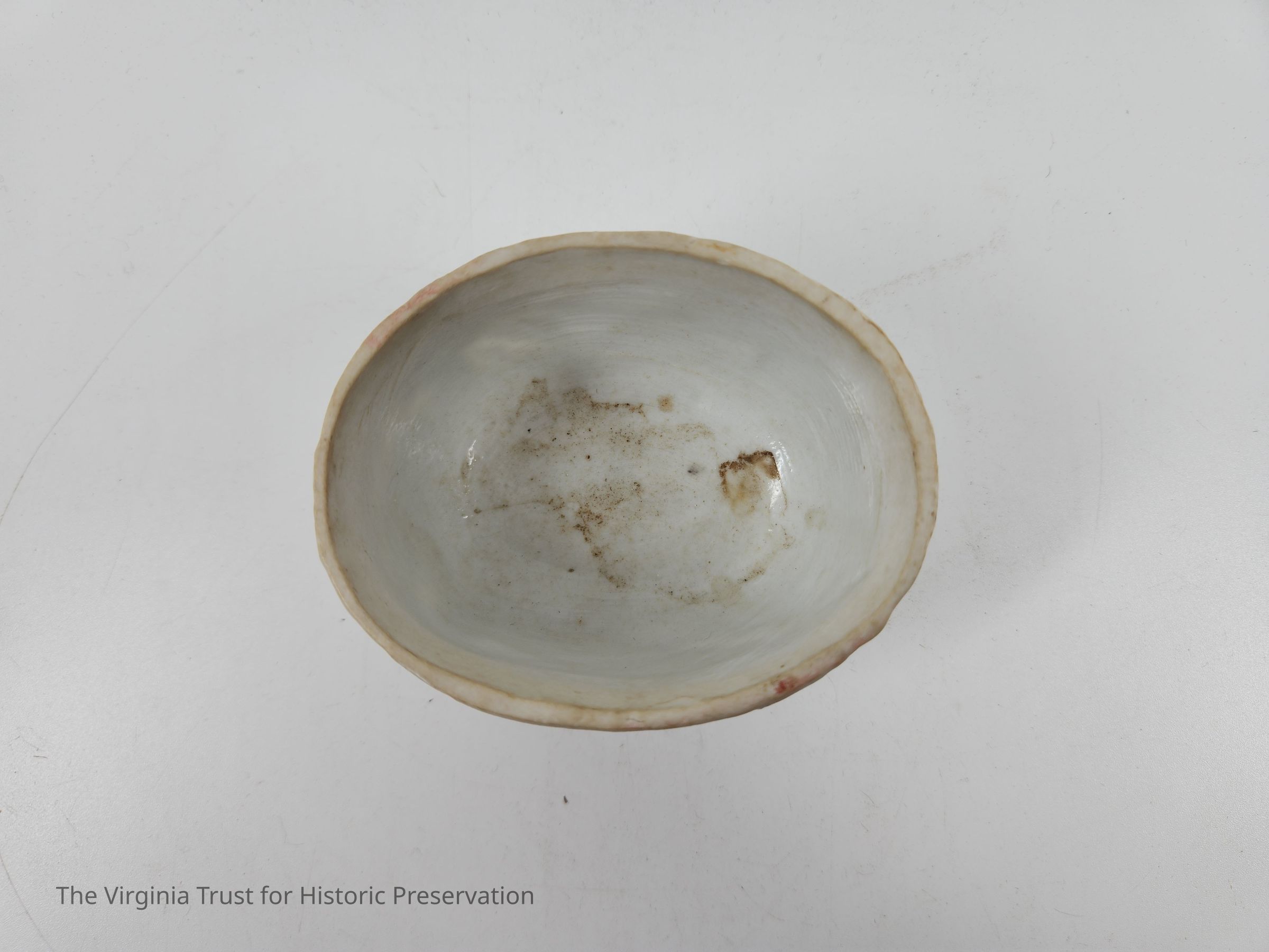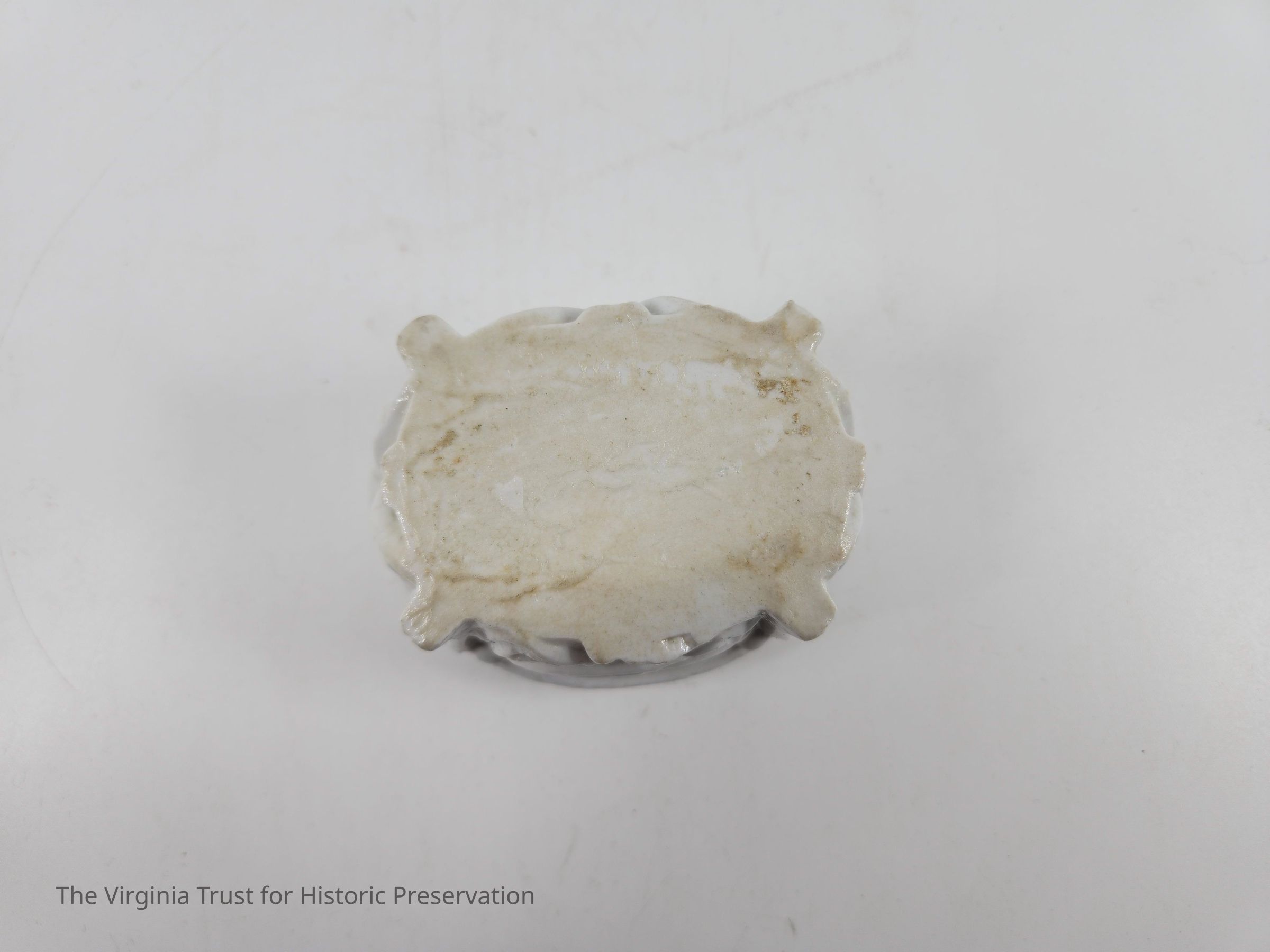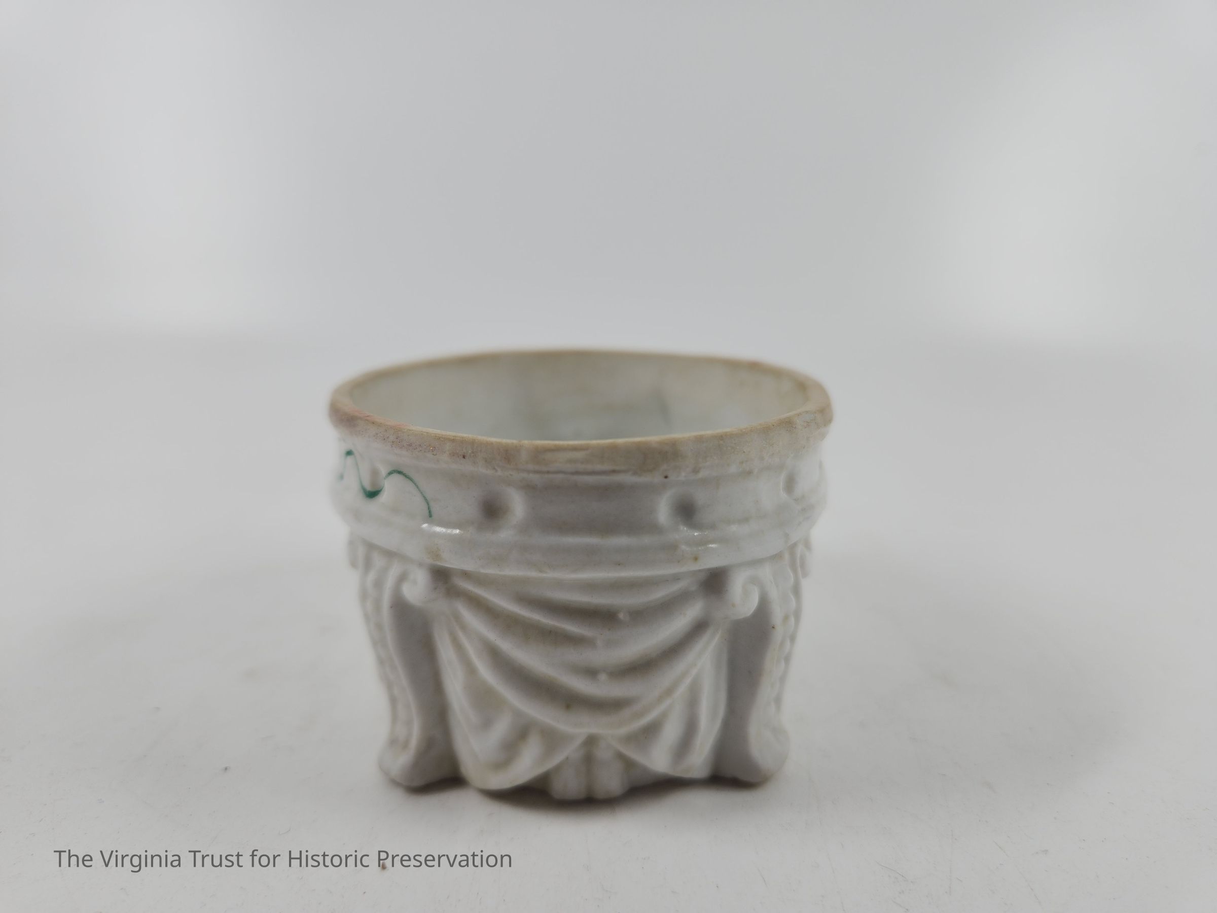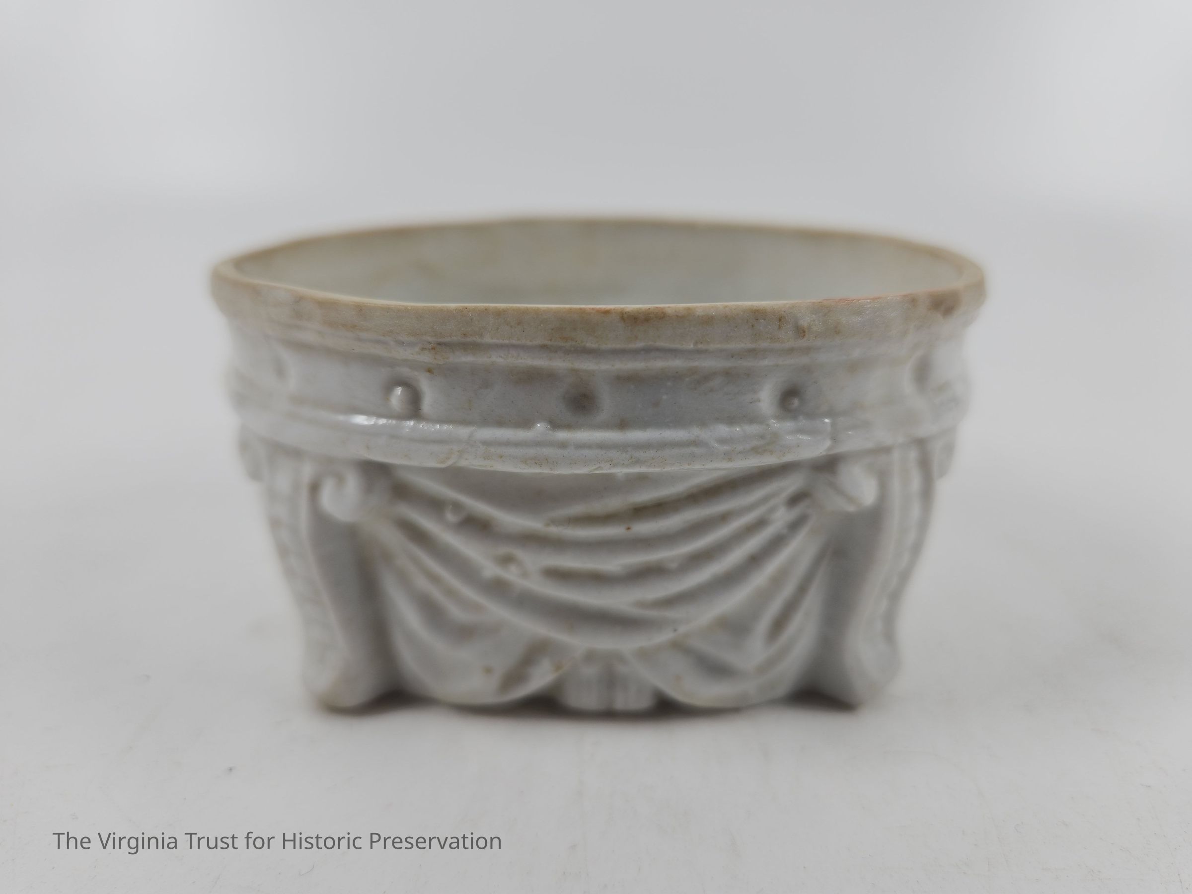 Molded milk glass salt cellar. Four beaded legs with draped textile decoration in between with tassles. Though there are green markings on the form, it is unlikely this is original. Rim retains traces of gilding.Dimensions