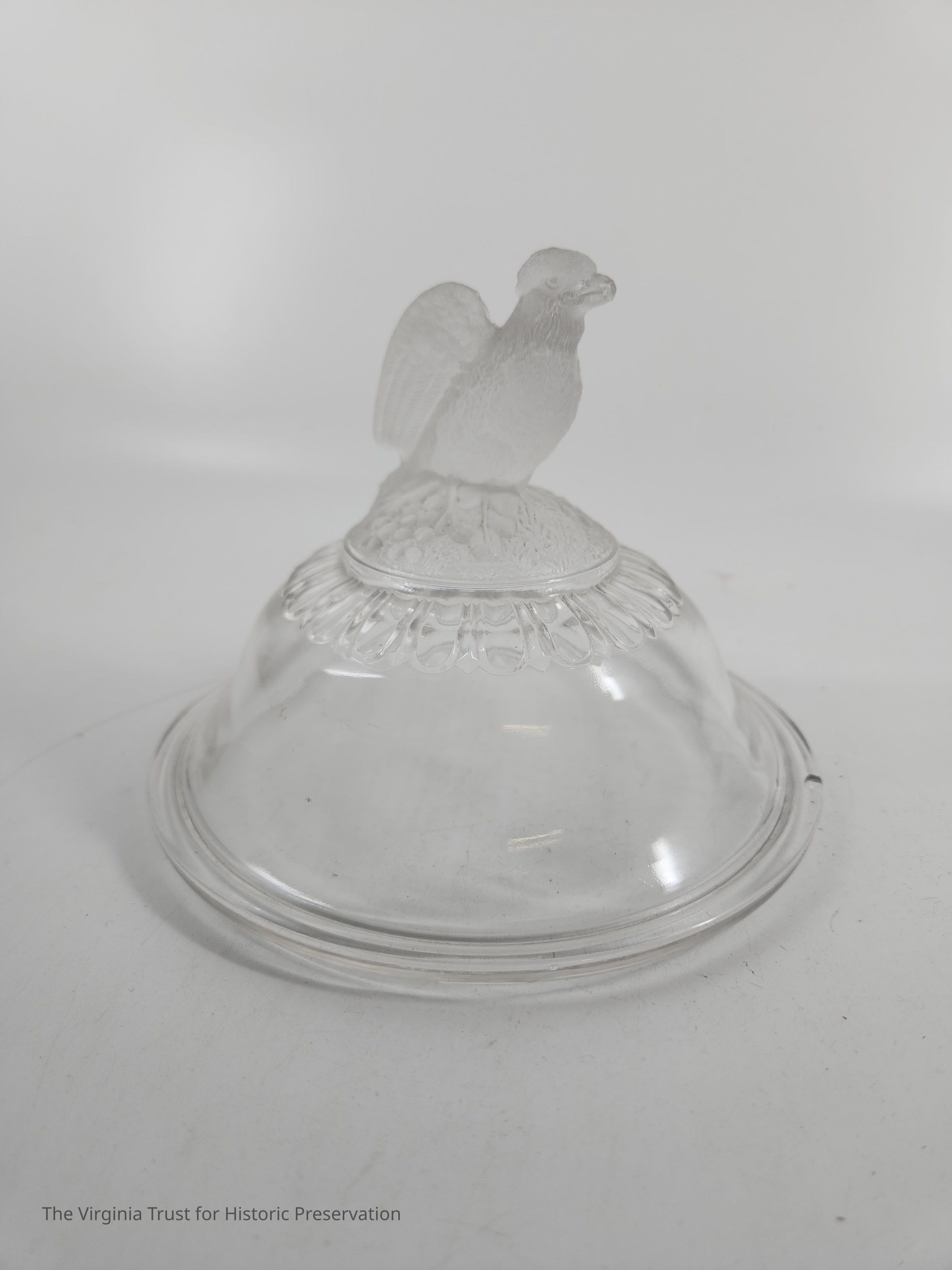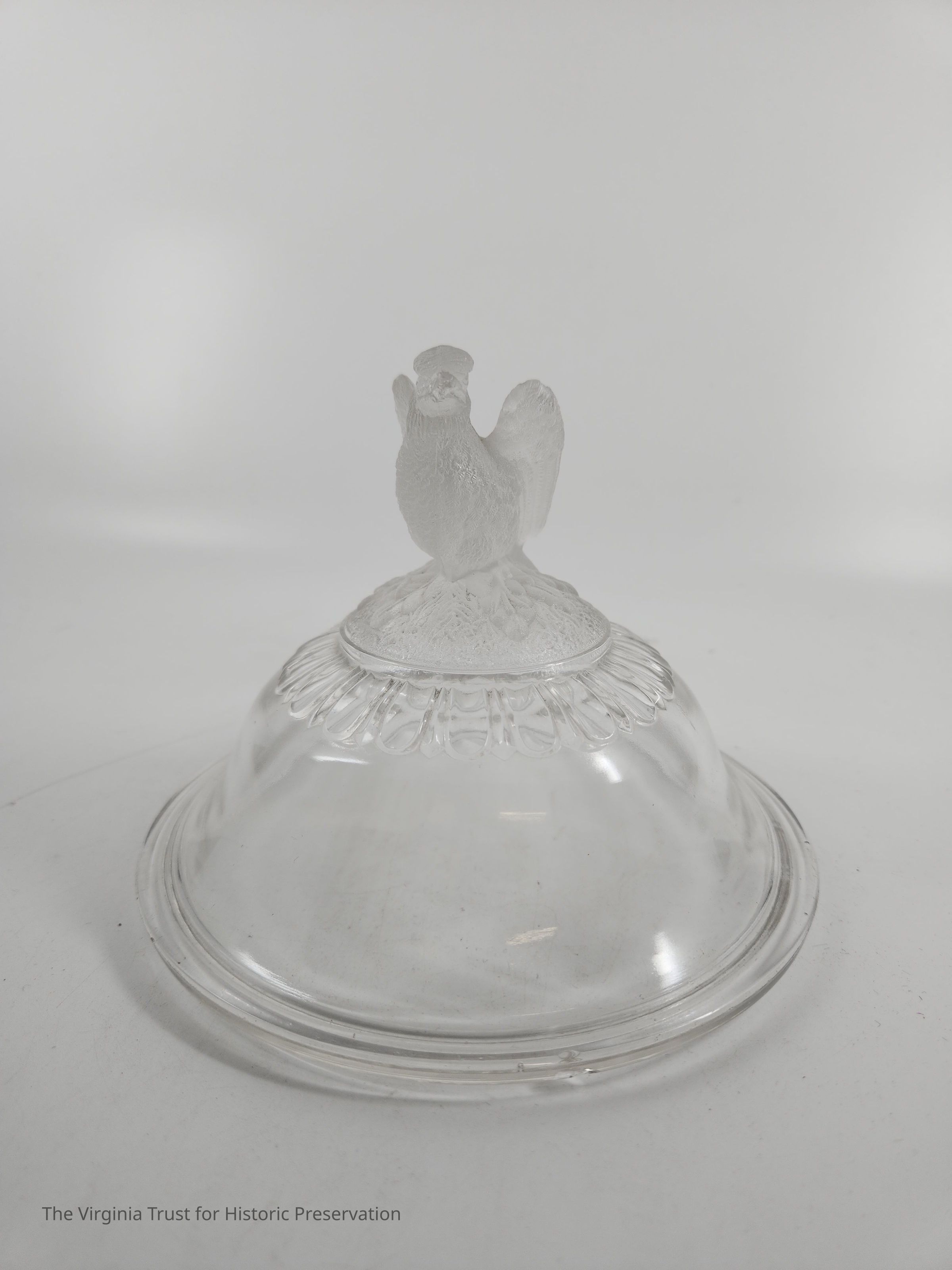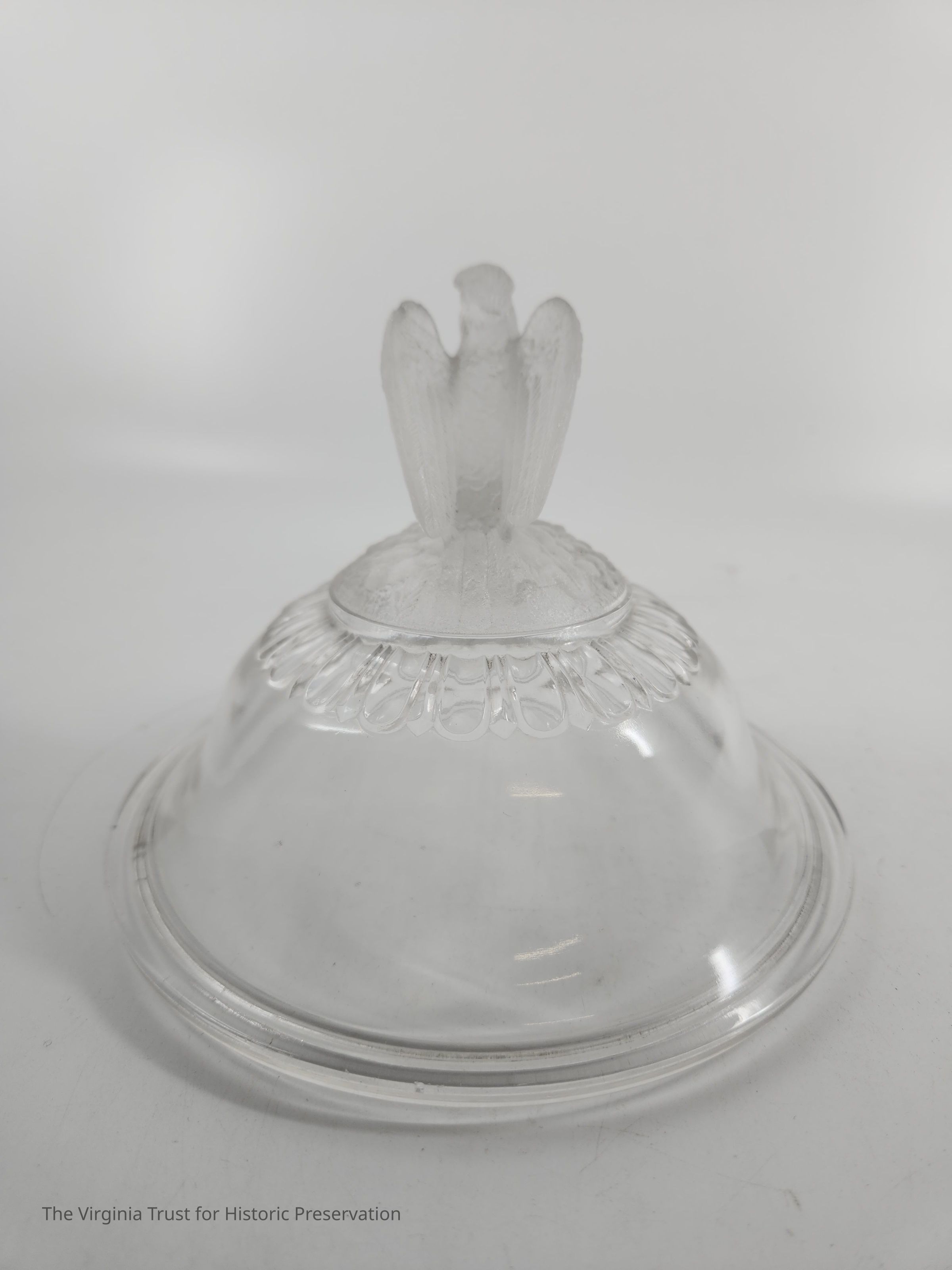 Clear pressed glass compote lid with molded finial. Eagle finial (TRUMP EAGLE) with folded back wings sitting on flowers and leaves. Egg and dart pattern around the pattern. Lip to fit base 2015.020 B.Dimensions