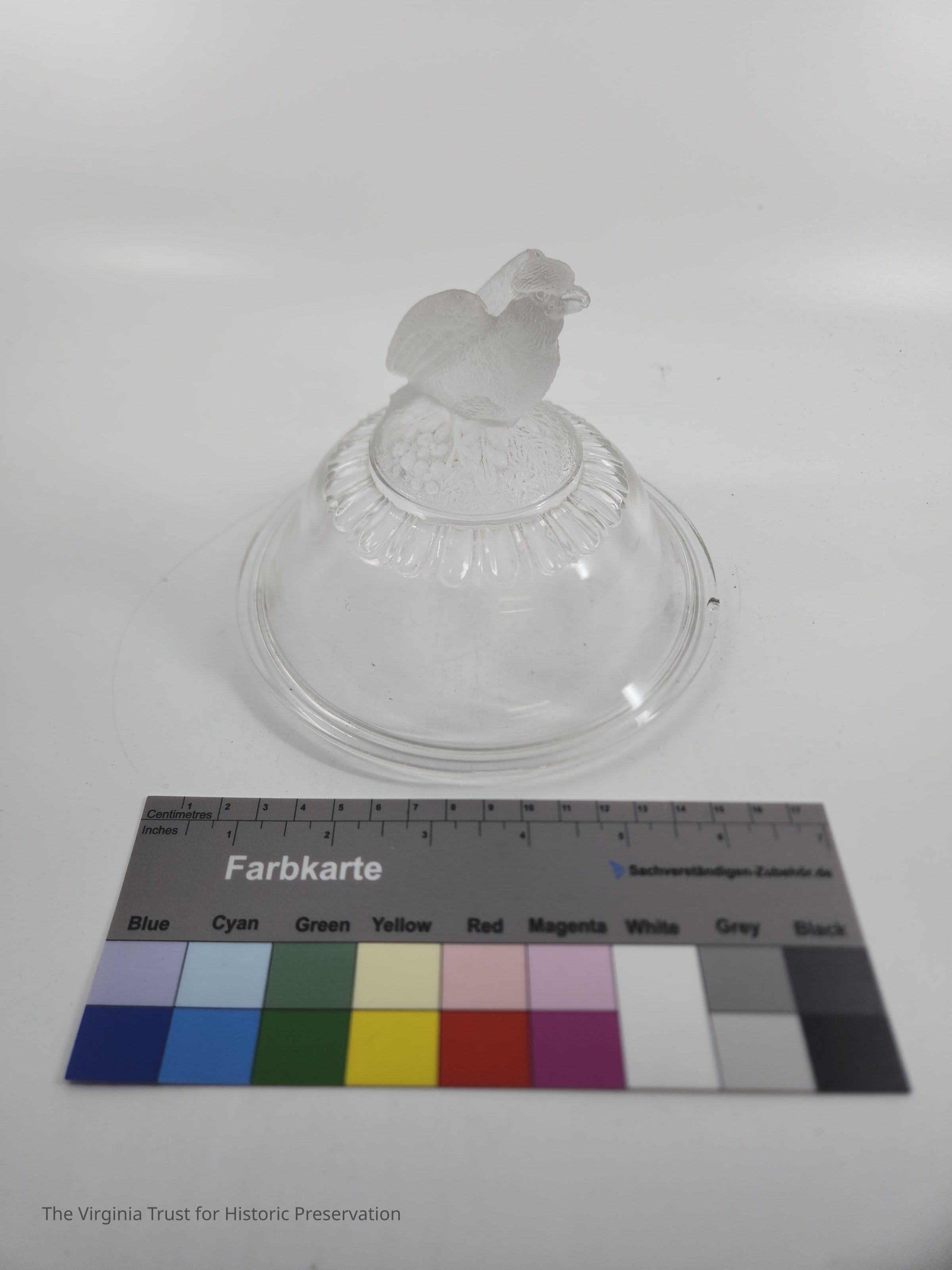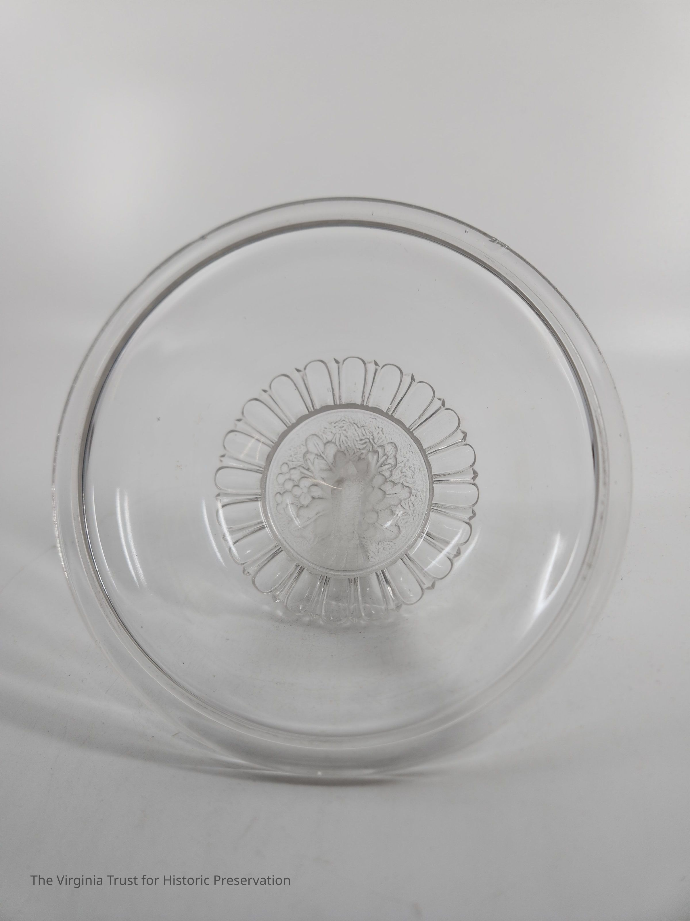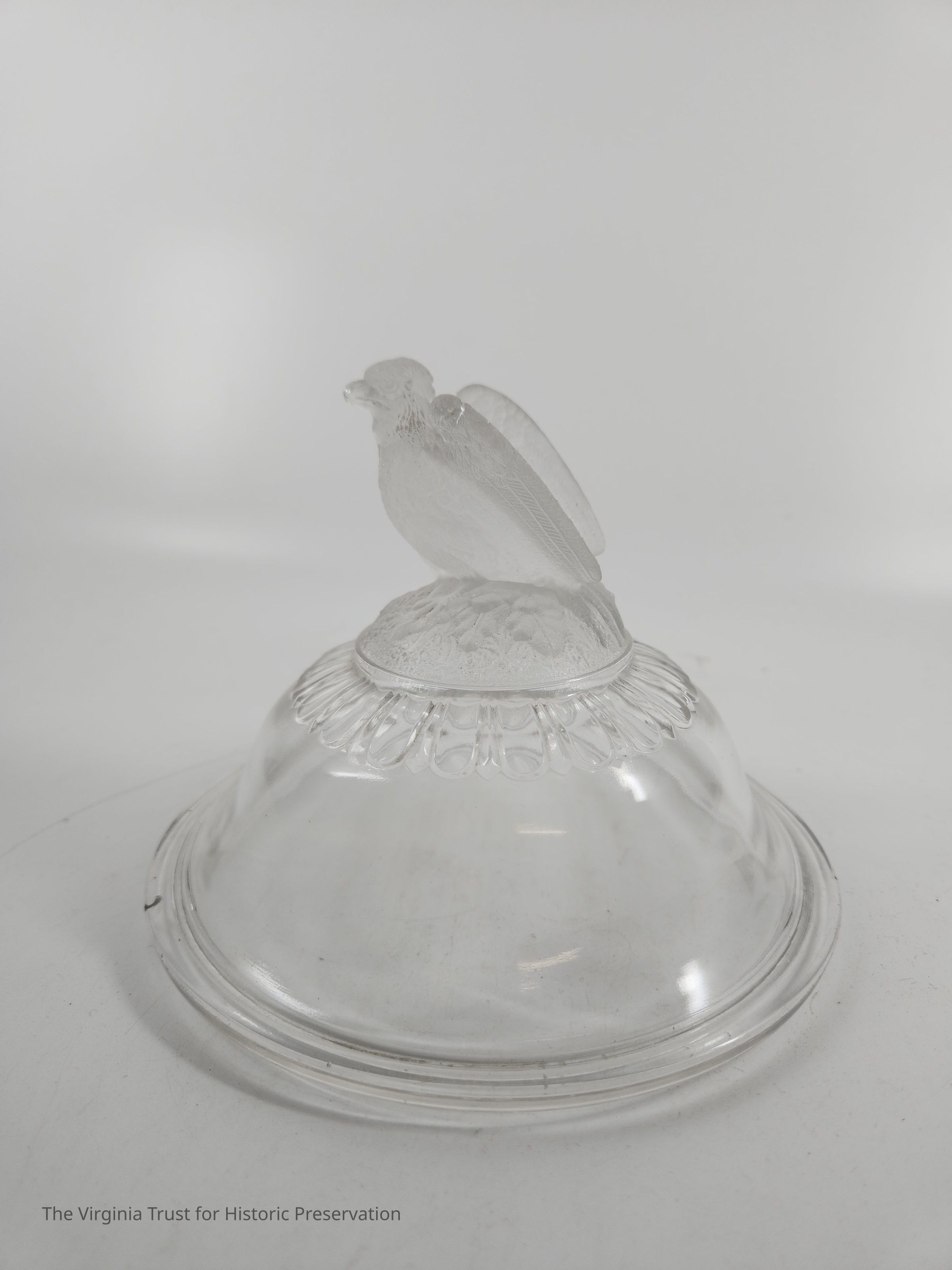 Clear pressed glass compote lid with molded finial. Eagle finial (TRUMP EAGLE) with folded back wings sitting on flowers and leaves. Egg and dart pattern around the pattern. Lip to fit base 2015.020 B.Dimensions