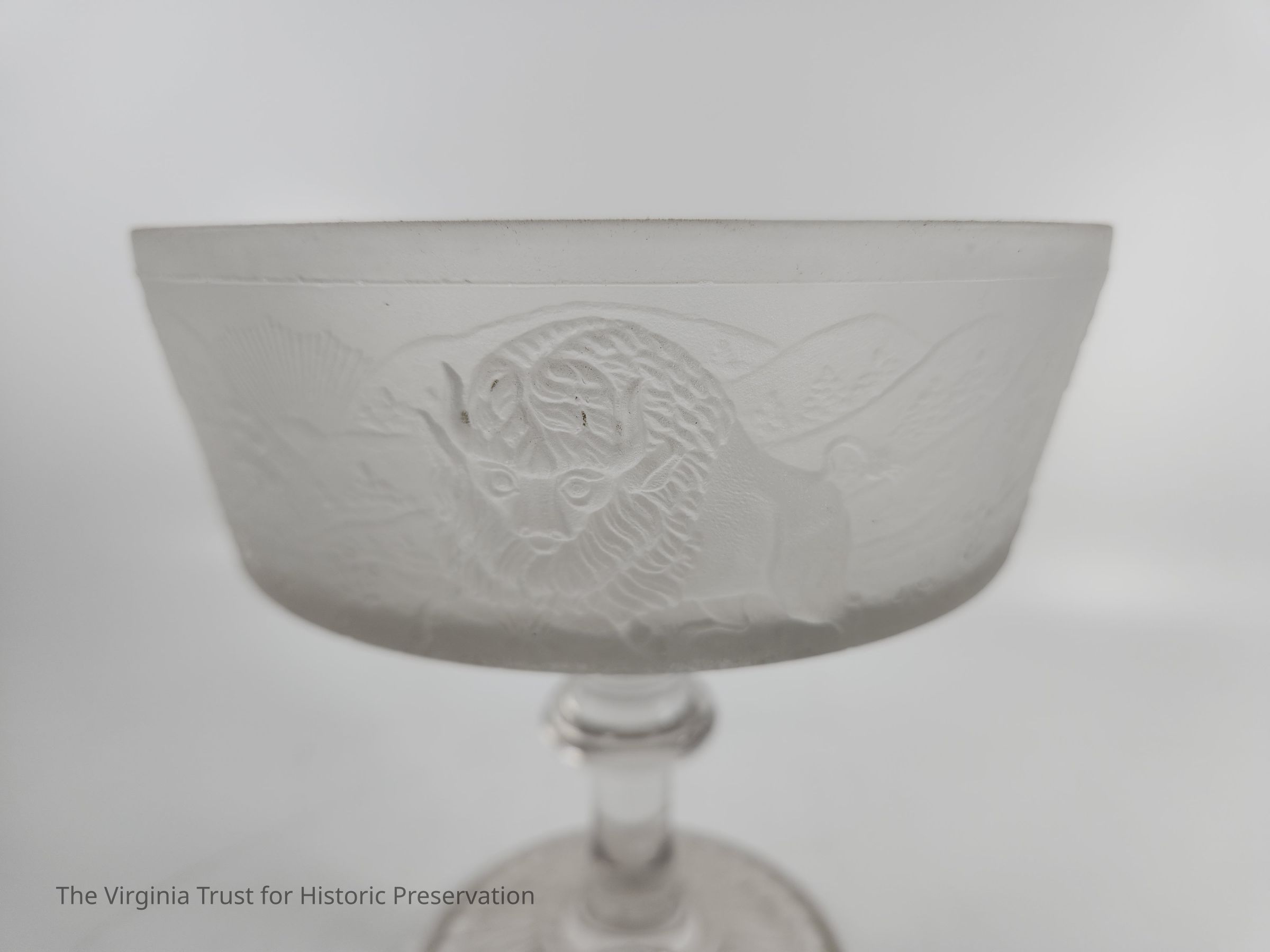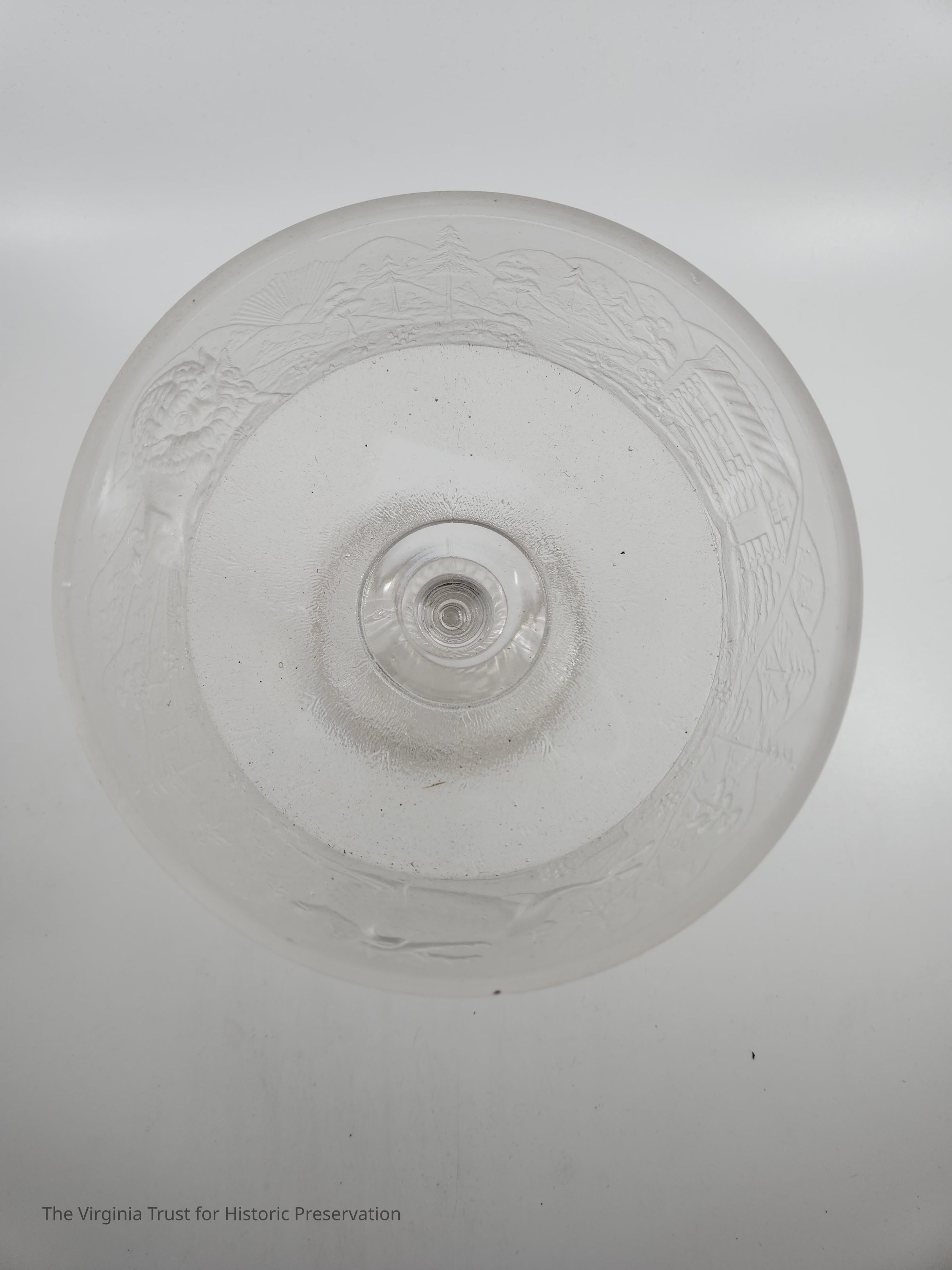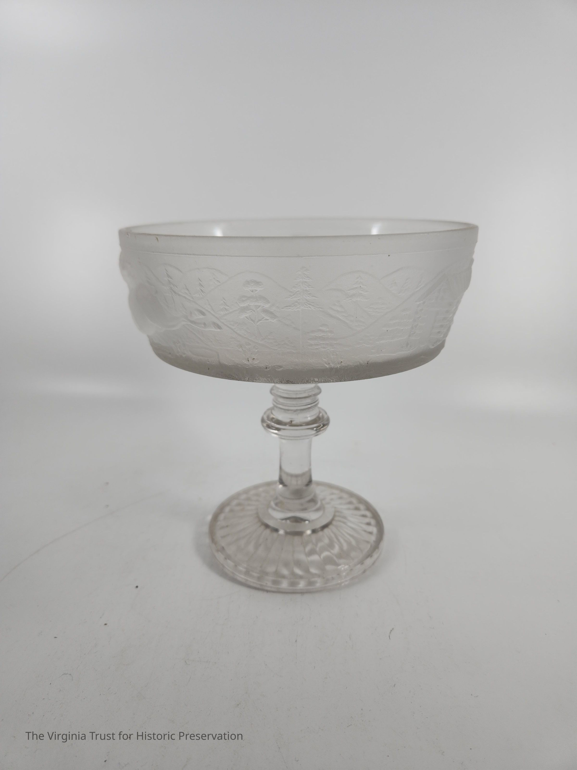 Non-flint American pressed glass high stand 6" compote in the "Westward Ho!" pattern. Clear frosted glass. Scene decorating bowl depicts deer, buffalo, and a log cabin in a wilderness background (trees, mountains).Dimensions