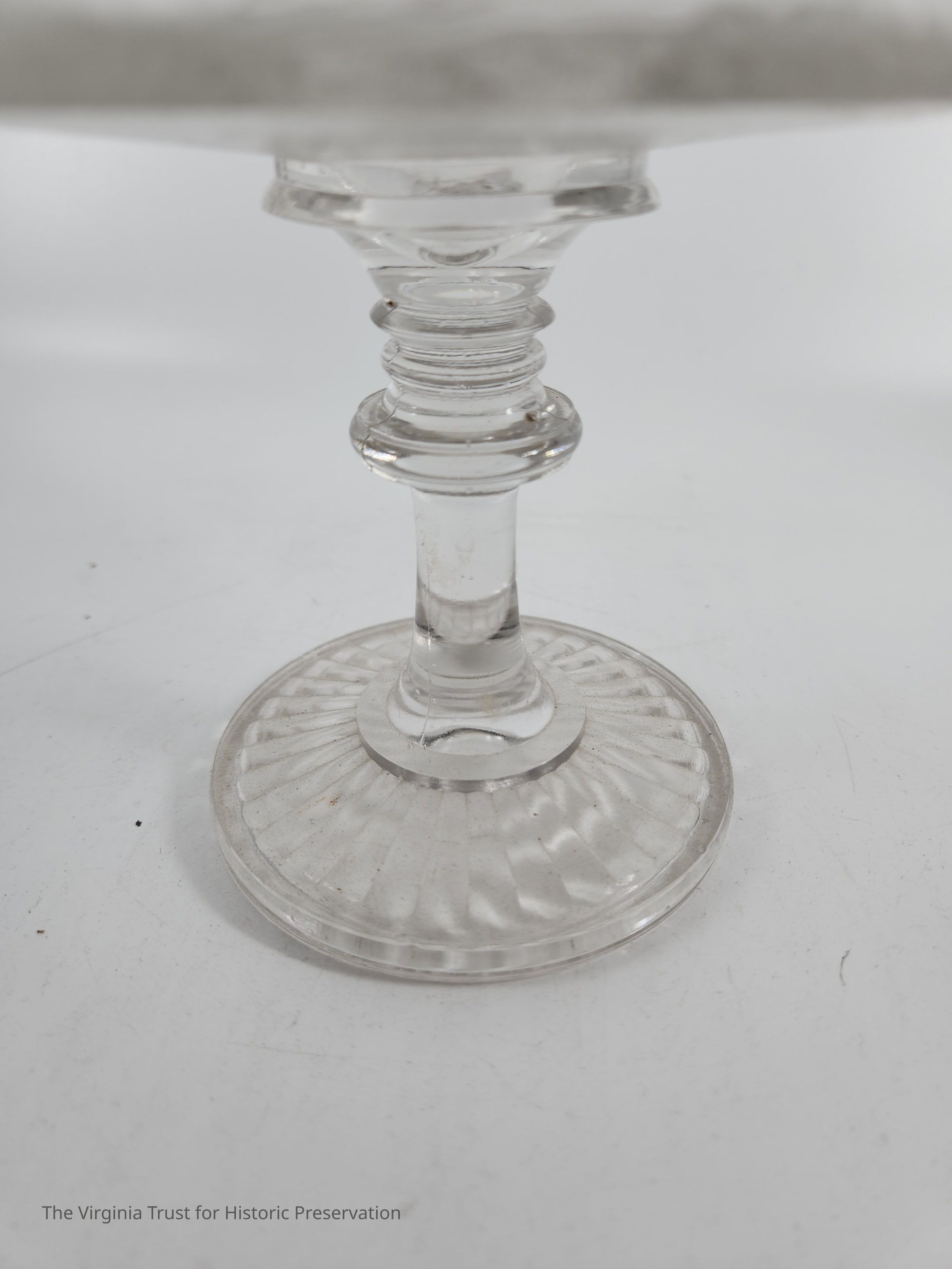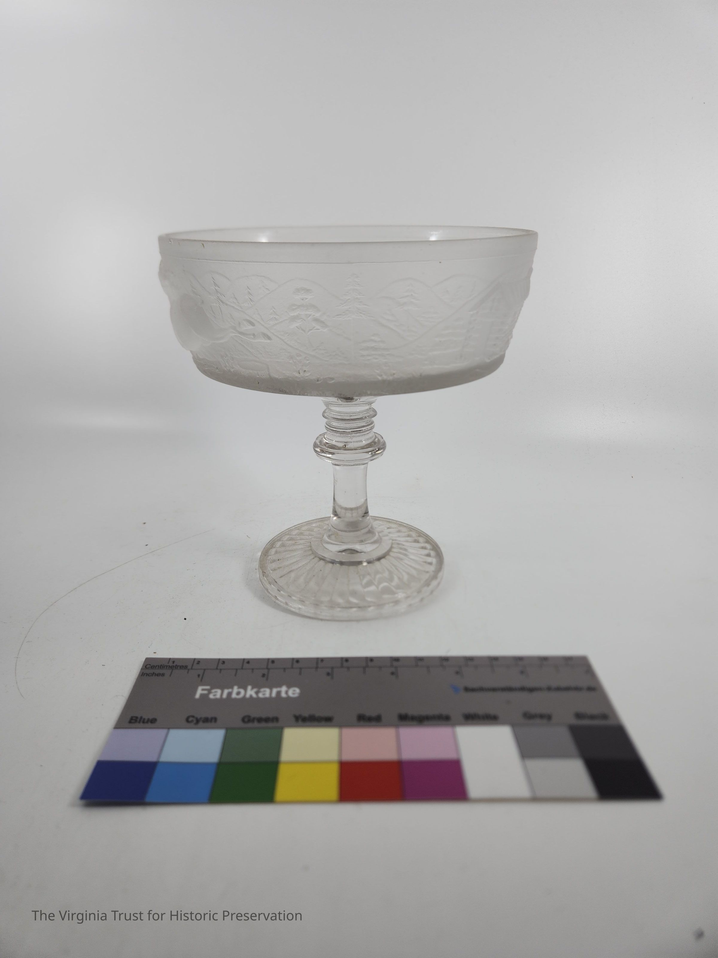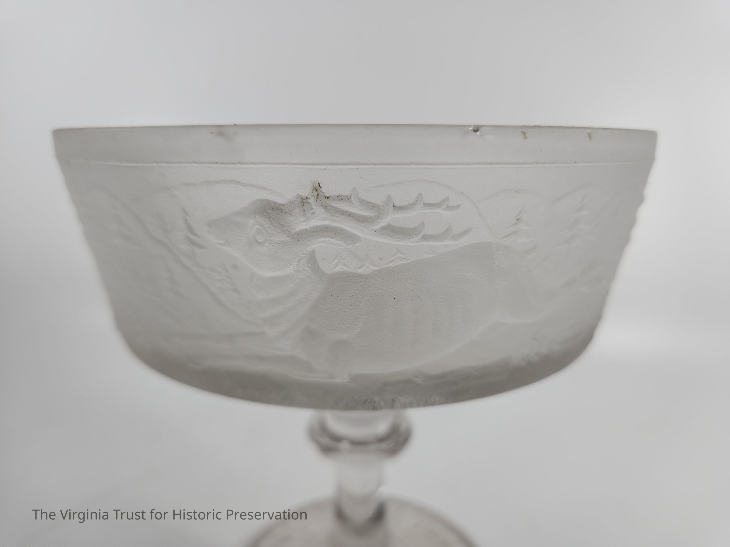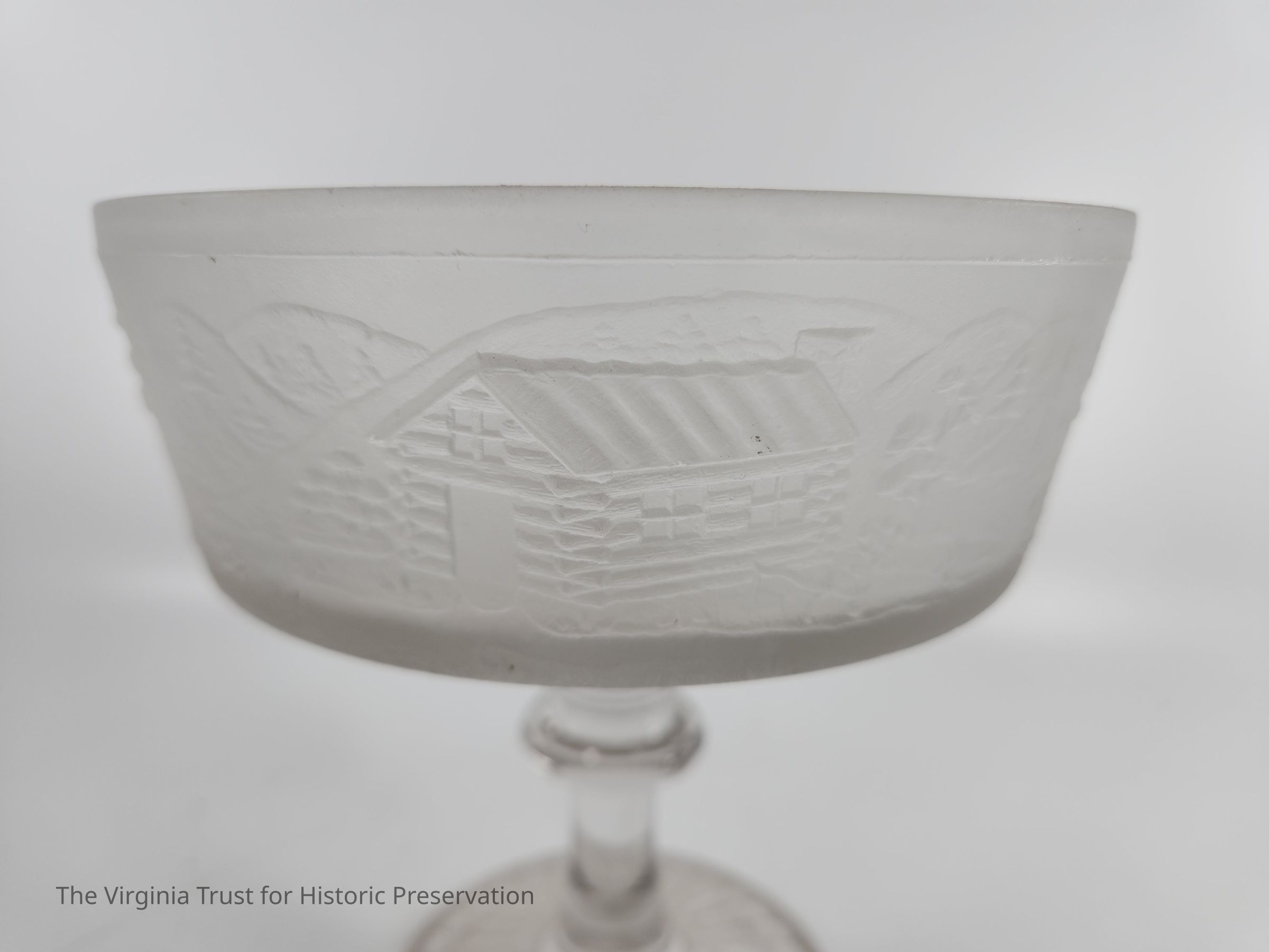 Non-flint American pressed glass high stand 6" compote in the "Westward Ho!" pattern. Clear frosted glass. Scene decorating bowl depicts deer, buffalo, and a log cabin in a wilderness background (trees, mountains).Dimensions