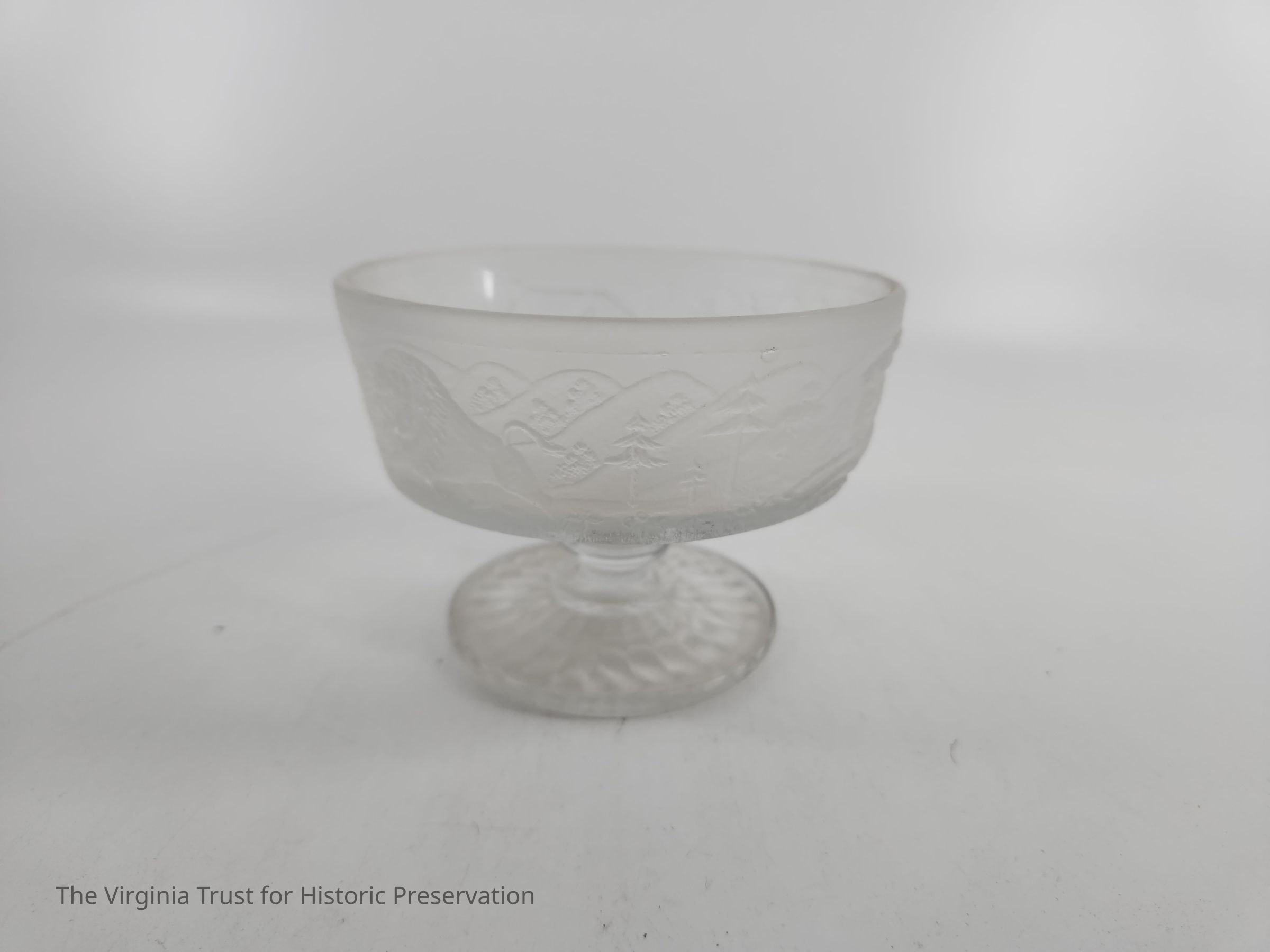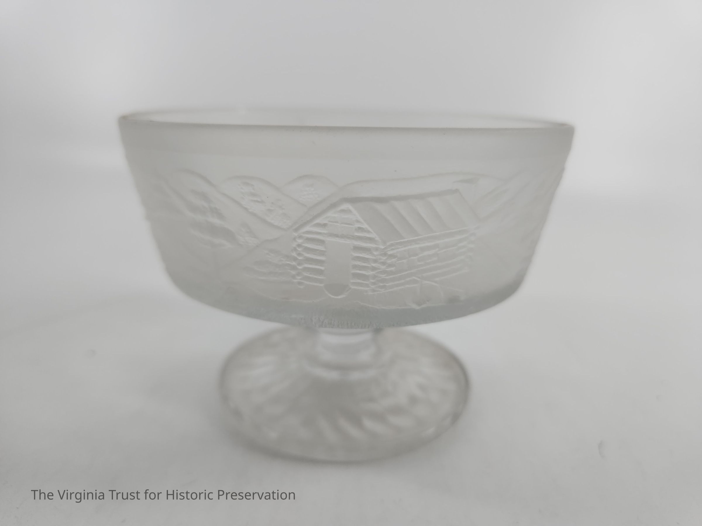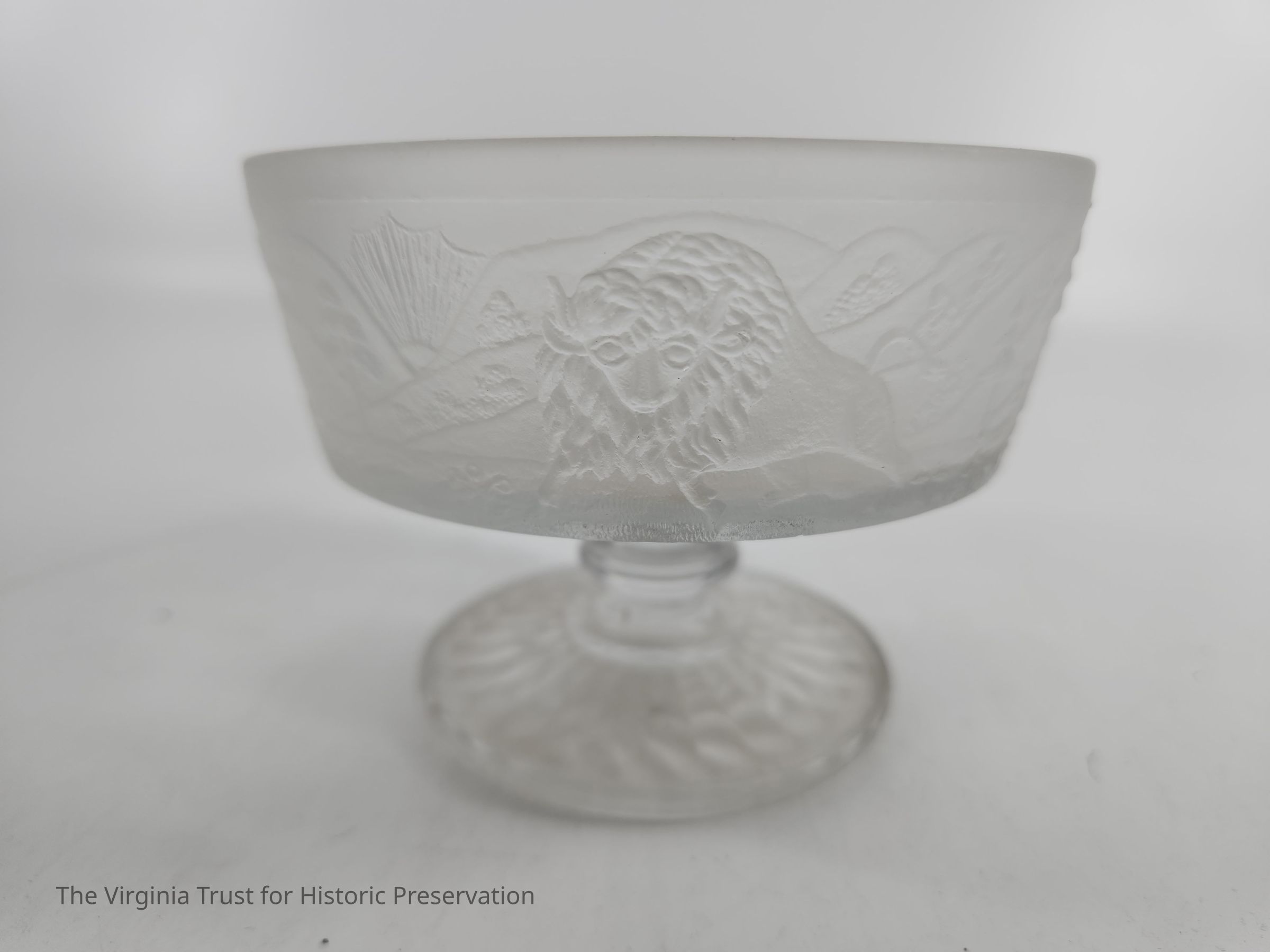 Non-flint American pressed glass stemmed custard dish in the "Westward Ho!" pattern. Clear frosted glass. Scene decorating bowl depicts deer, buffalo, and a log cabin in a wilderness background (trees, mountains).