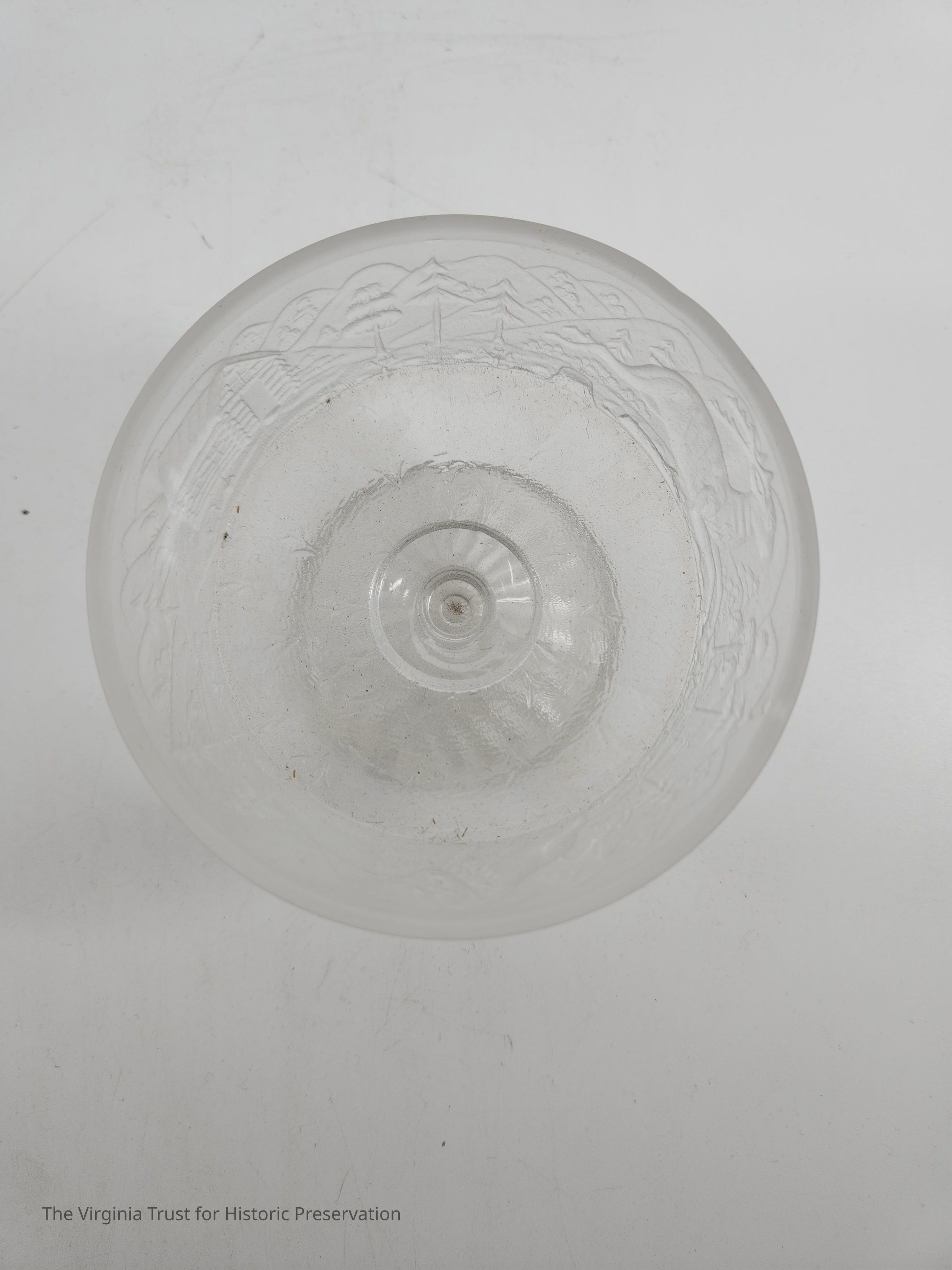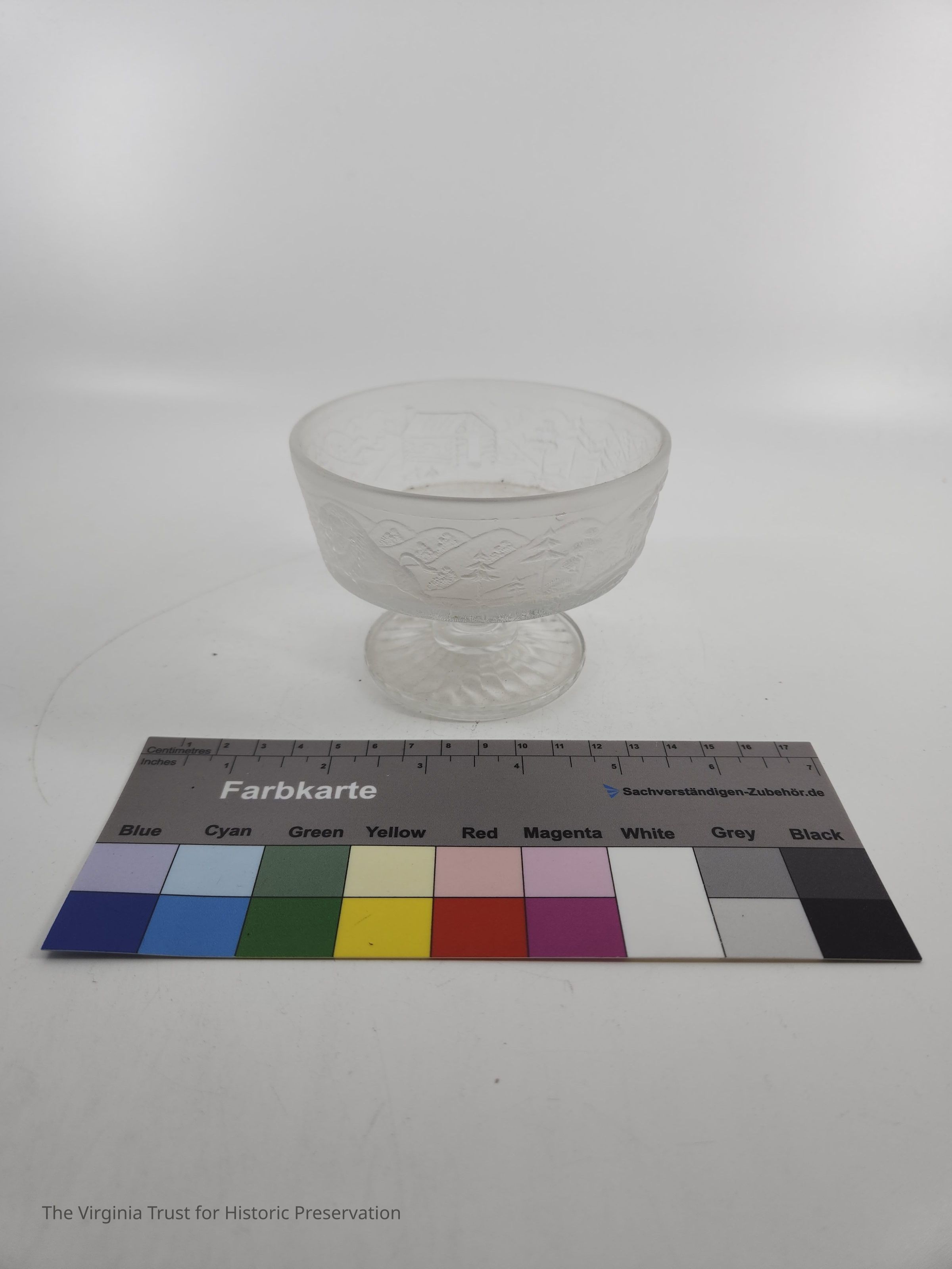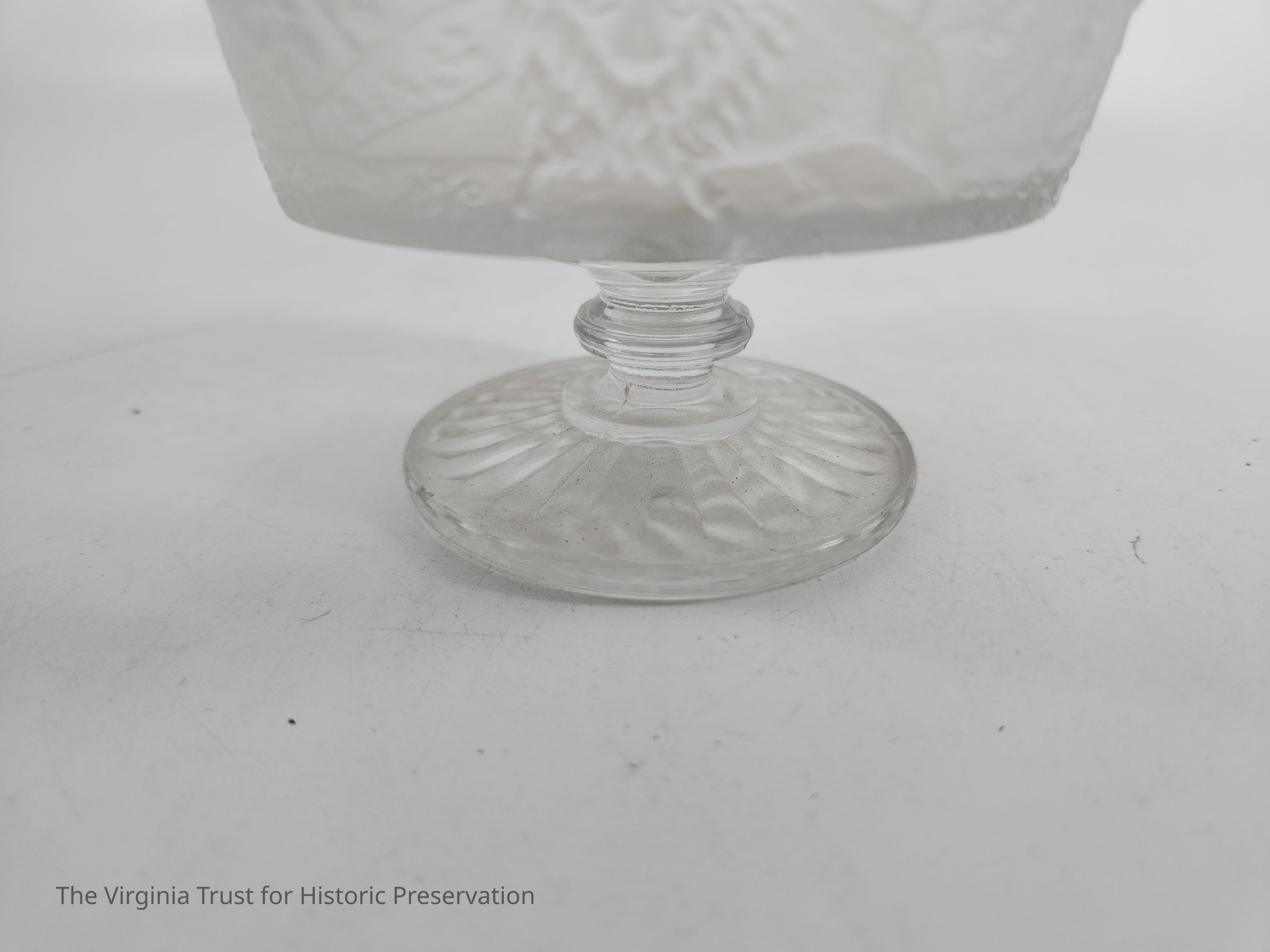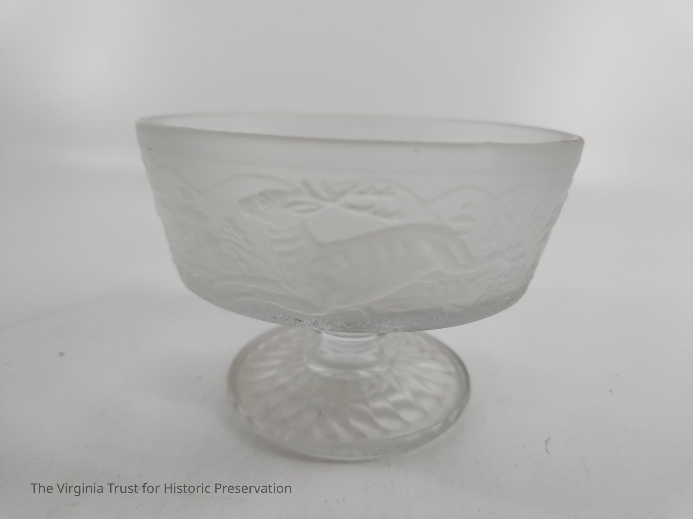 Non-flint American pressed glass stemmed custard dish in the "Westward Ho!" pattern. Clear frosted glass. Scene decorating bowl depicts deer, buffalo, and a log cabin in a wilderness background (trees, mountains).