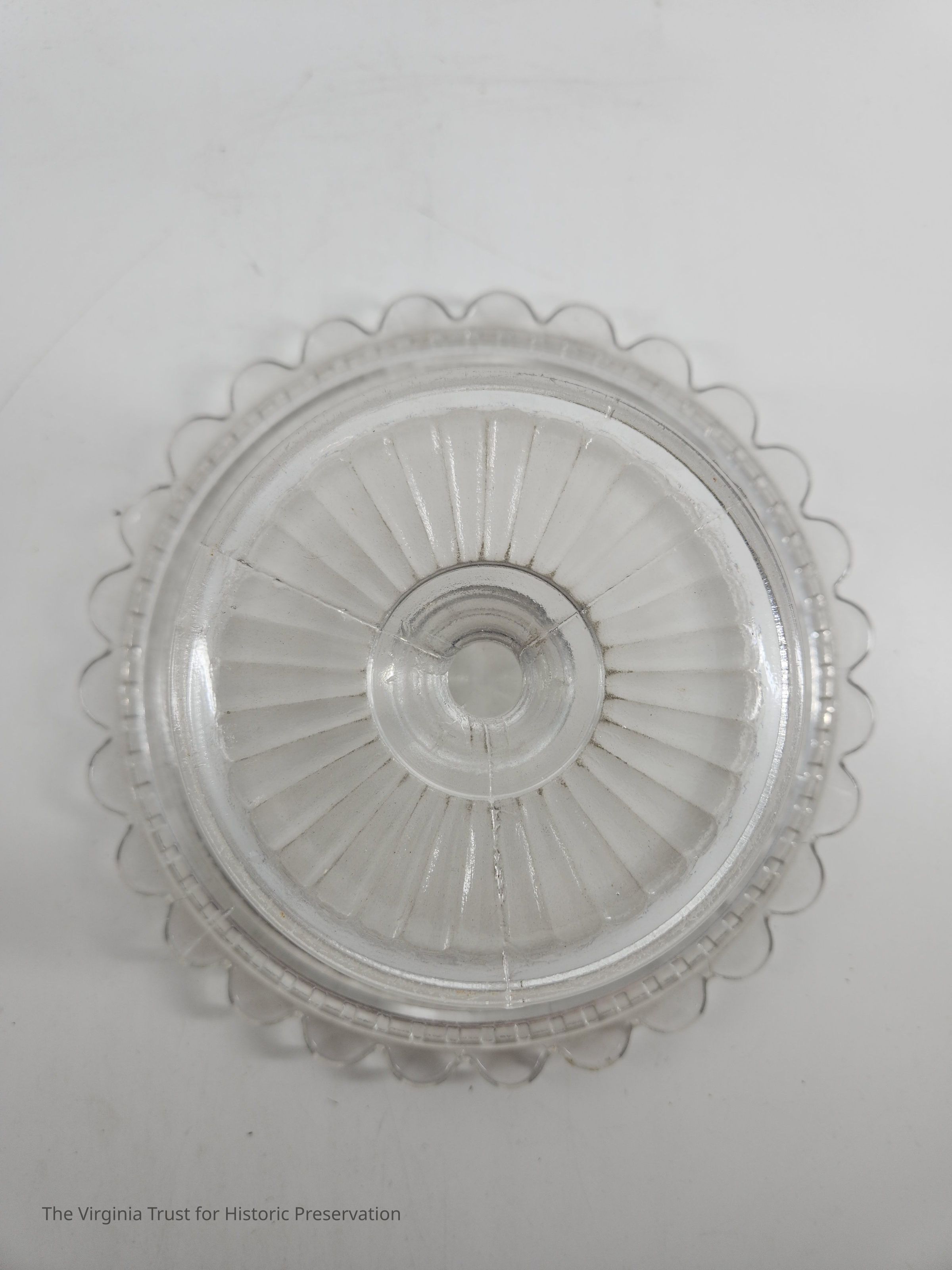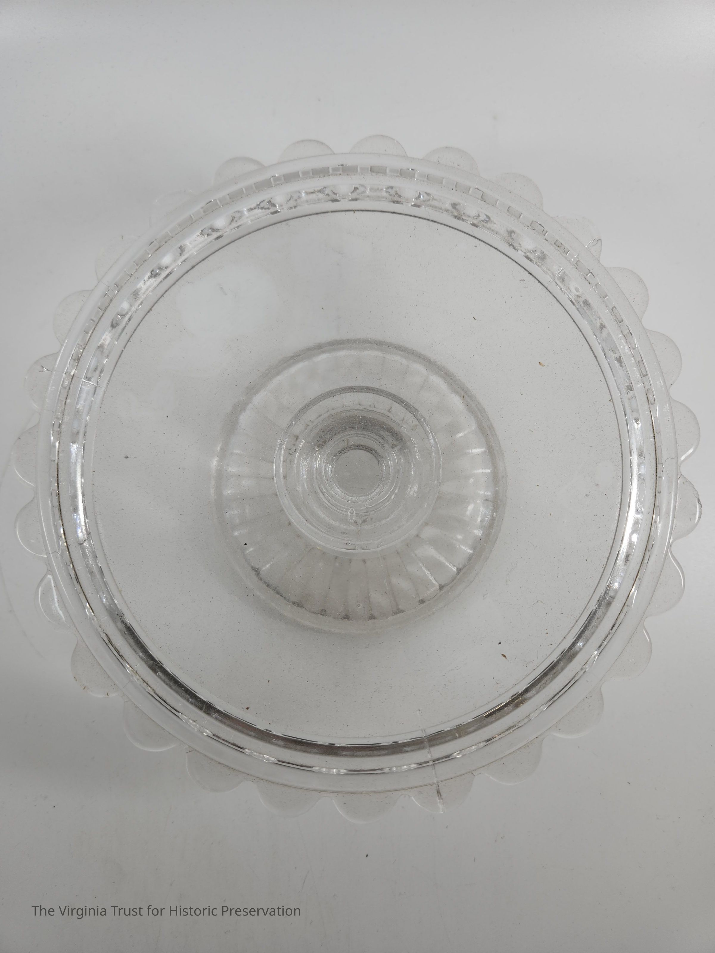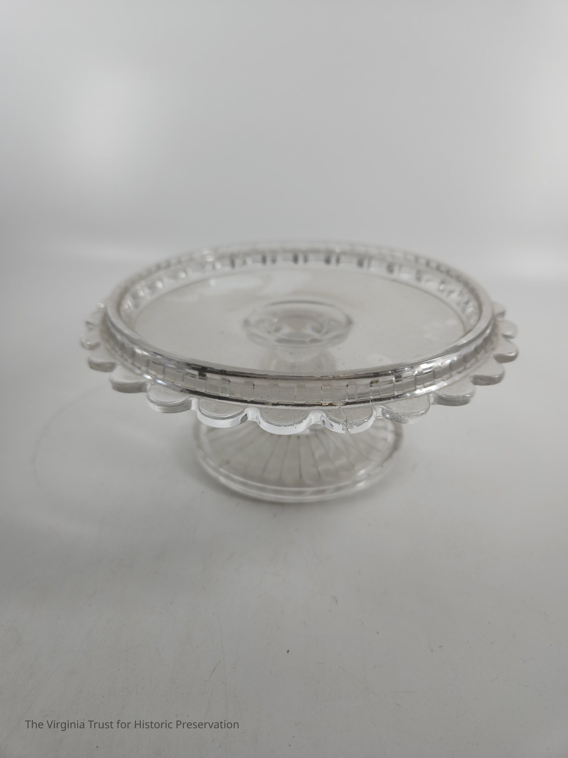 Non-flint American pressed glass footed butter stand. Clear glass. Circular foot, short stem, and wide base. Base has scalloped edge. Accompanying lid (2015.023 I).Dimensions