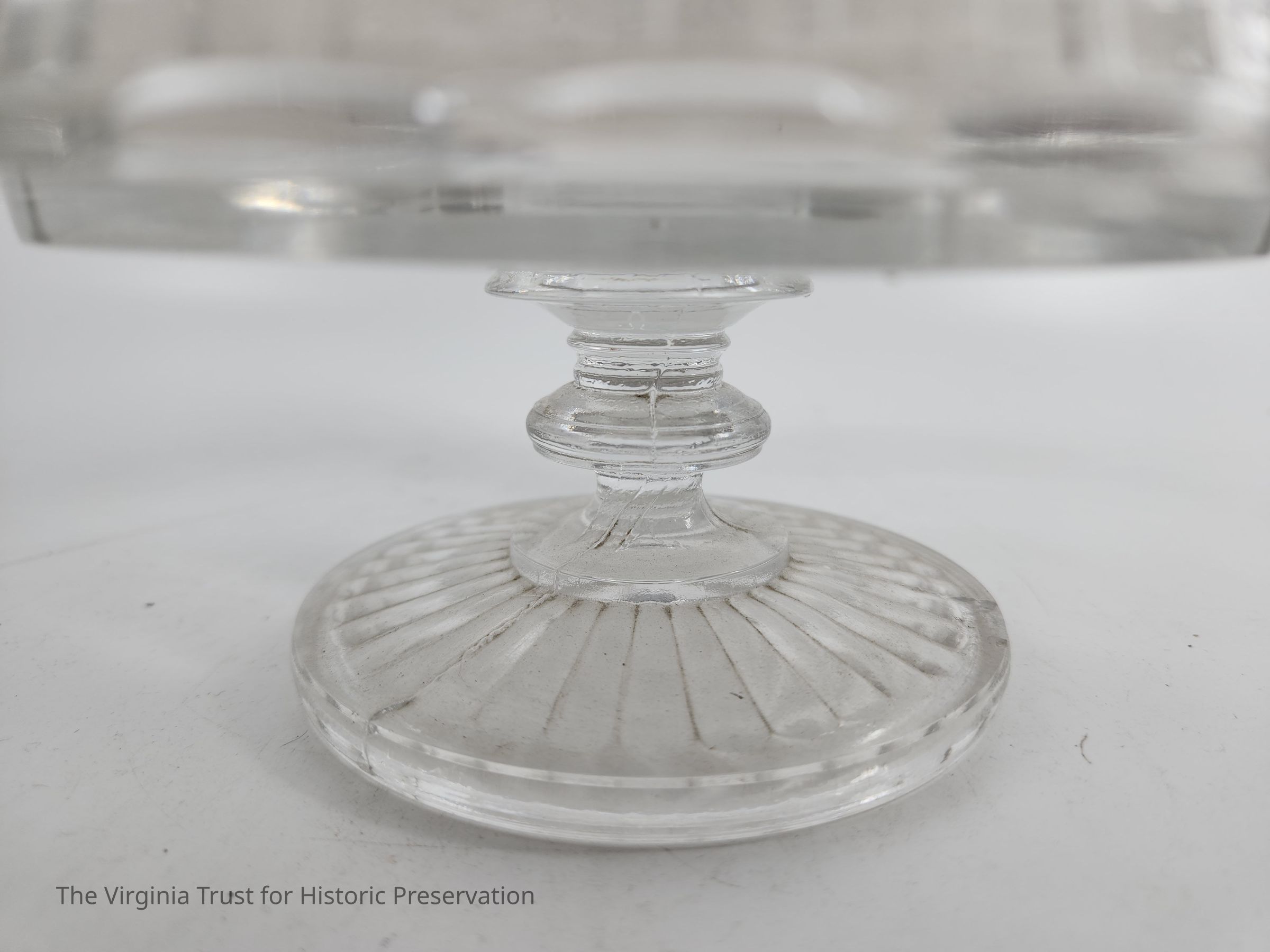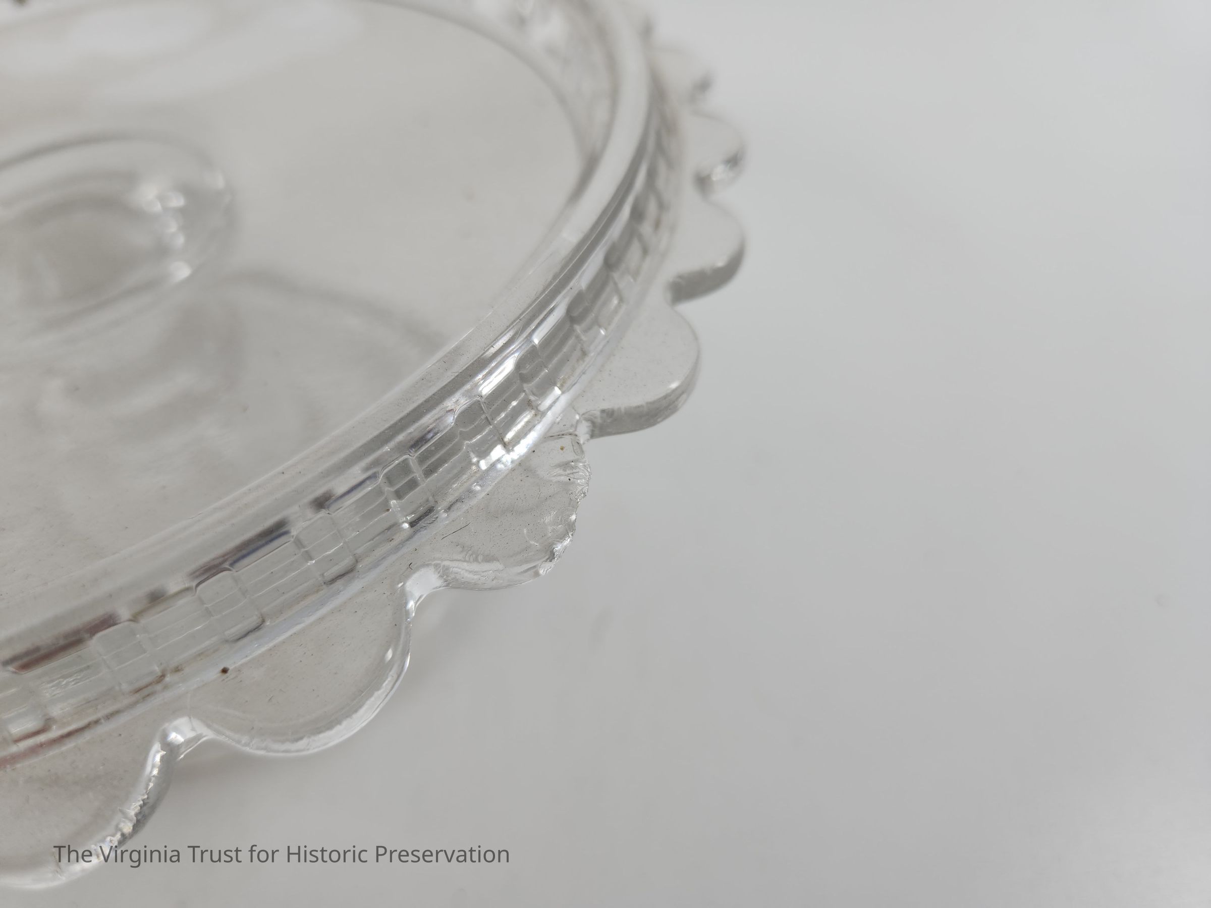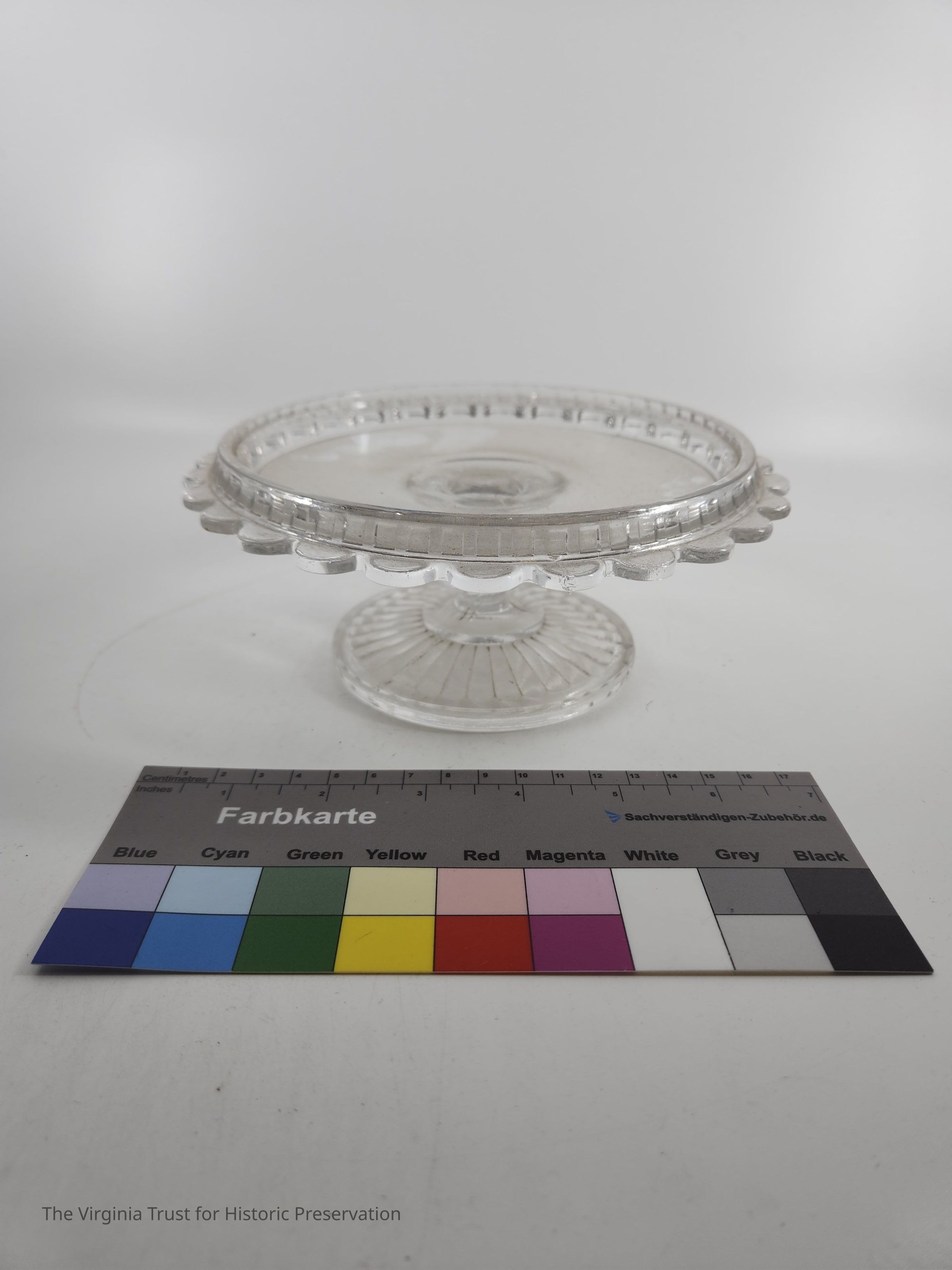 Non-flint American pressed glass footed butter stand. Clear glass. Circular foot, short stem, and wide base. Base has scalloped edge. Accompanying lid (2015.023 I).Dimensions