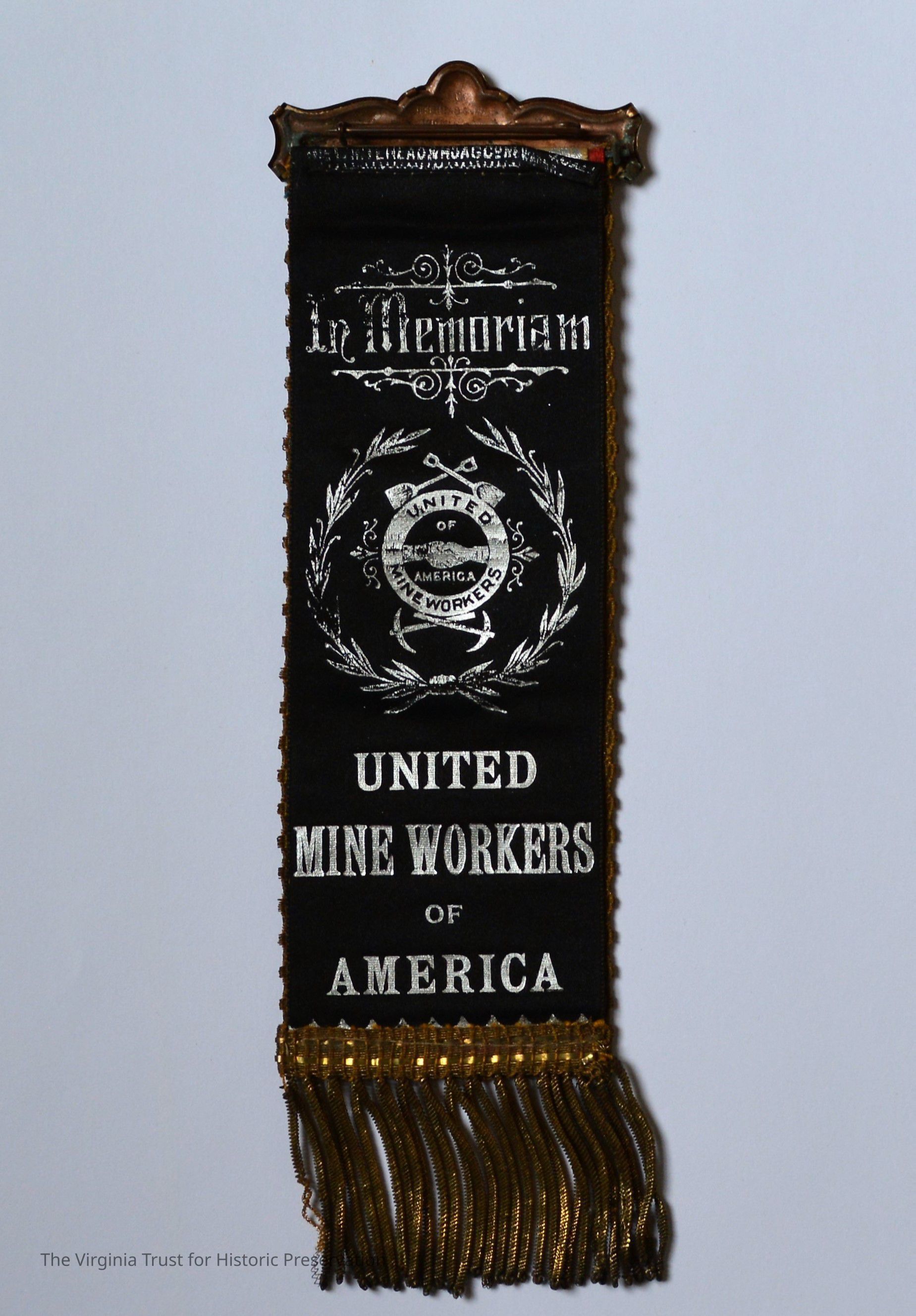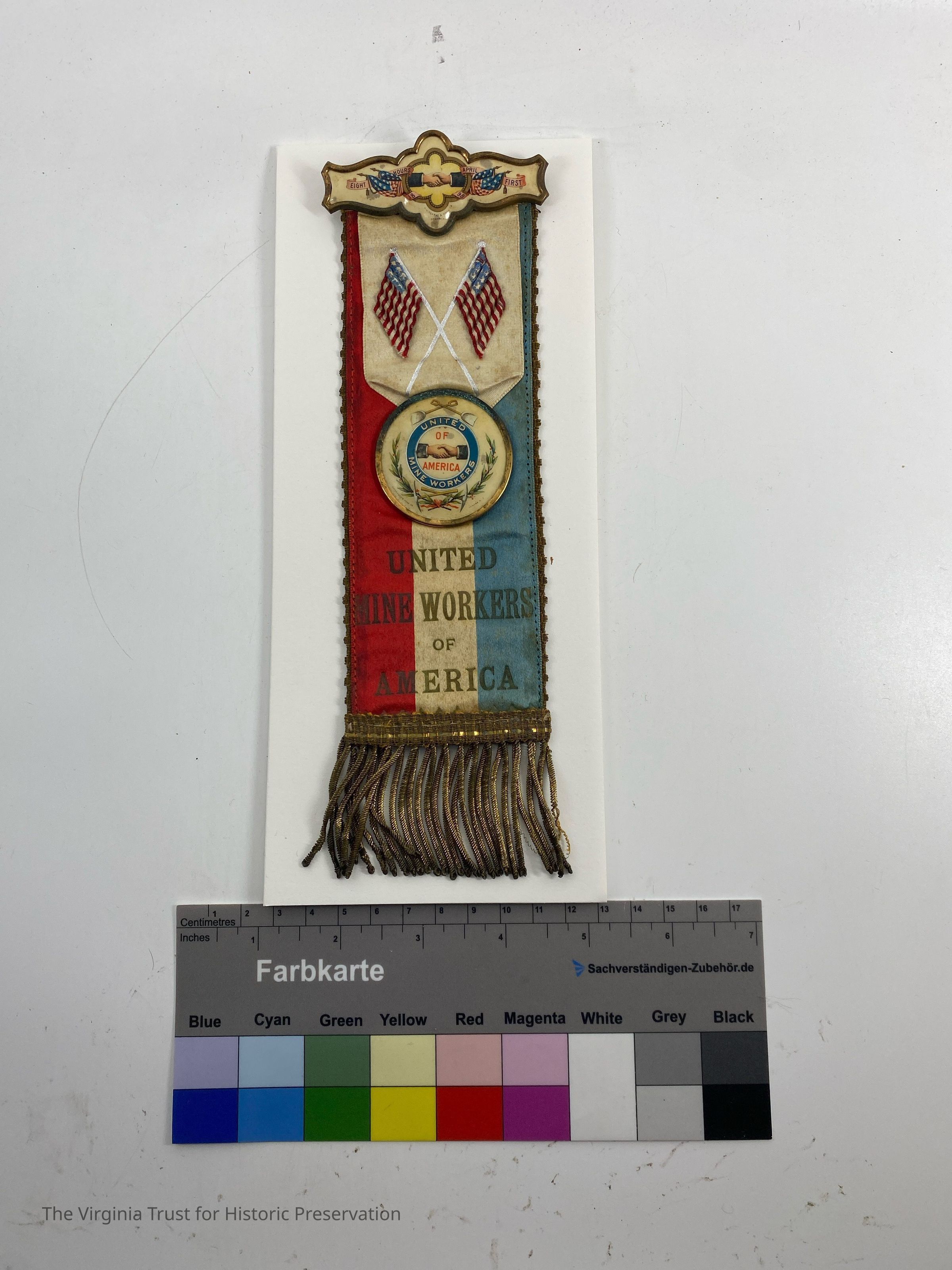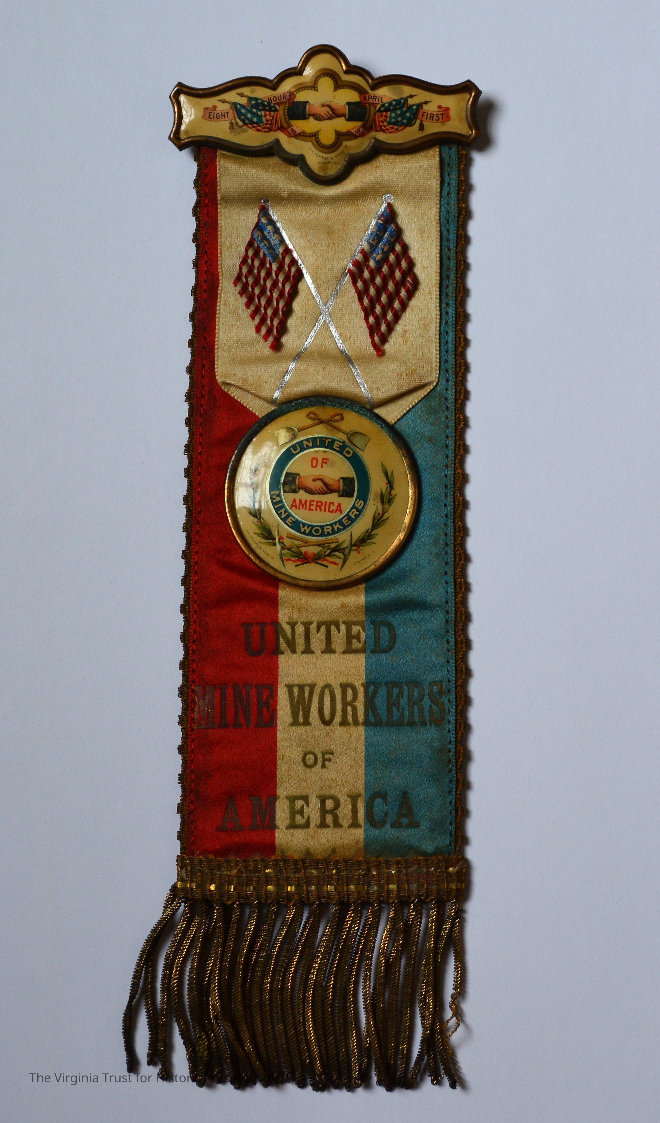 United Mine Workers of America union badge with original paper envelope. Badge commemorates the 1898 victory of an eight-hour work day for miners.Exhibition
