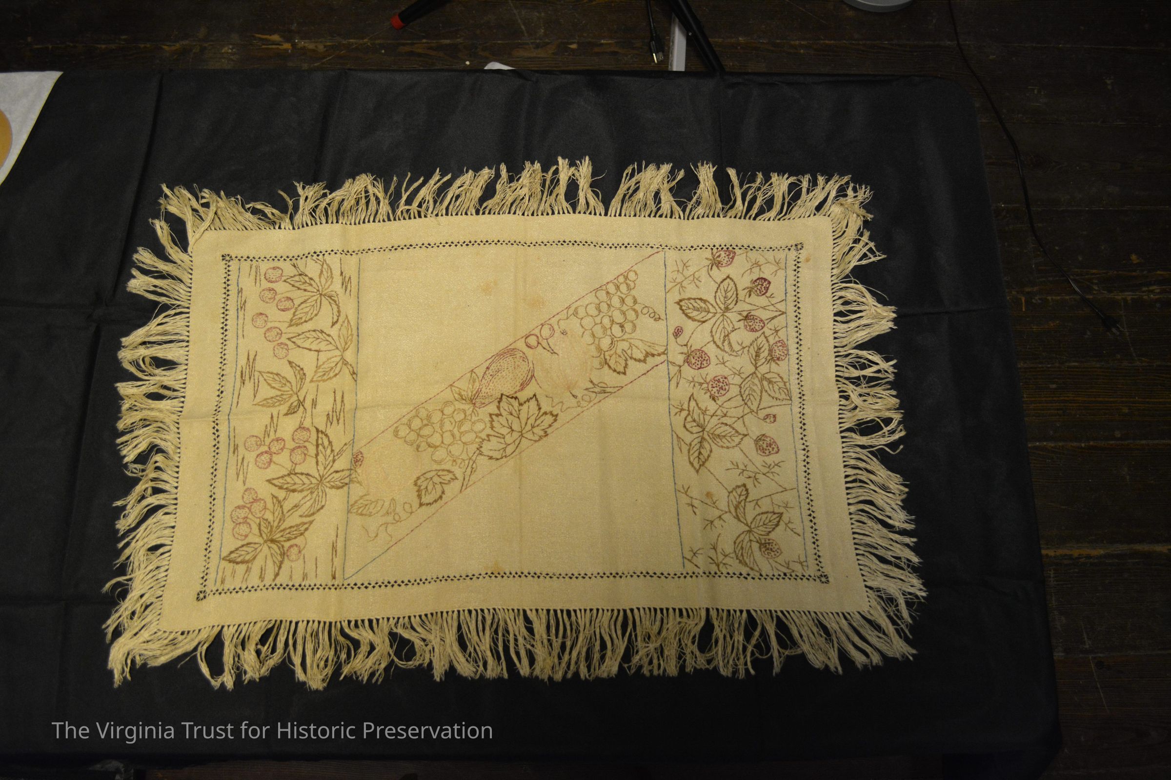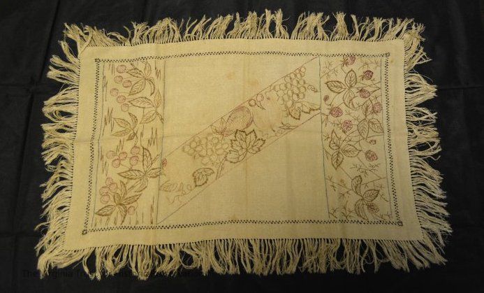 Off-white fringed fabric with hadn sewn embroidery in red, gold, brown, green.