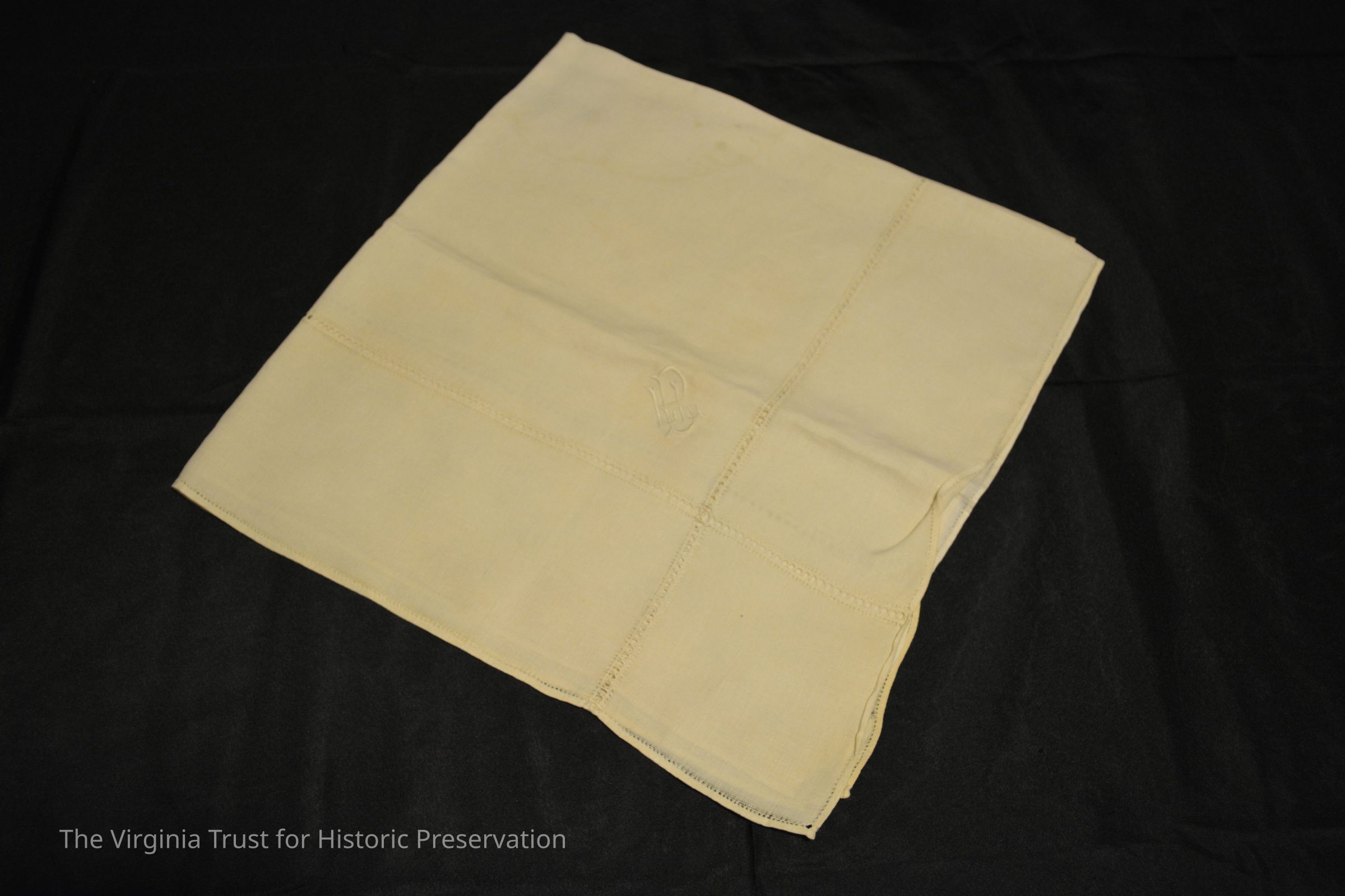 Cream colored linen shawl or cloth with embroidered initials "LBL". One small hole.