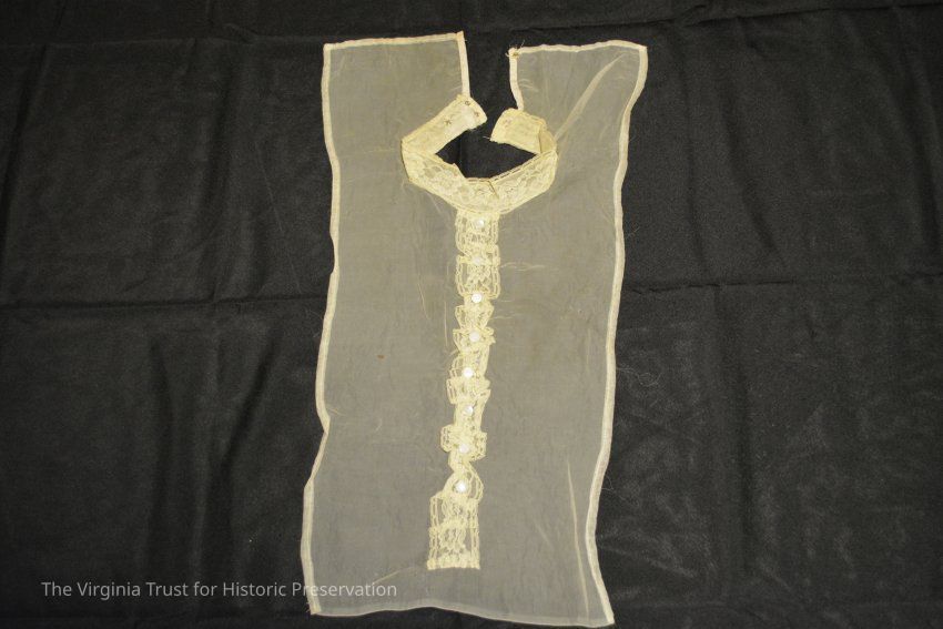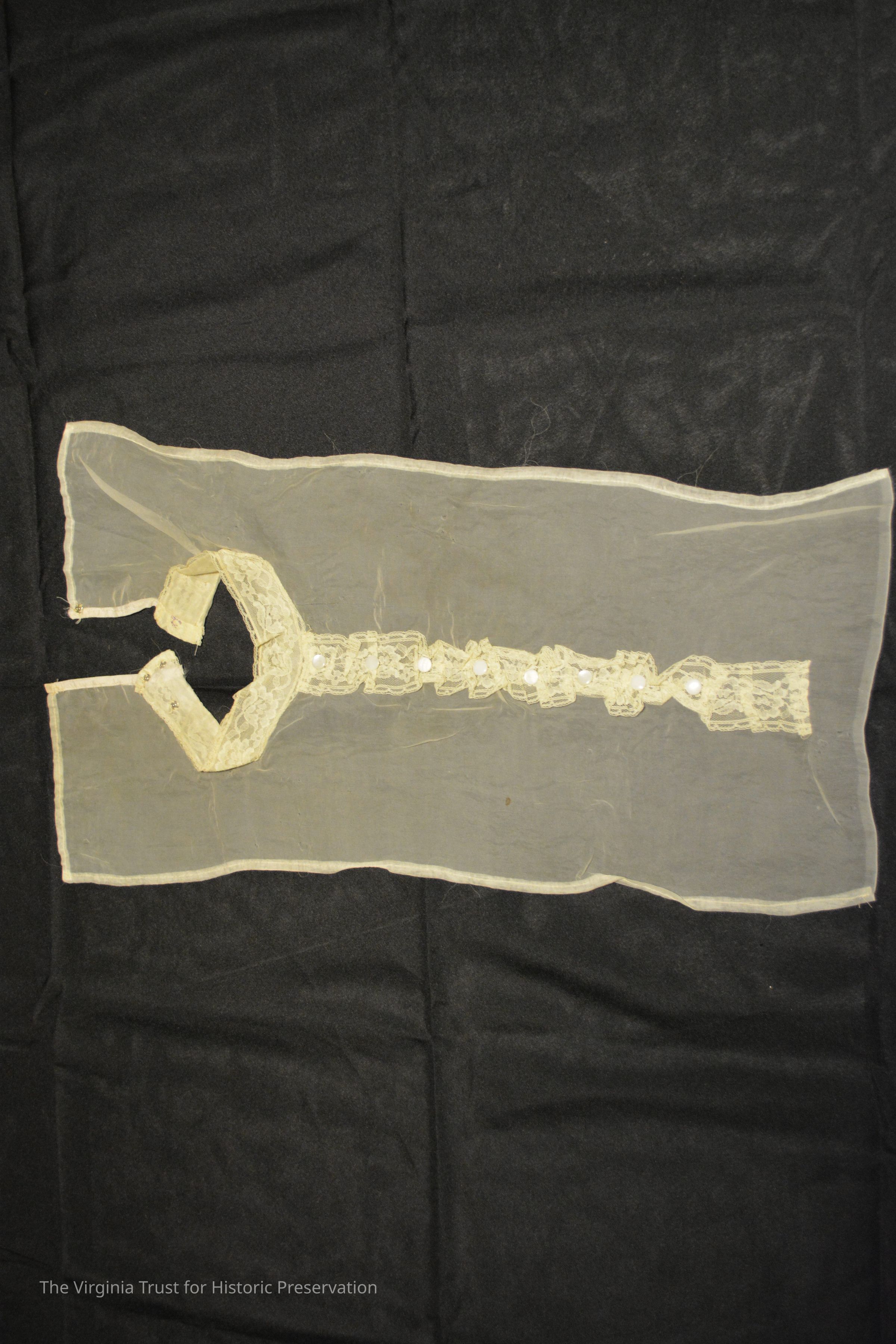 Sheer white bib/stomacher with lace detail and collar with center button trim.