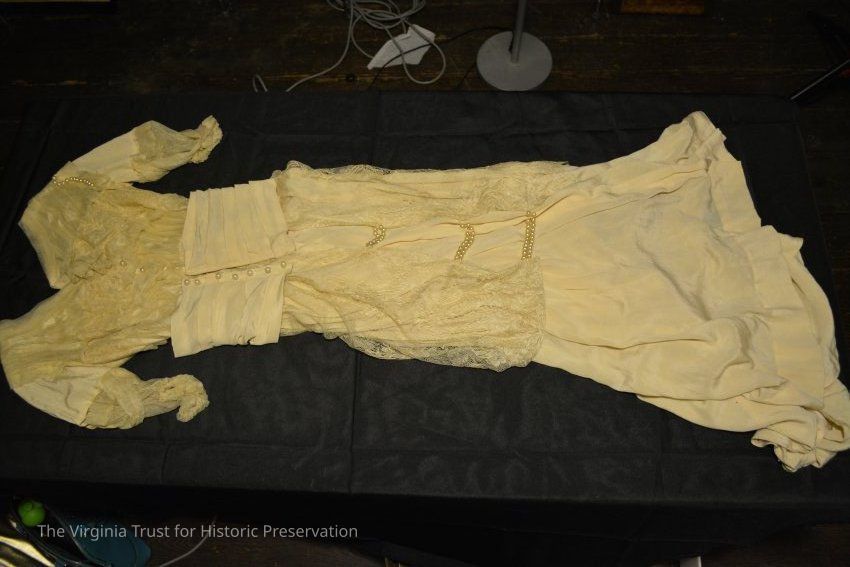 Cream colored dress with lace detail, tulle bodice, and faux pearl trim. Pearls appear to have been added at a later date. Possibly a wedding dress, c.1915.