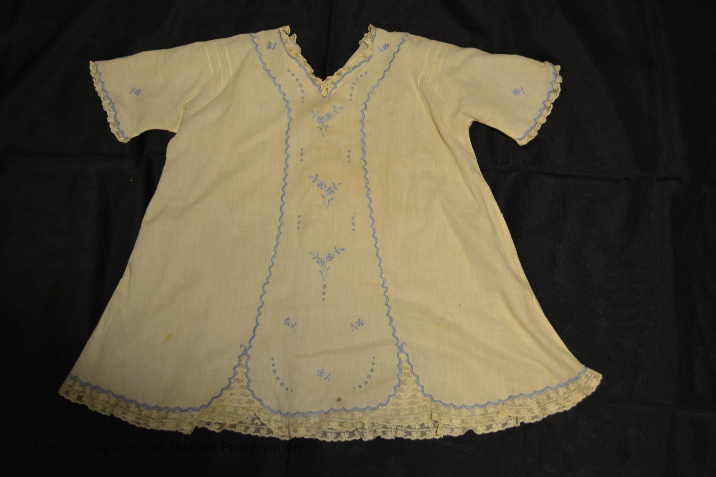 Off white cotton girl's dress with blue embroidery and lace trim. Possbly a nightgown.