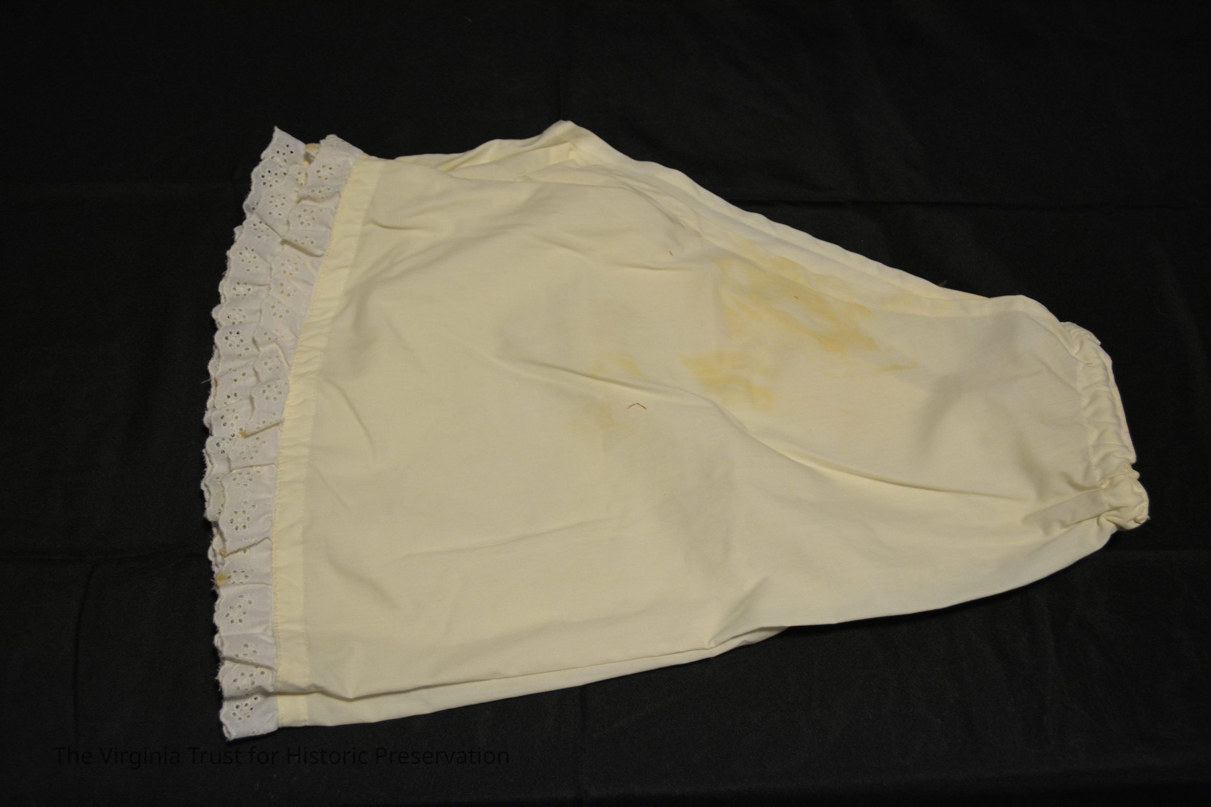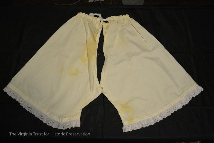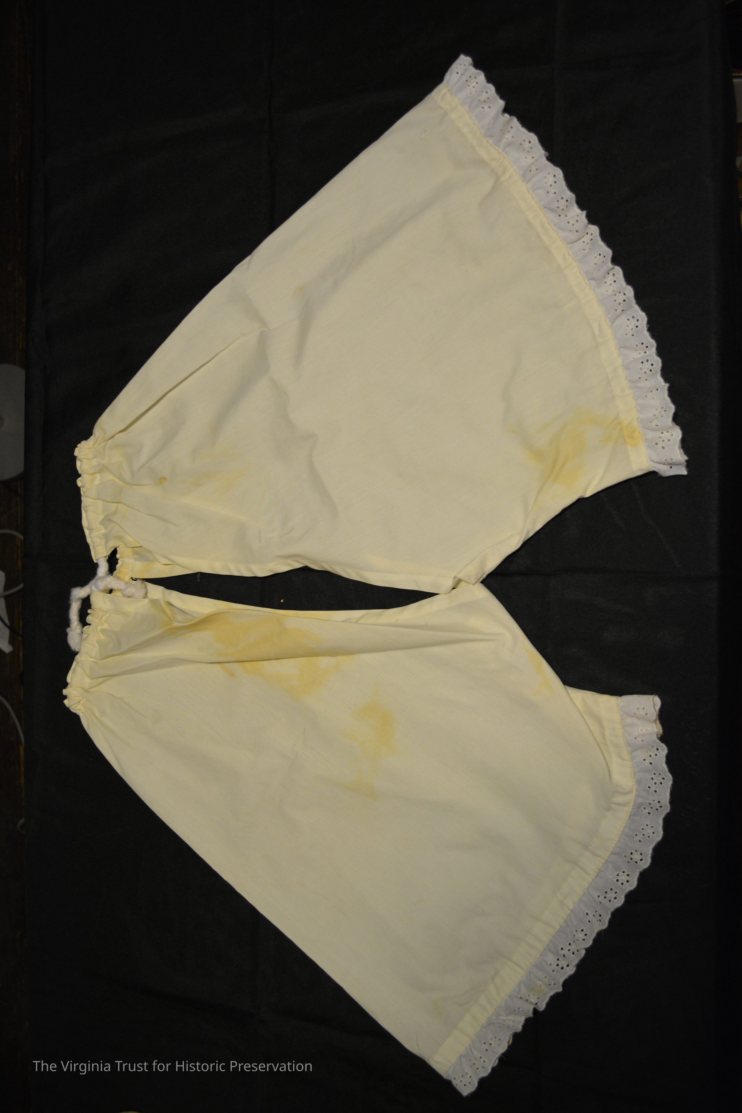 Reproduction white cotton drawers, accompanying note marks them as a reproduction.