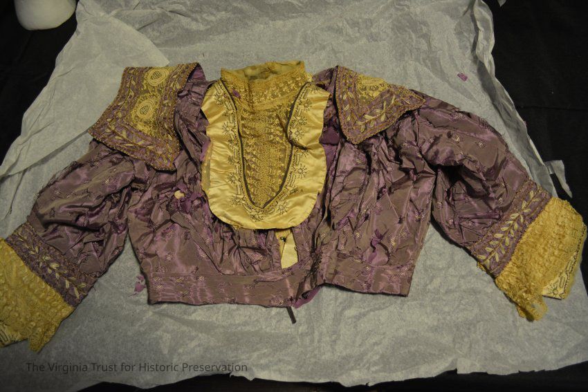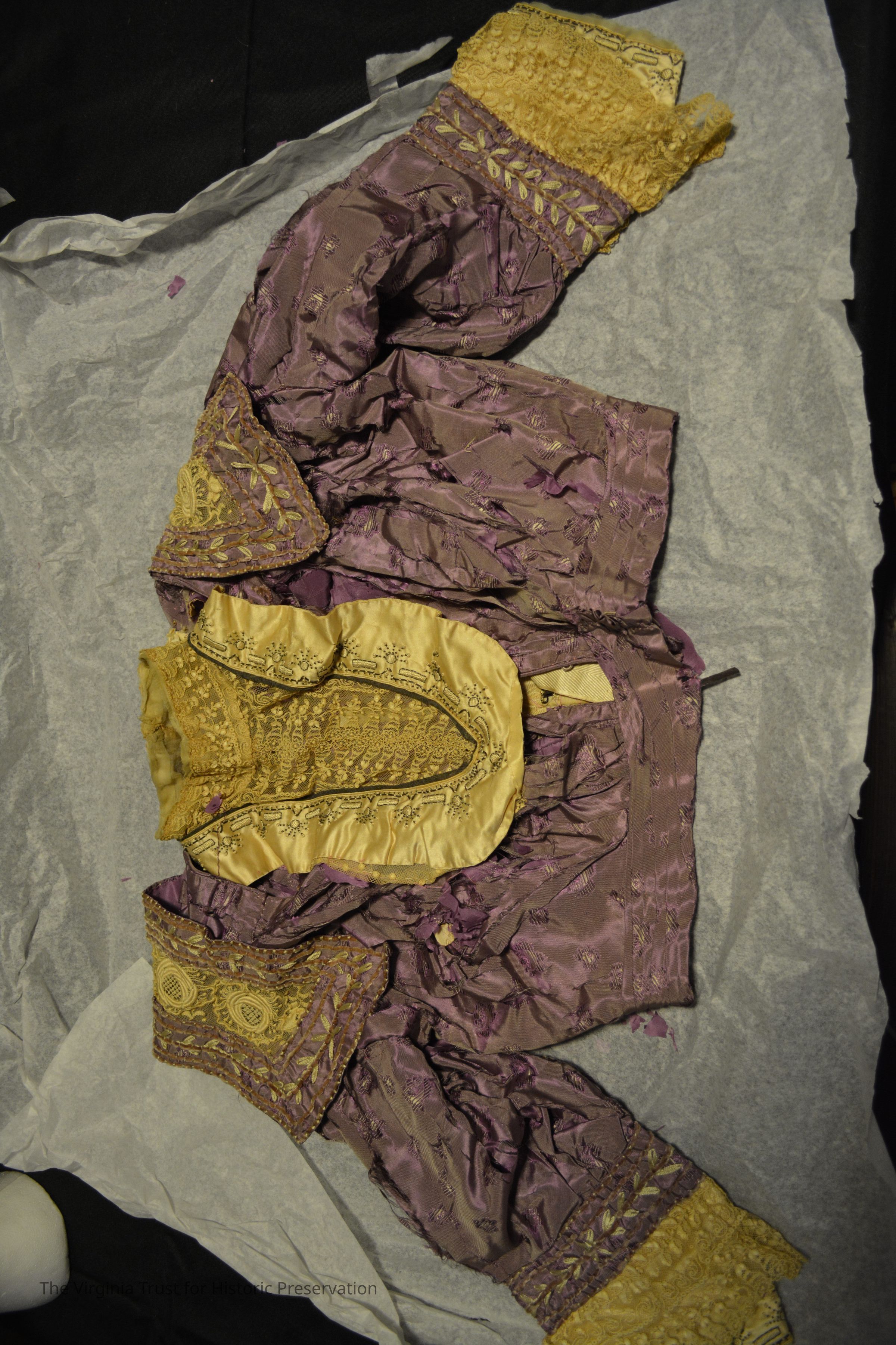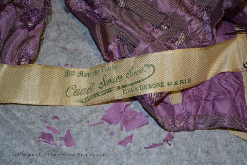 Lavender silk bodice from Paris with matching skirt (2017.004.046). Completely shattered beyond repair. Label reads "Monsieur Henriette Tissier, Cauet Soeurs Succrs, Robes & Manteaux, 17 Rue de Rome, Paris"
