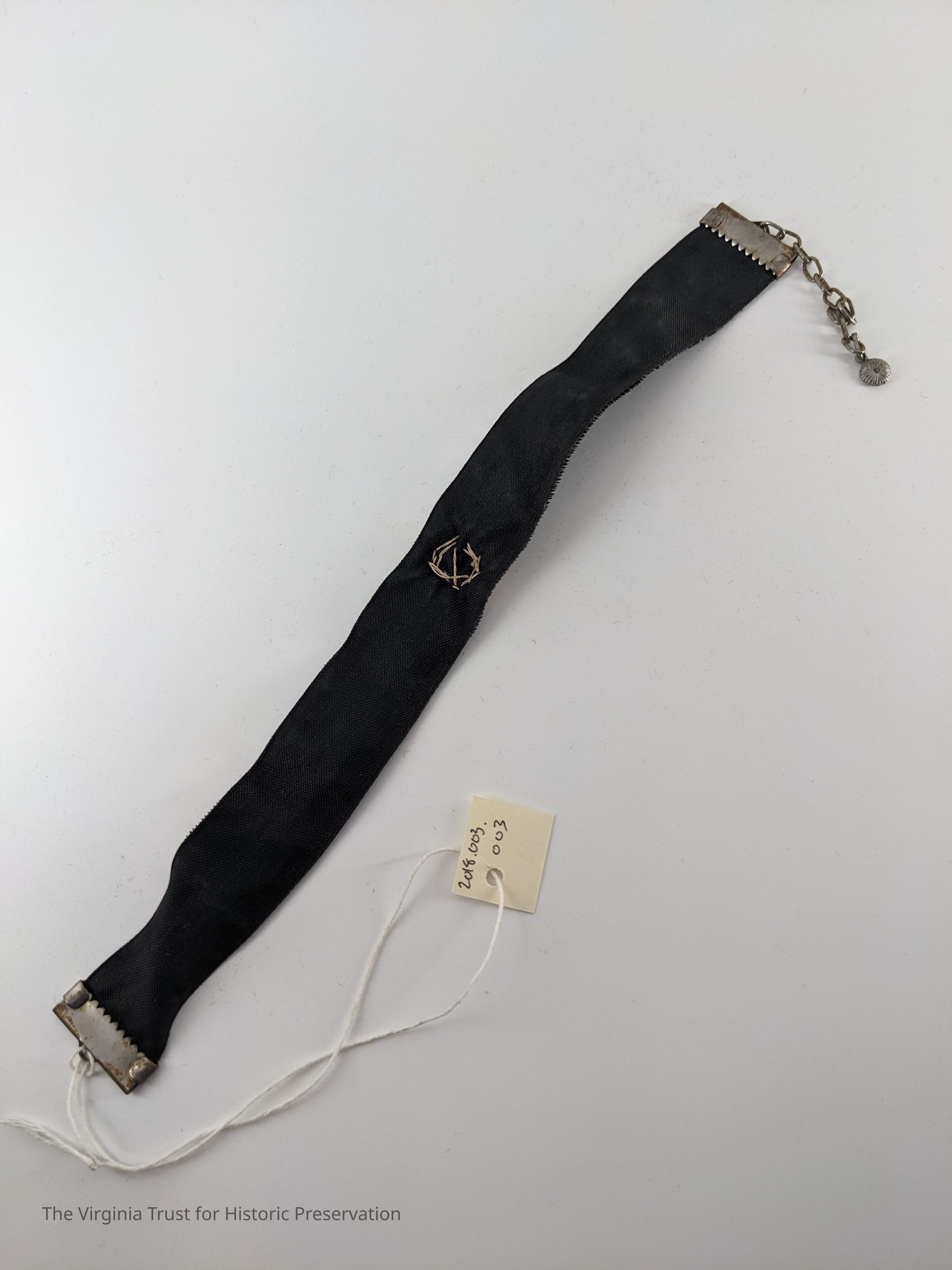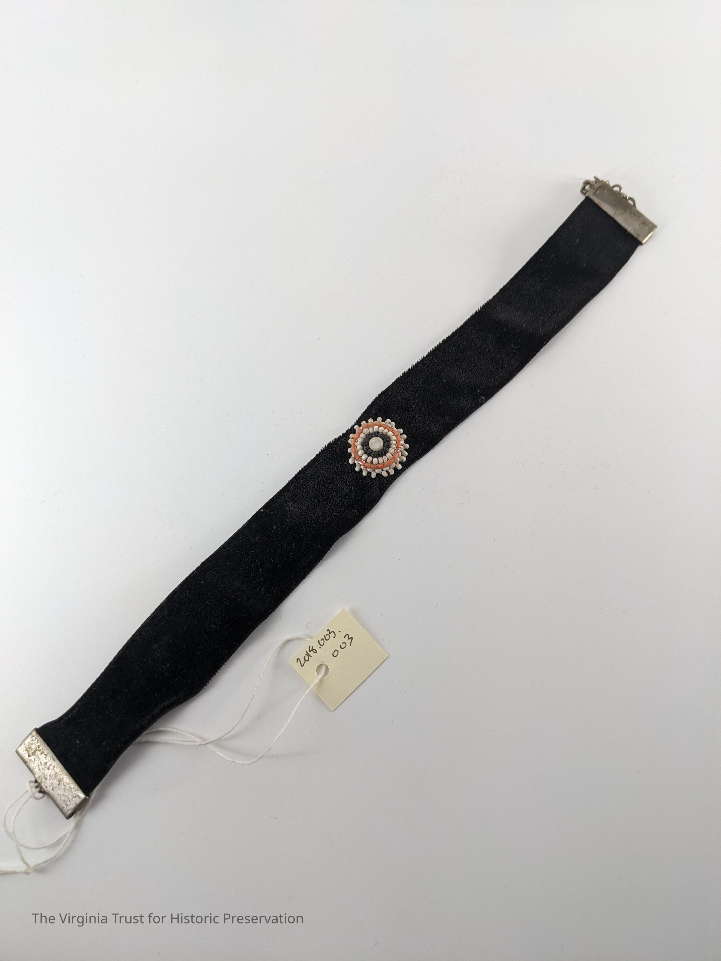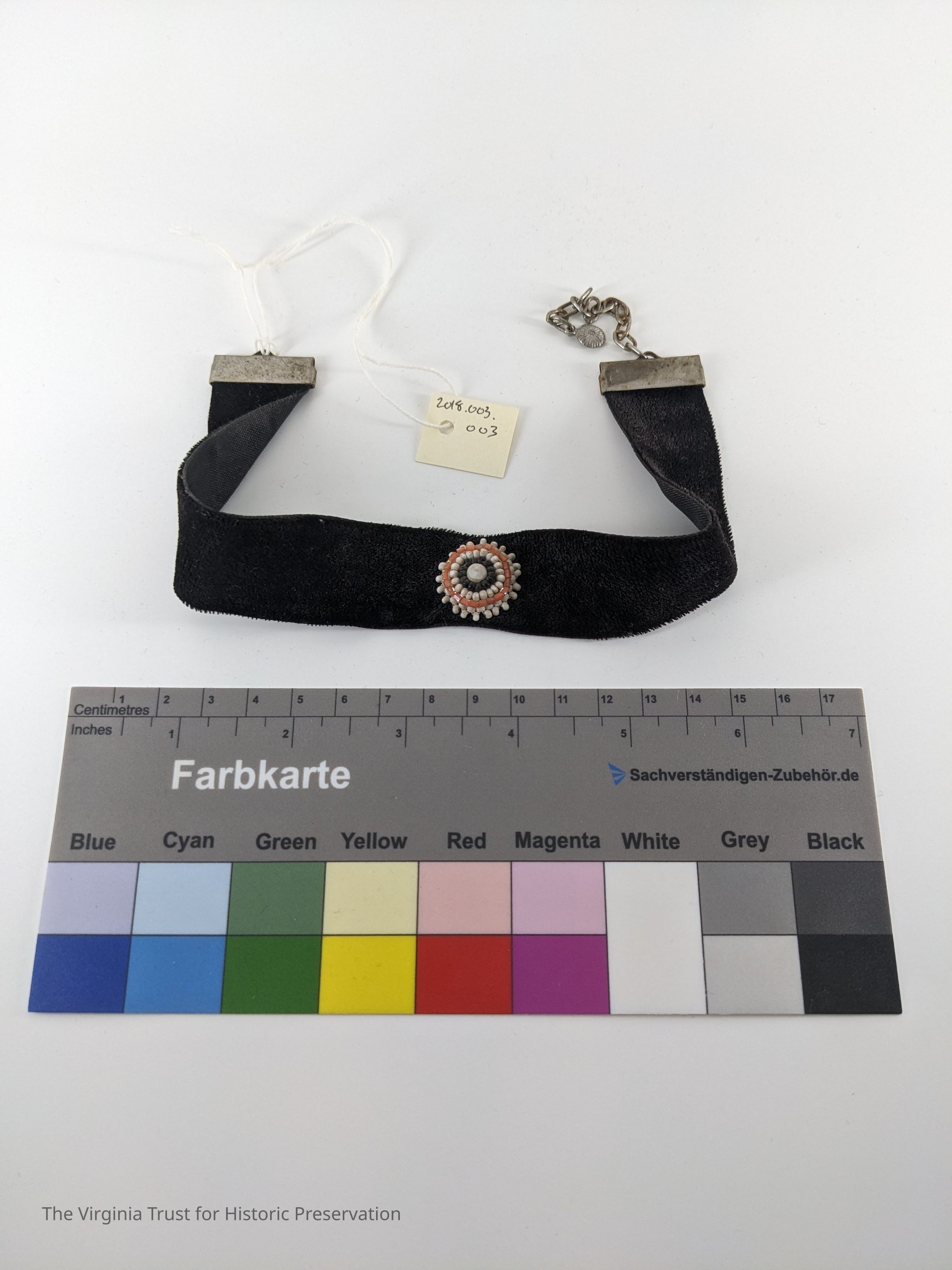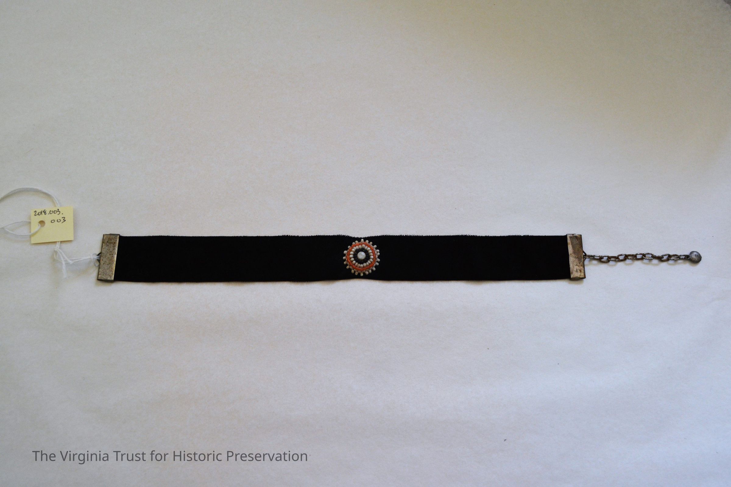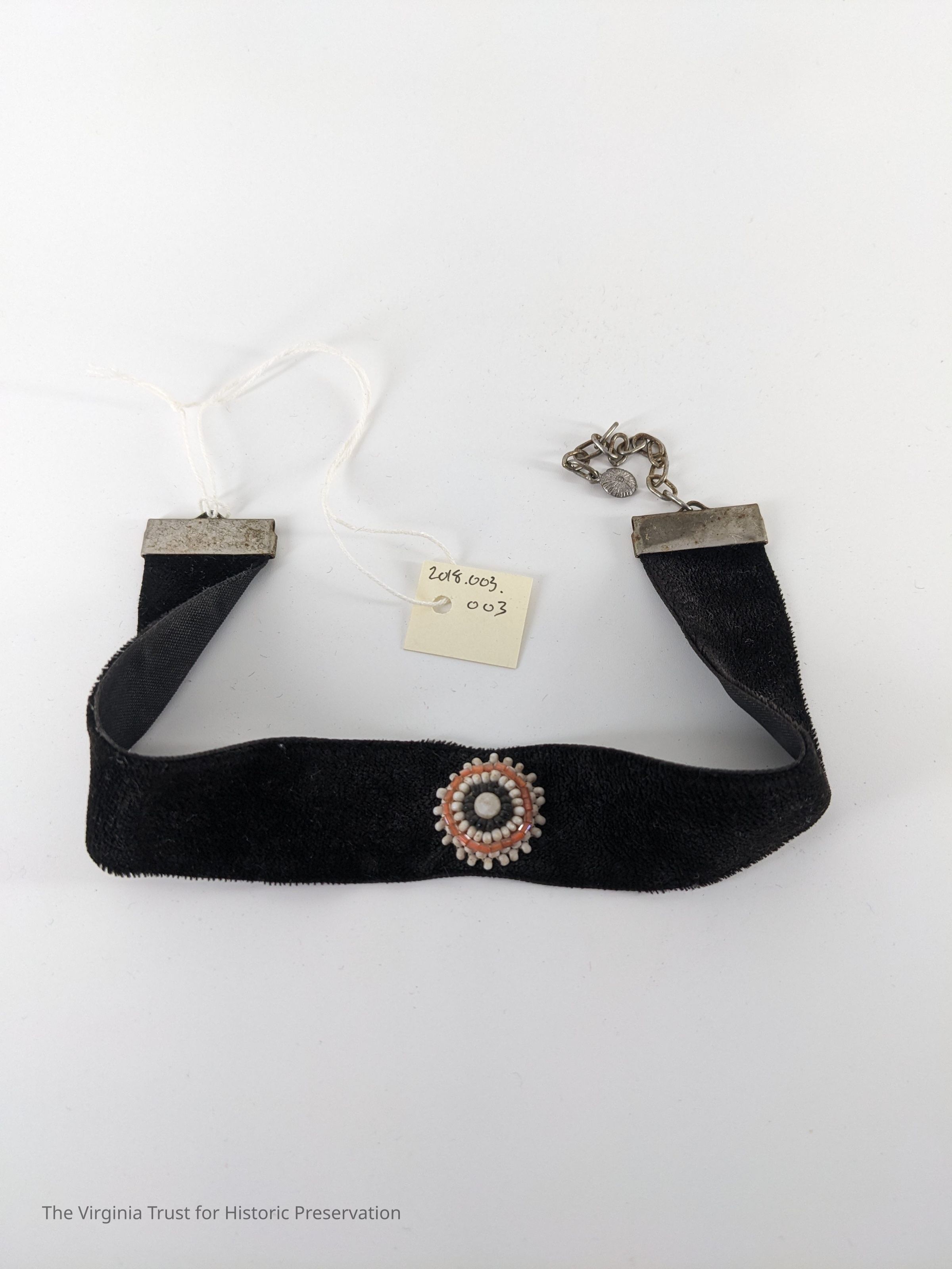 Black velvet choker with black, orange, and white center beads and metal clasps.