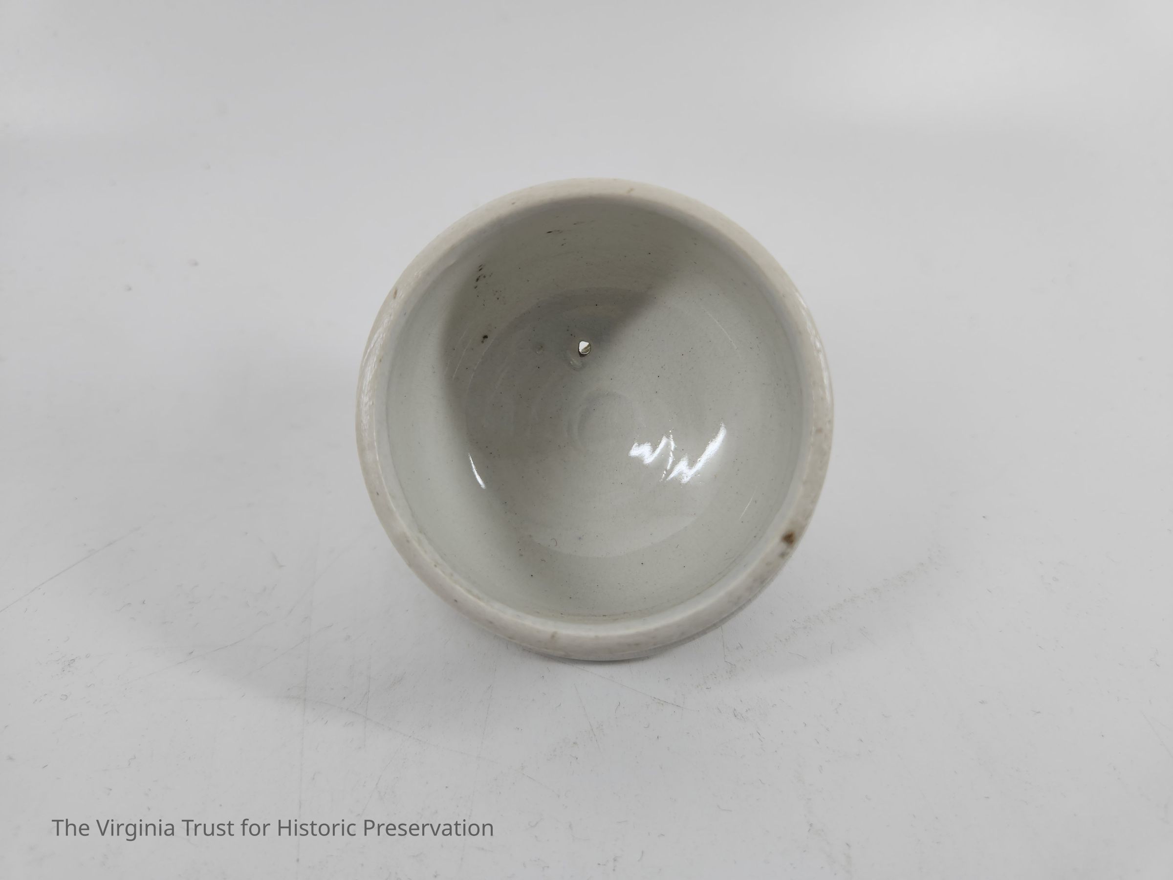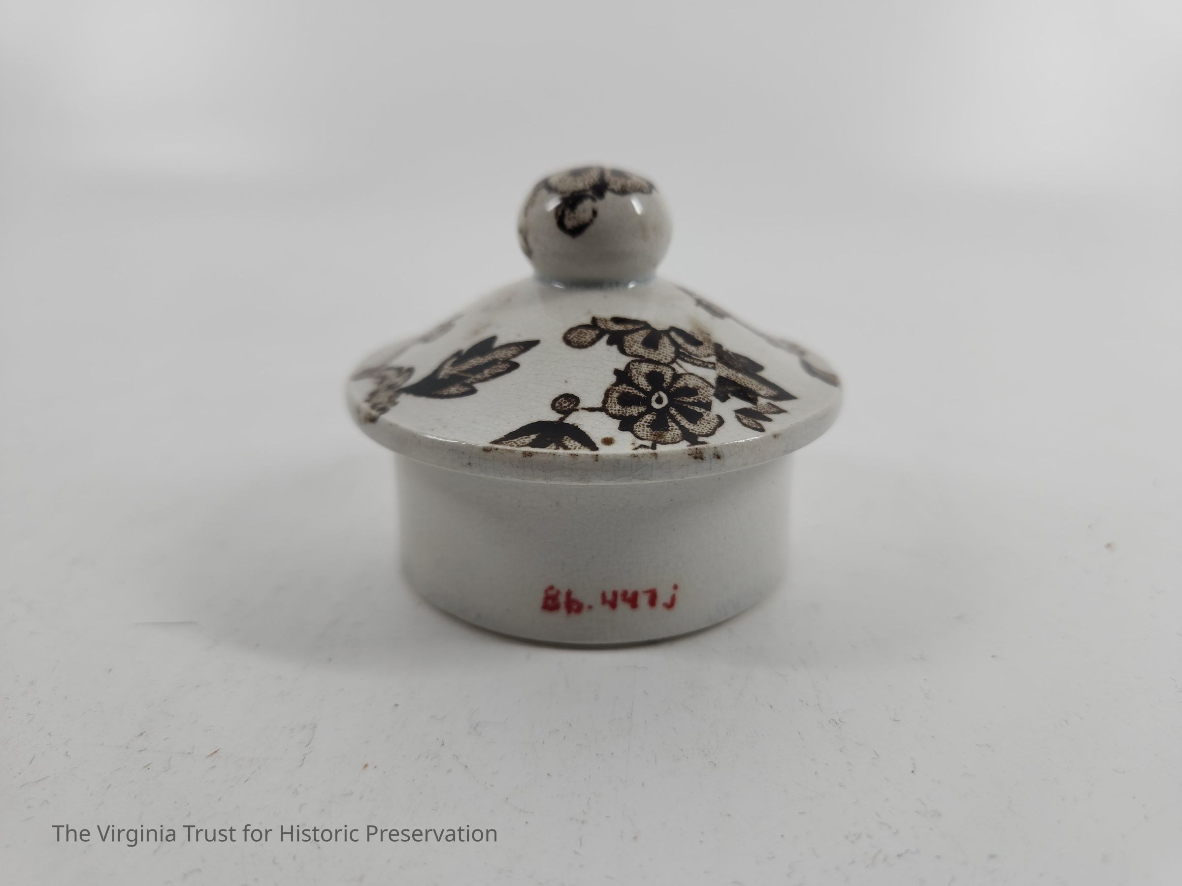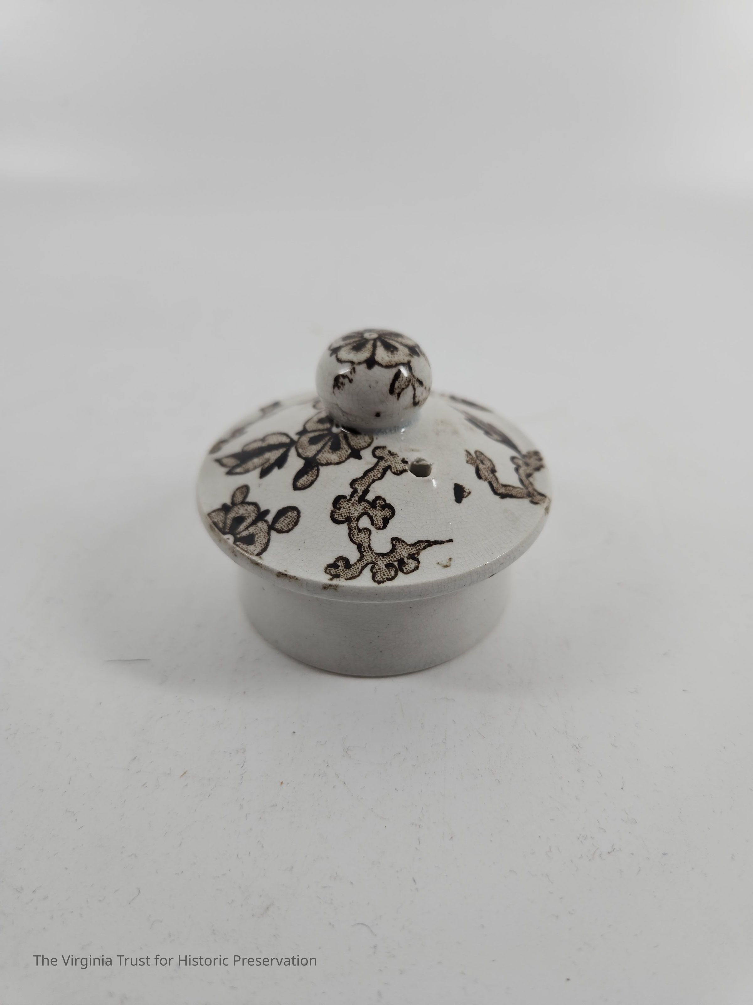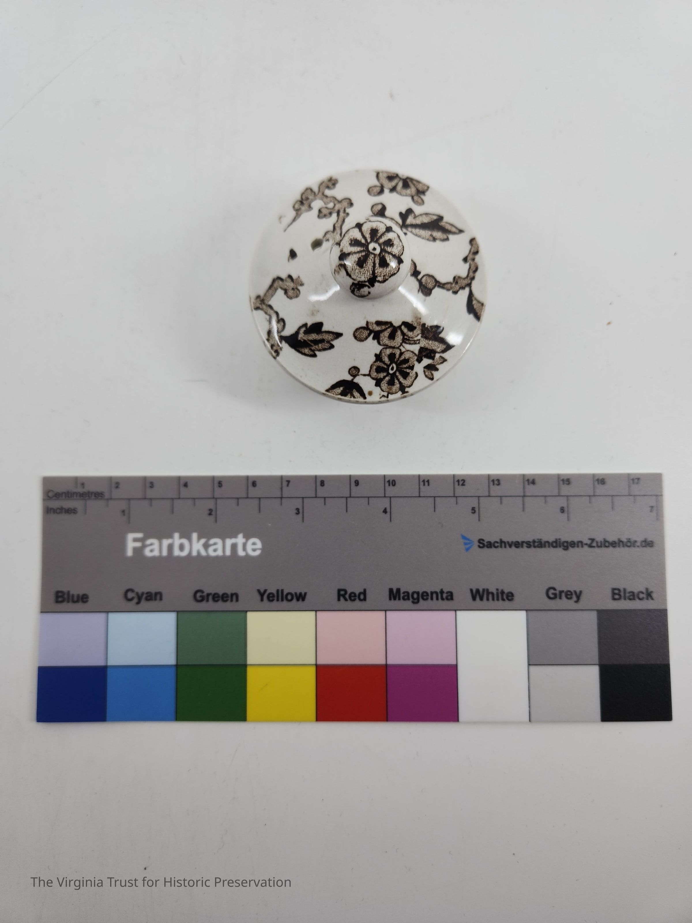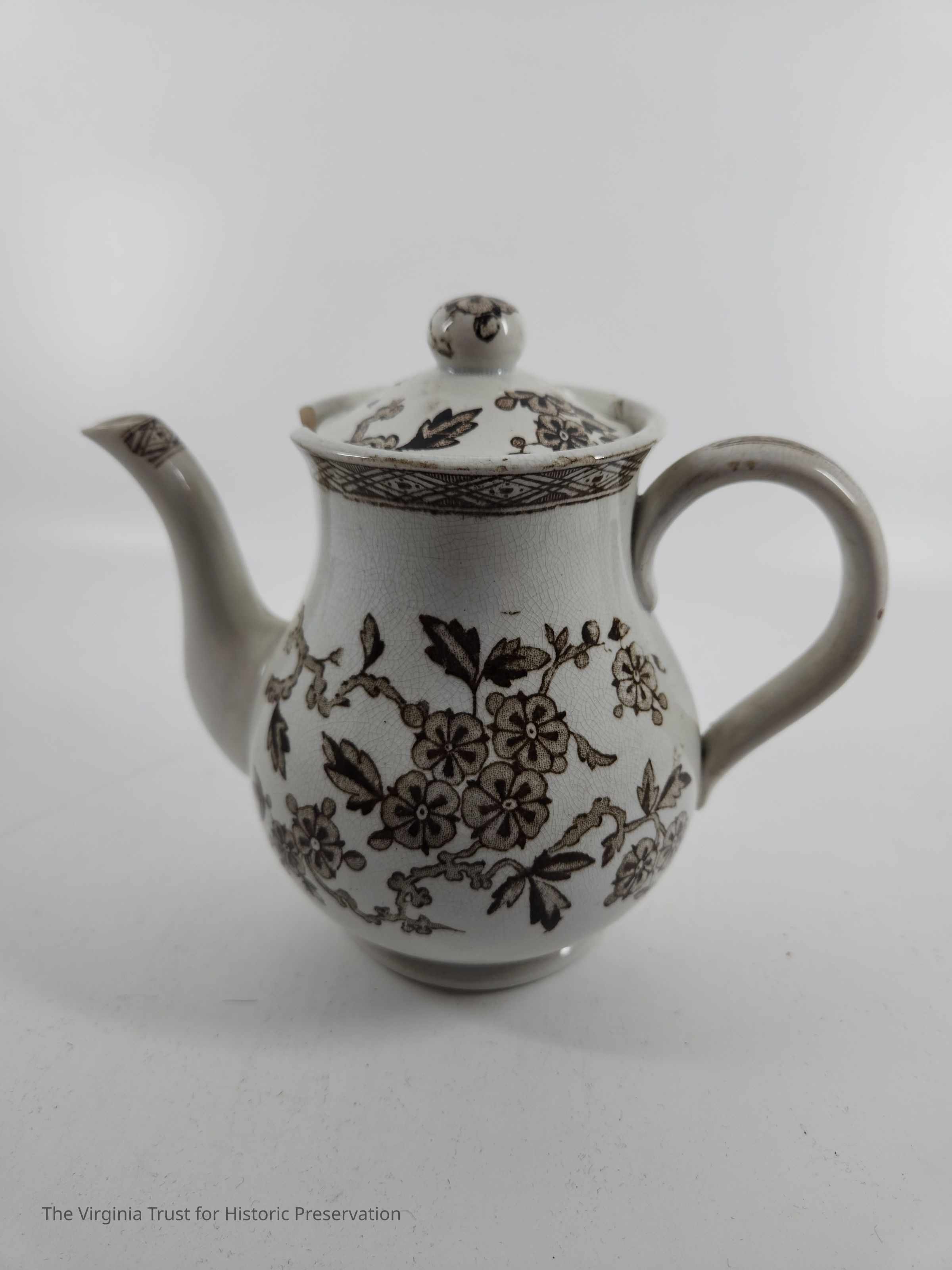 Lid to teapot (1986.447 I) made of white ceramic with brown floral design. Part of a tea set.