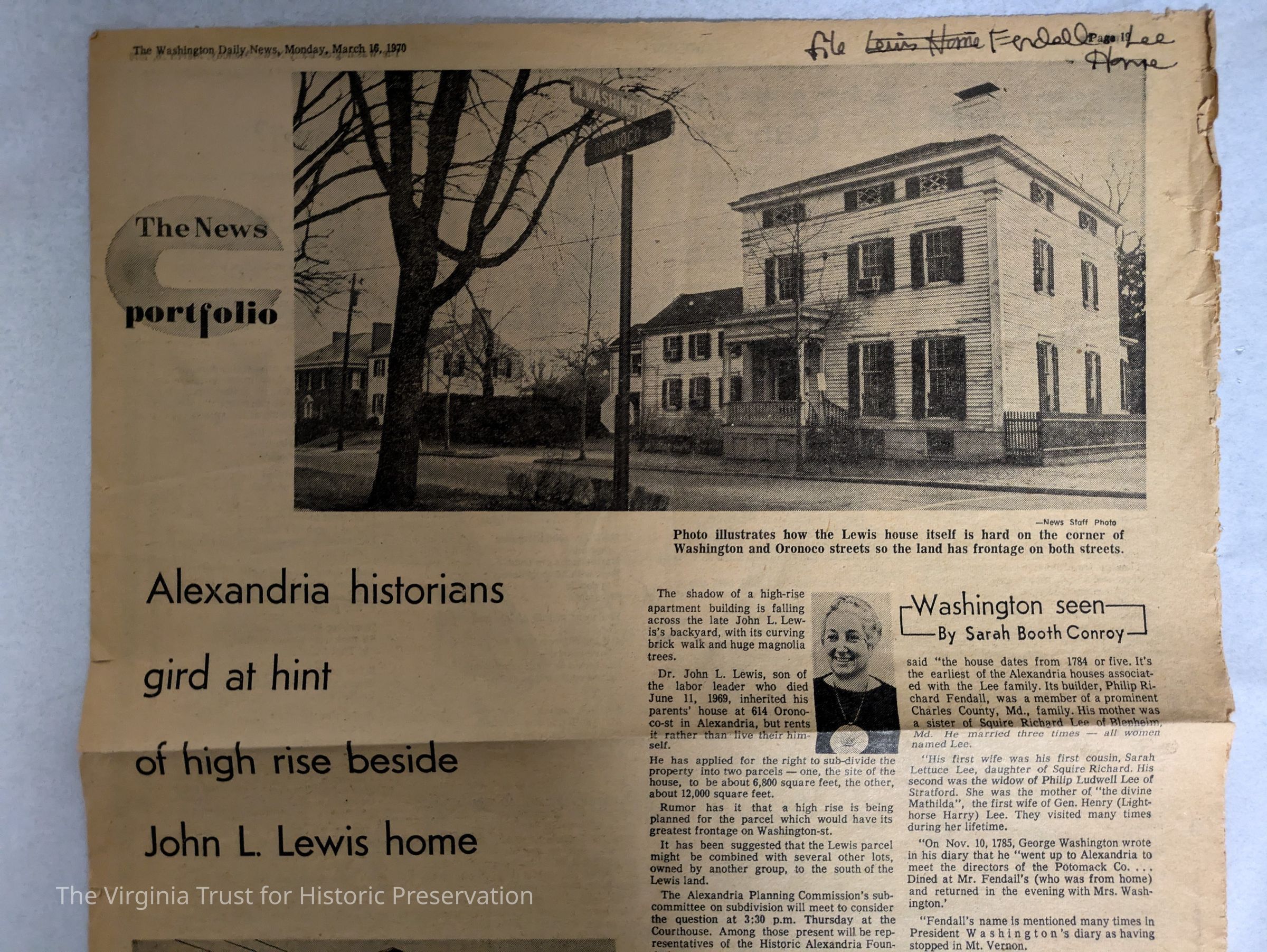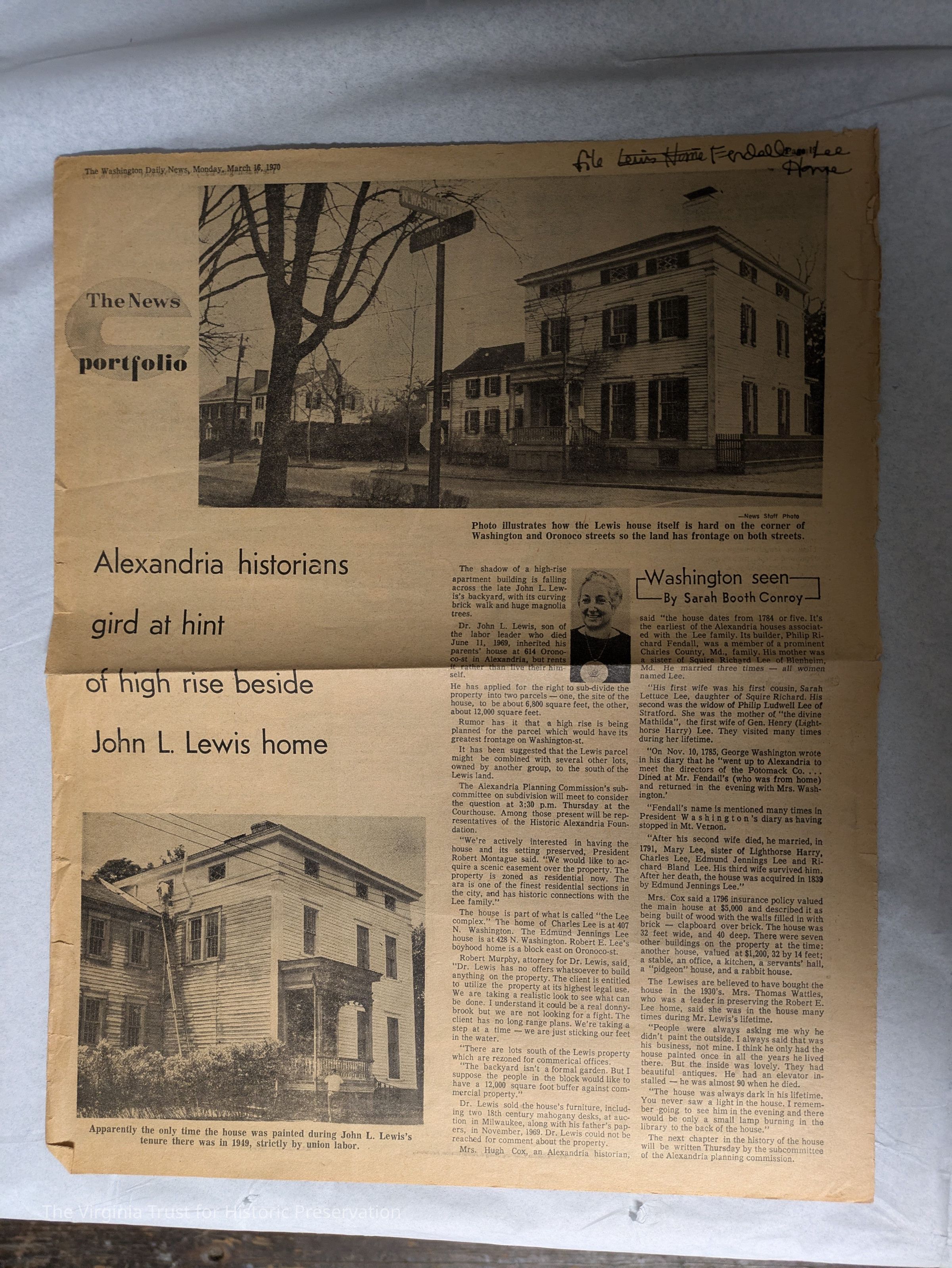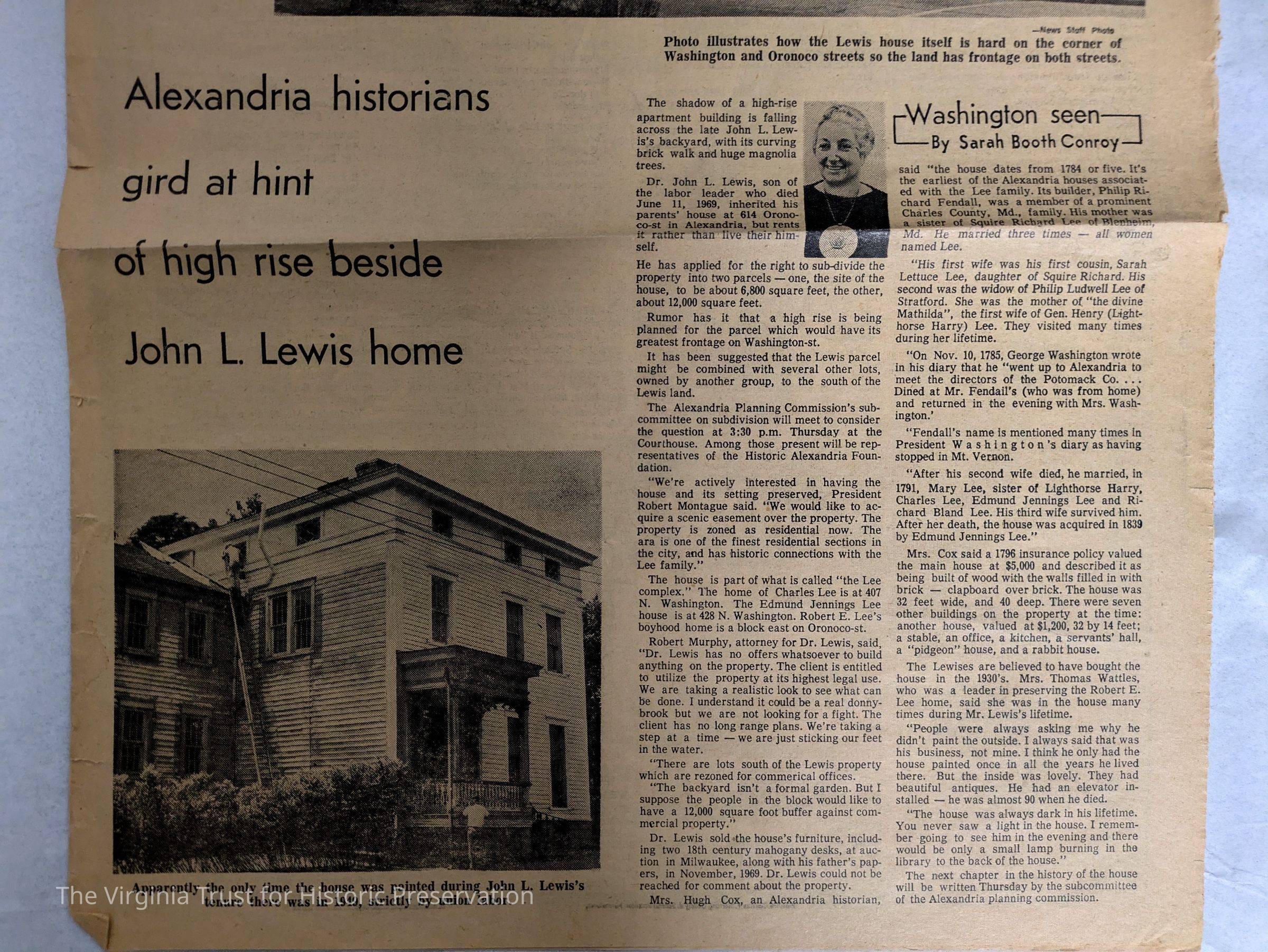 Article from The Washington Daily News, dated Monday 16, 1970. Title of the article is "Alexandria Historians Gird at Hint of High Rise beside John L. Lewis home." Two photos of the home are part of the article.Dimensions
