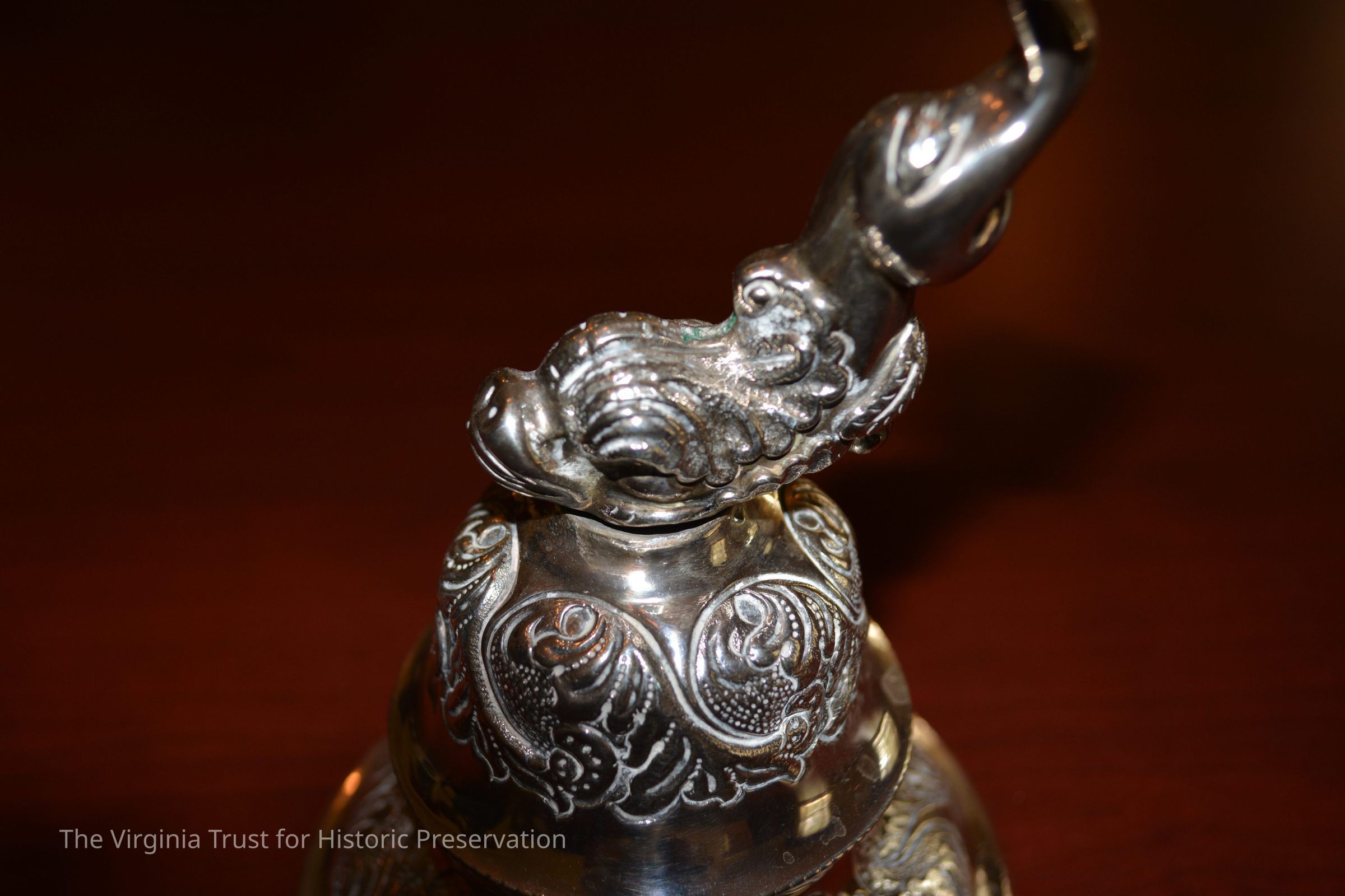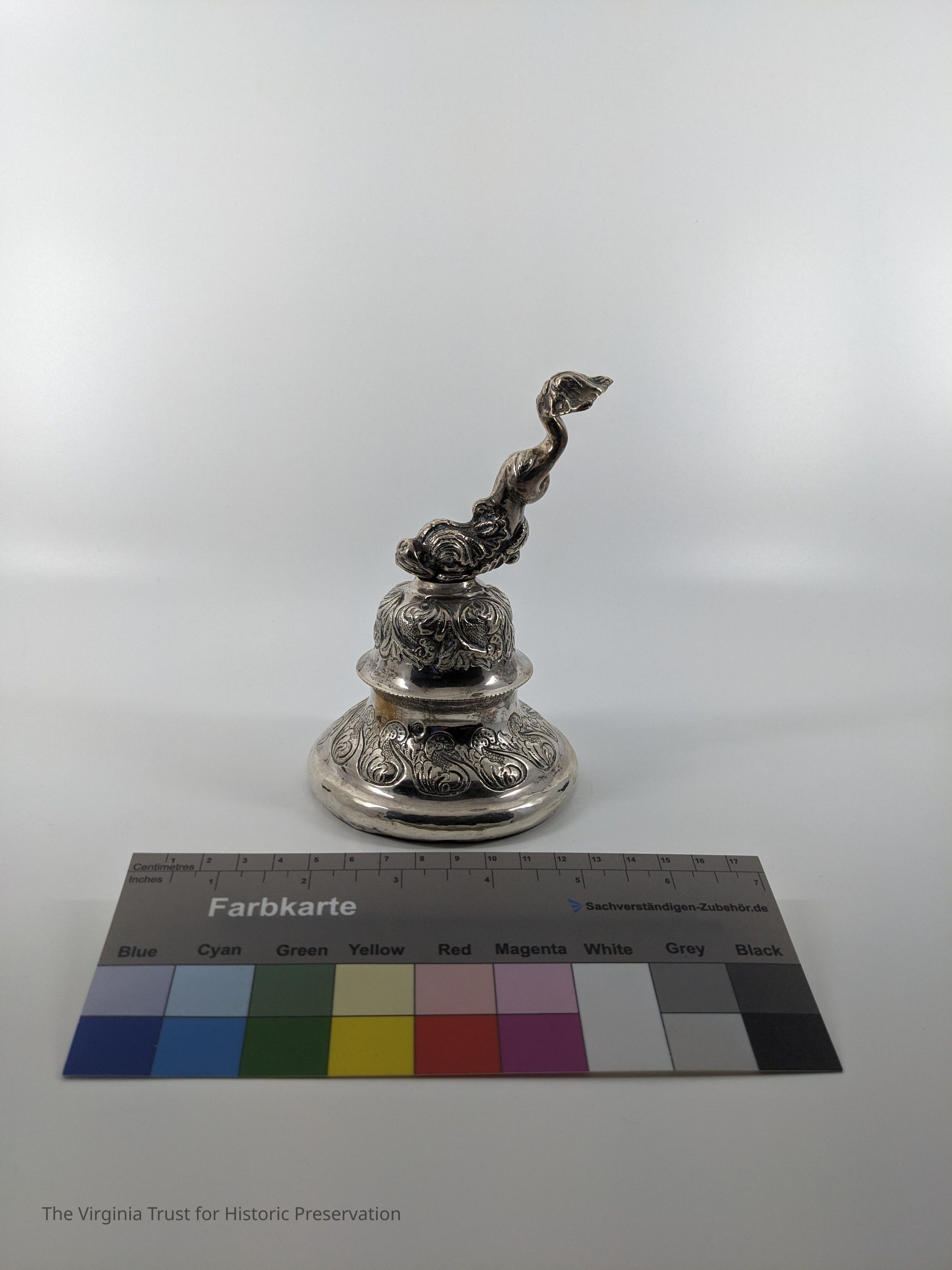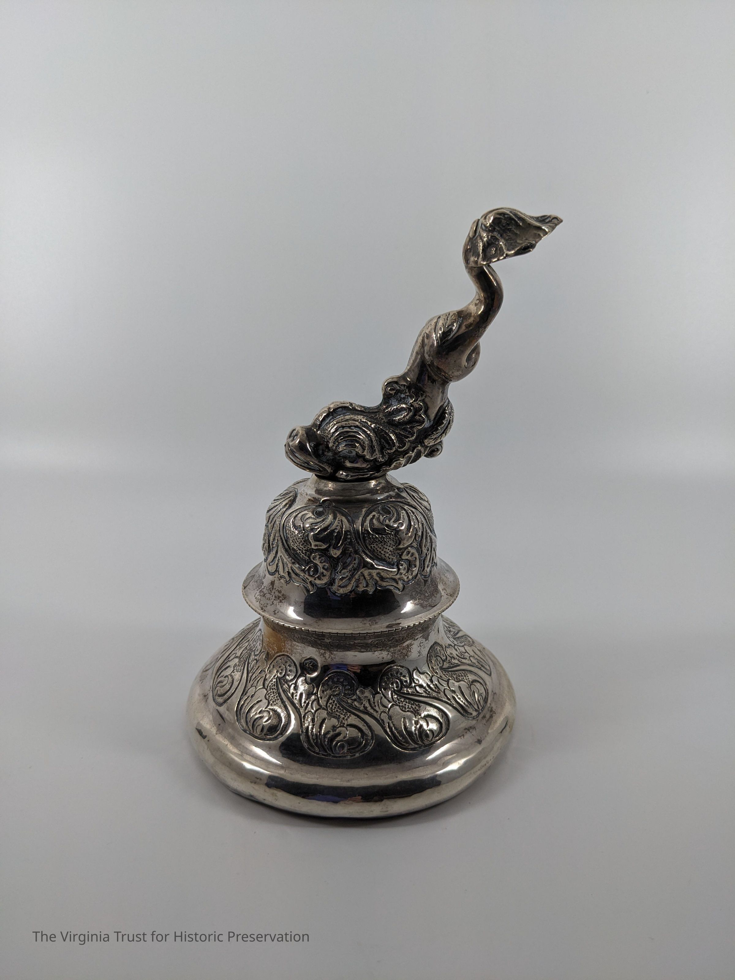Mid 19th century, Dutch, solid sliver, ogee table bell. Tapering circular form. C.1860. Sea and dolphin motifs, dolphin handle. Good condition.