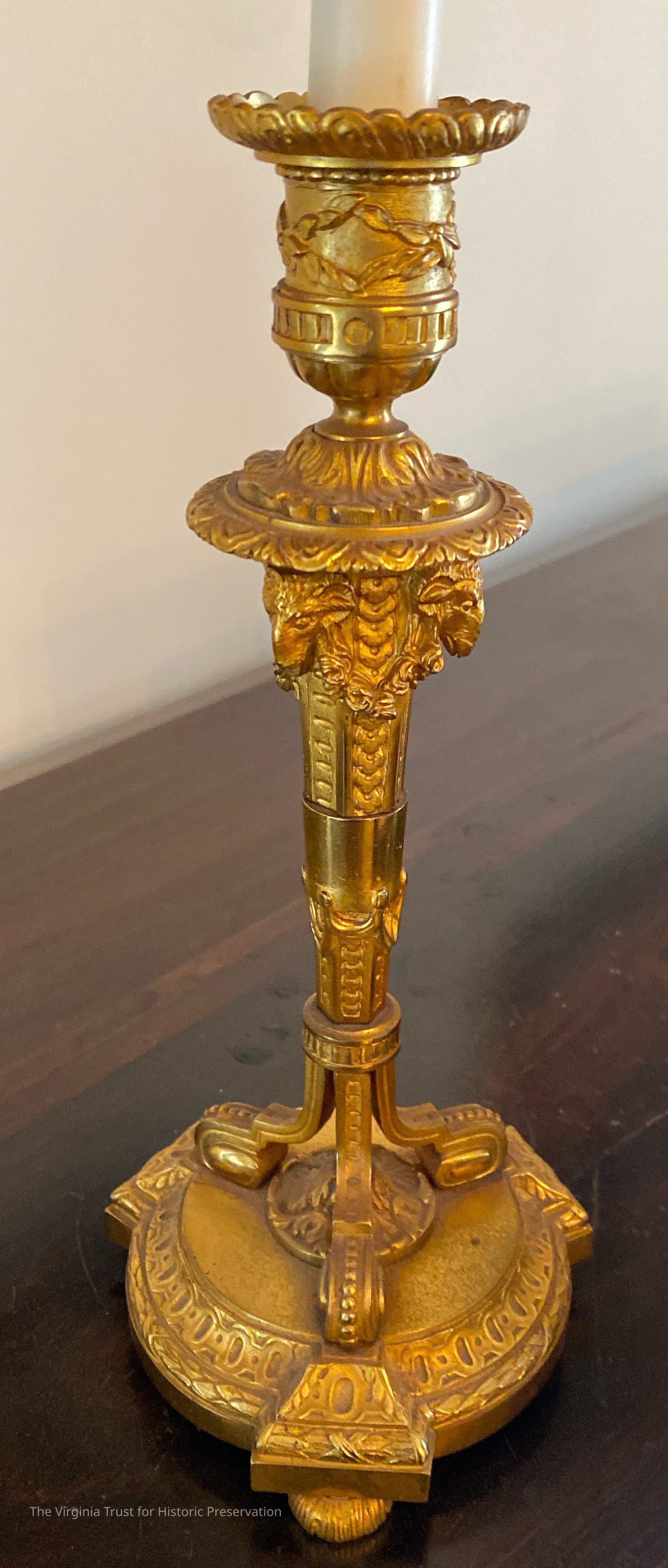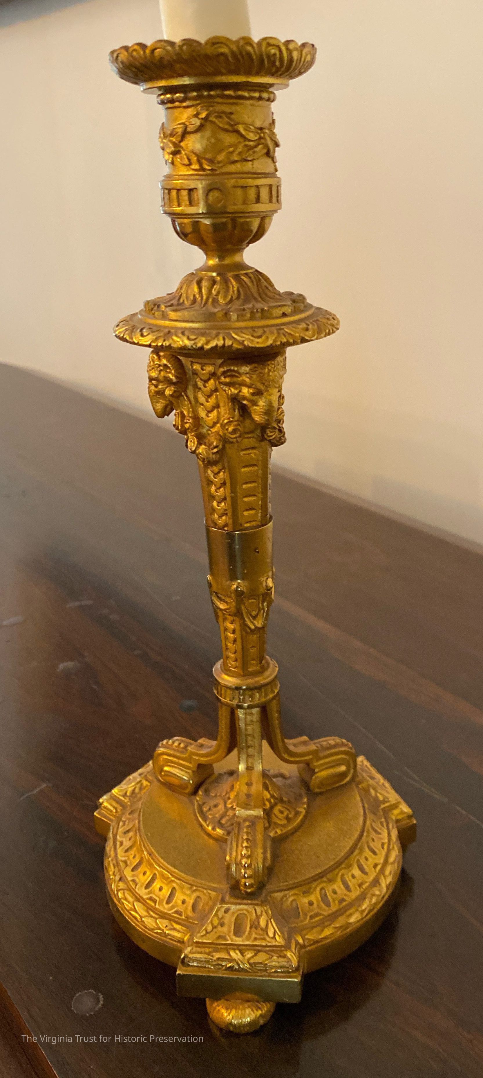 Pair of gilt brass candlesticks, c. 1850. Tapering columns with horizontal fluting and overlapping chevron decoration, topped with laurel leaf and reeded vase candle holders. Circular bases with buttresses joining the torchere legs, edged with laurel leaf and medallion decoration, finished with three compressed bun feet, formed as petal heads.Dimensions