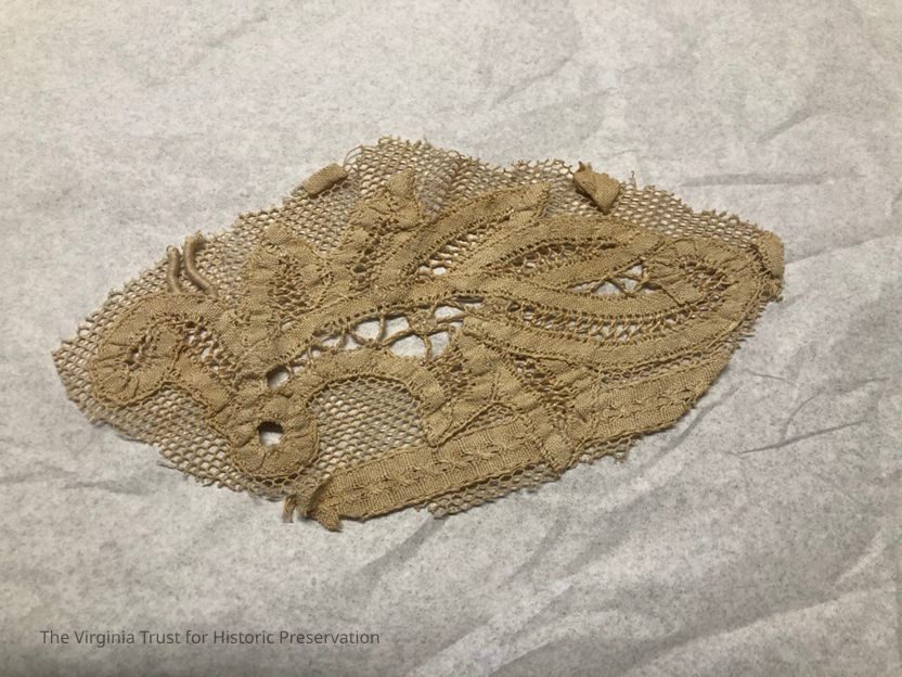 Small cream, oval leaf from a runner or tablecloth. Cut out with floral motifs. 8.5" x 4.5"