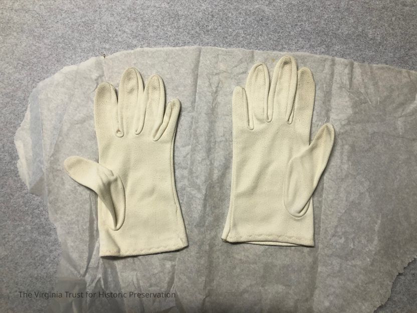 A pair of off white lady's gloves. perhapse used for leisure riding. Good condition with slight discoloration on the finger tips. 9" x 3.5"