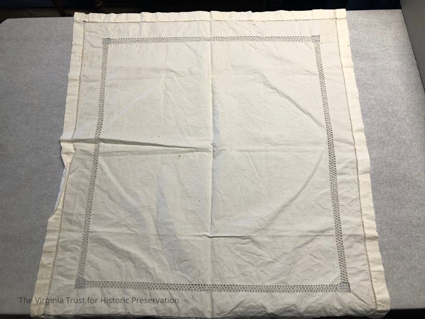 Square tablecloth with corner diamond designs. Some stains, small holes, and tears around the edges. 32" x 29.5"