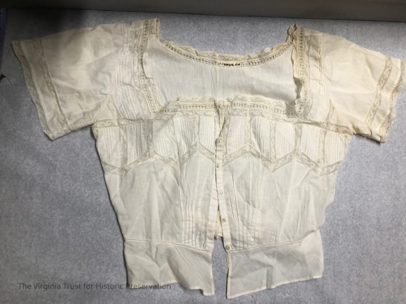 Cream undershirt with some tears and staining but good condition overall. Lace trim with a collar tag that reads "H. Craigie CH" and a manufacturers stamp that reads "12.671Tue48". Bust length 18" x 17", sleve length 7"