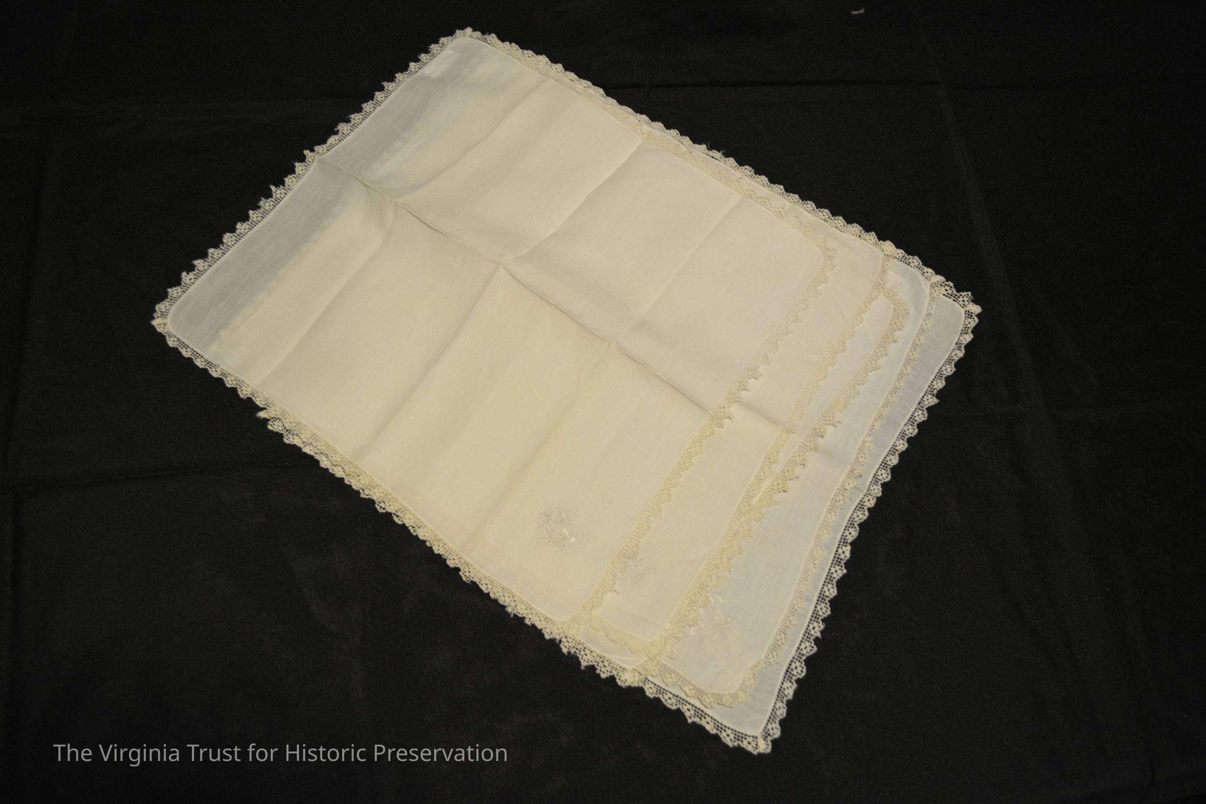 Cream colored blanket with floral motifs and some black lettering on the edges. Some discoloration and staining, good overall condition.