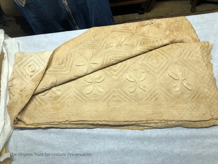 Mustard colored bedspread with a checkered patterning around the edges and floral motifs. Some small tears and stains. 90" x 75"