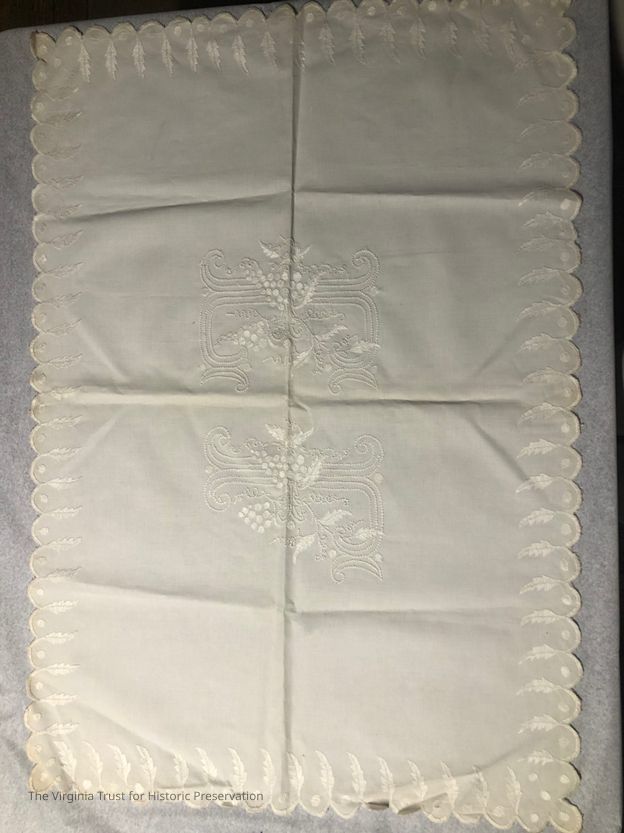 Two cream colored tablecloths with identical floral designs. Some small holes and stains but good condition. Embroidery possibly initials "E.F." 36"x 25"