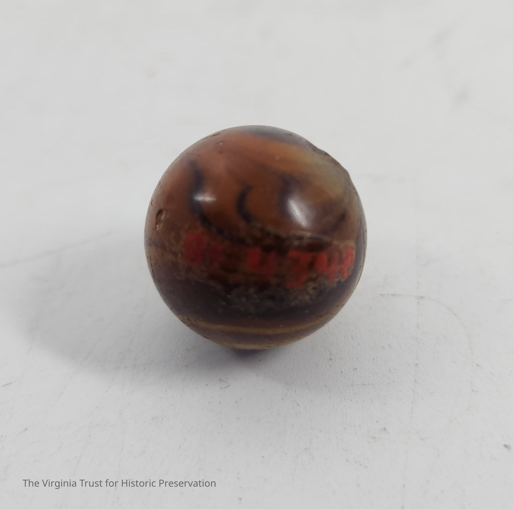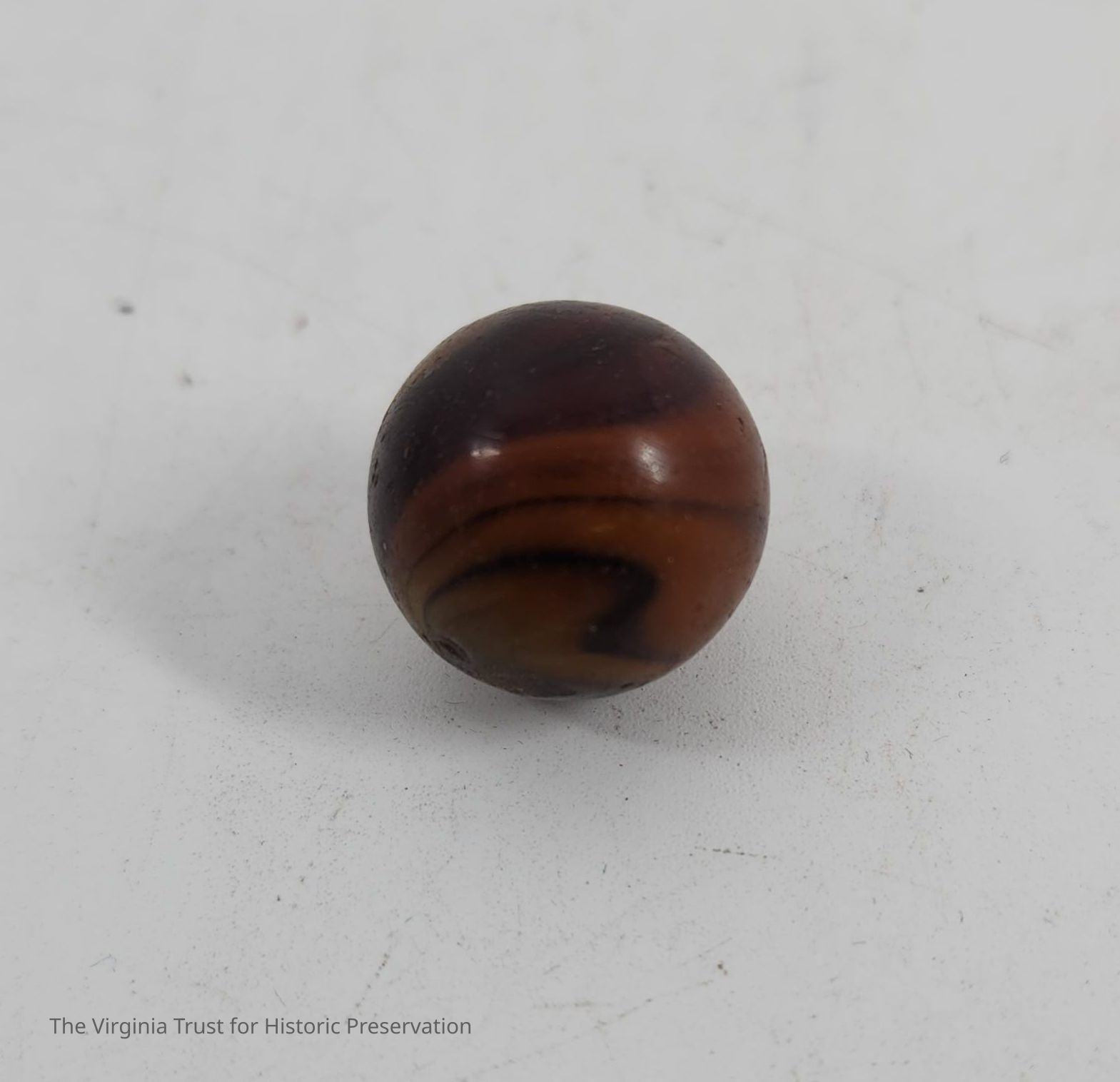 Marble with swirls of different shades of brown. One of 11 assorted marbles, various size, design and age.
