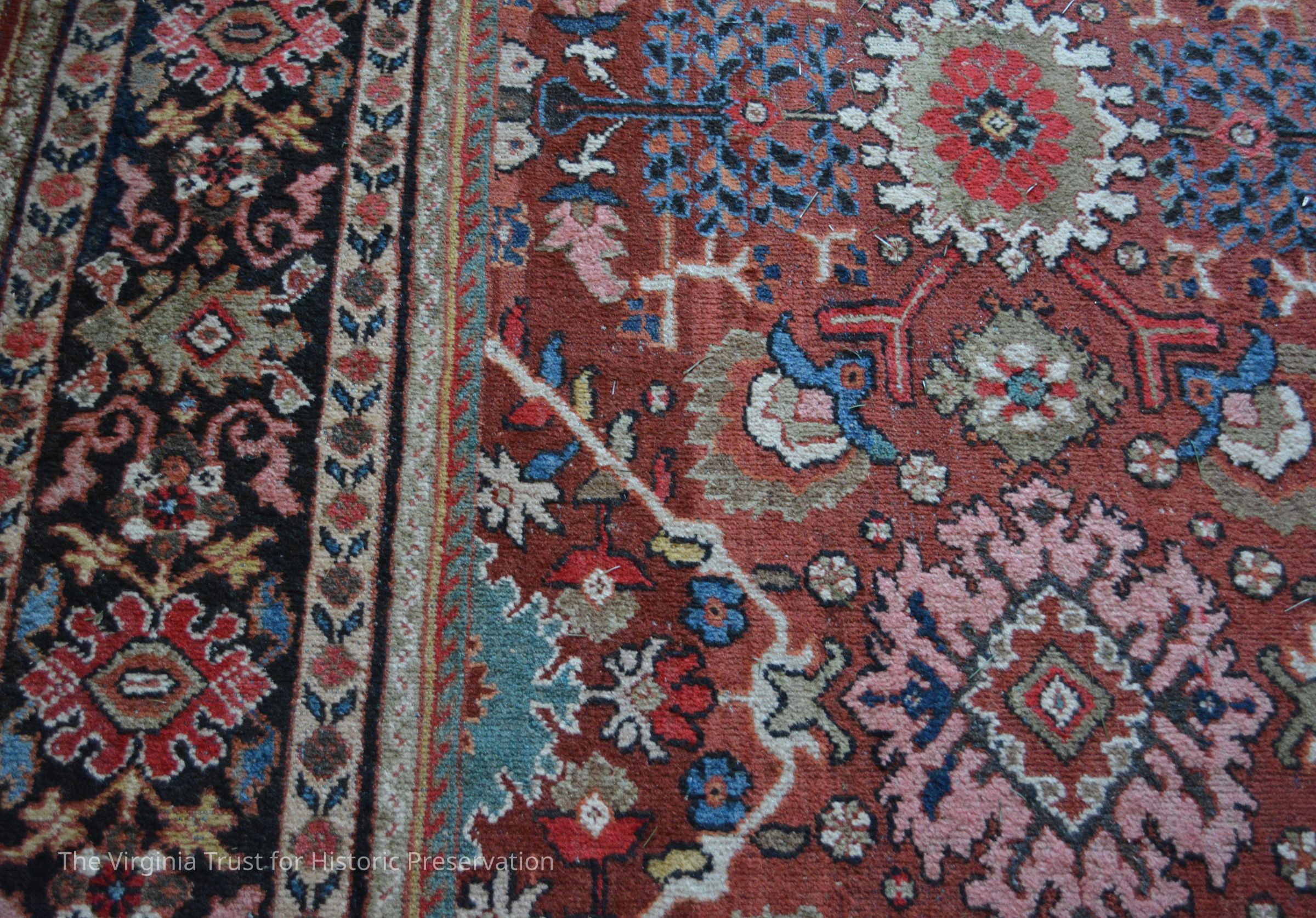 Antique, red Persian Mahal carpet. Designs of red, blue, green and cream. Ornamental black design goes around the border.