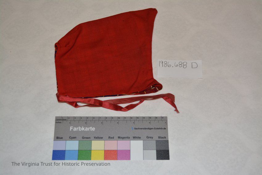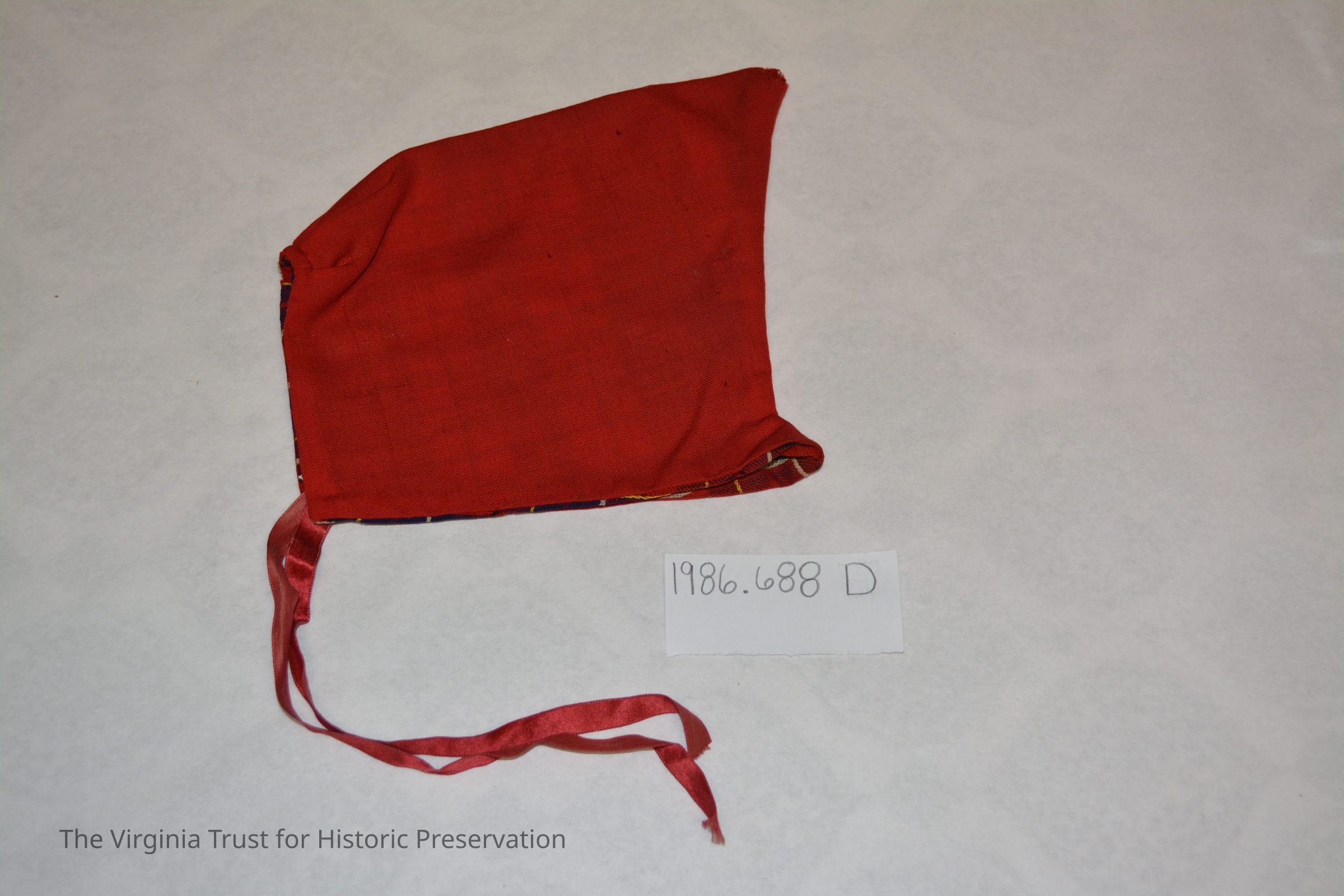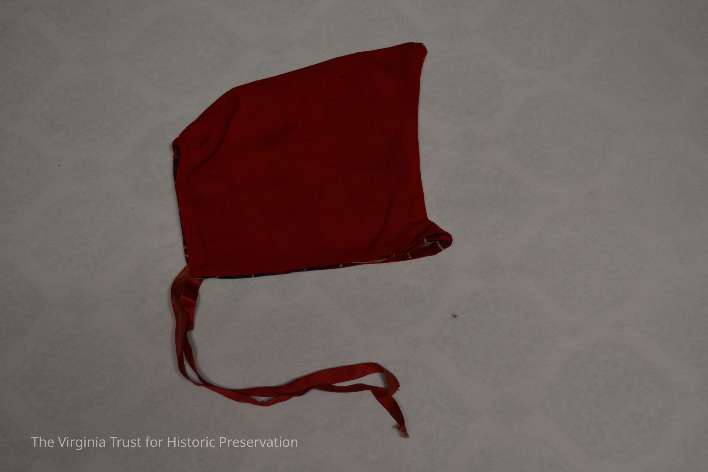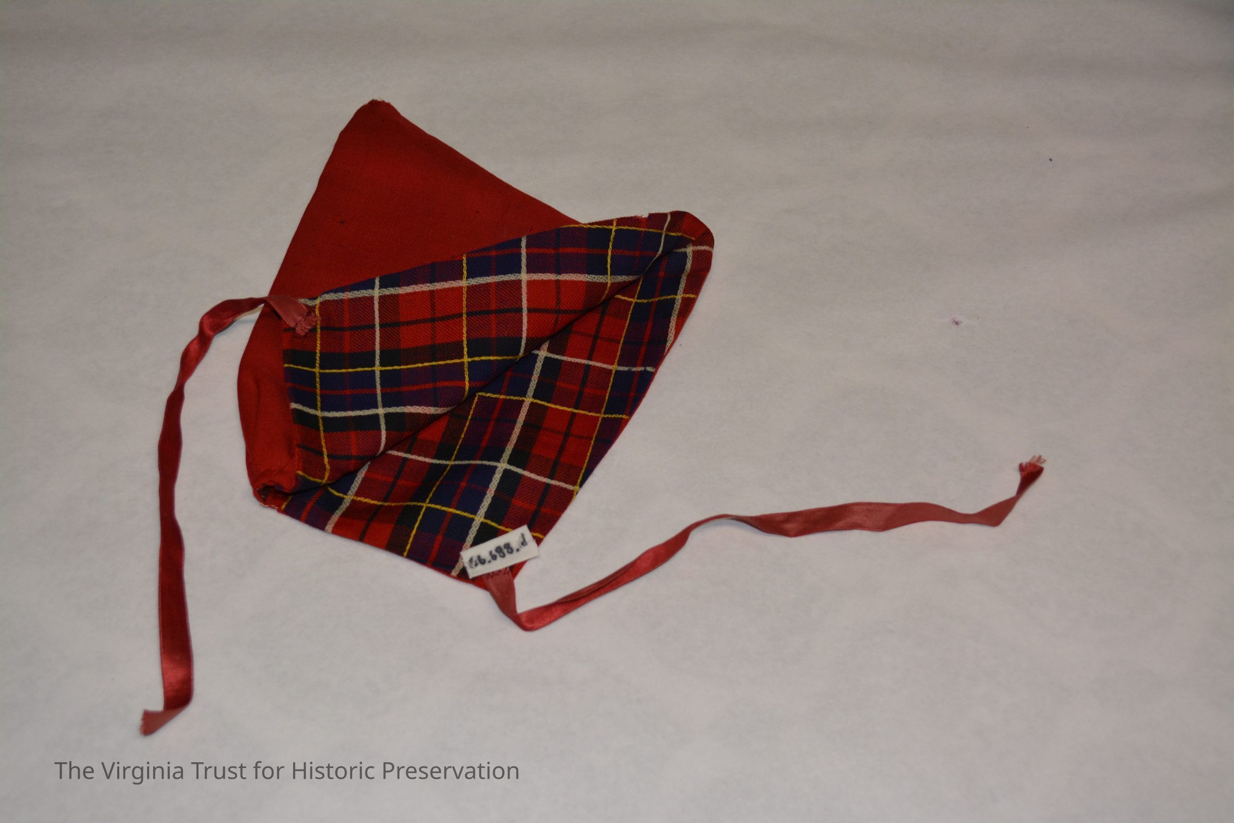 Reversible cap with red ribbon to tie under chin and plaid interior design