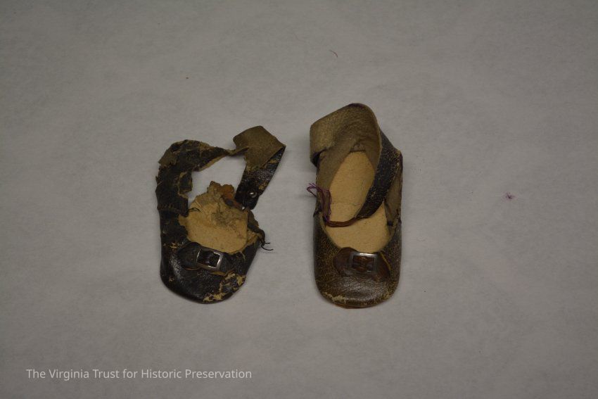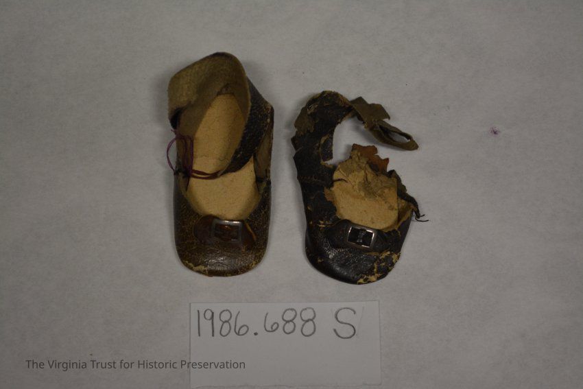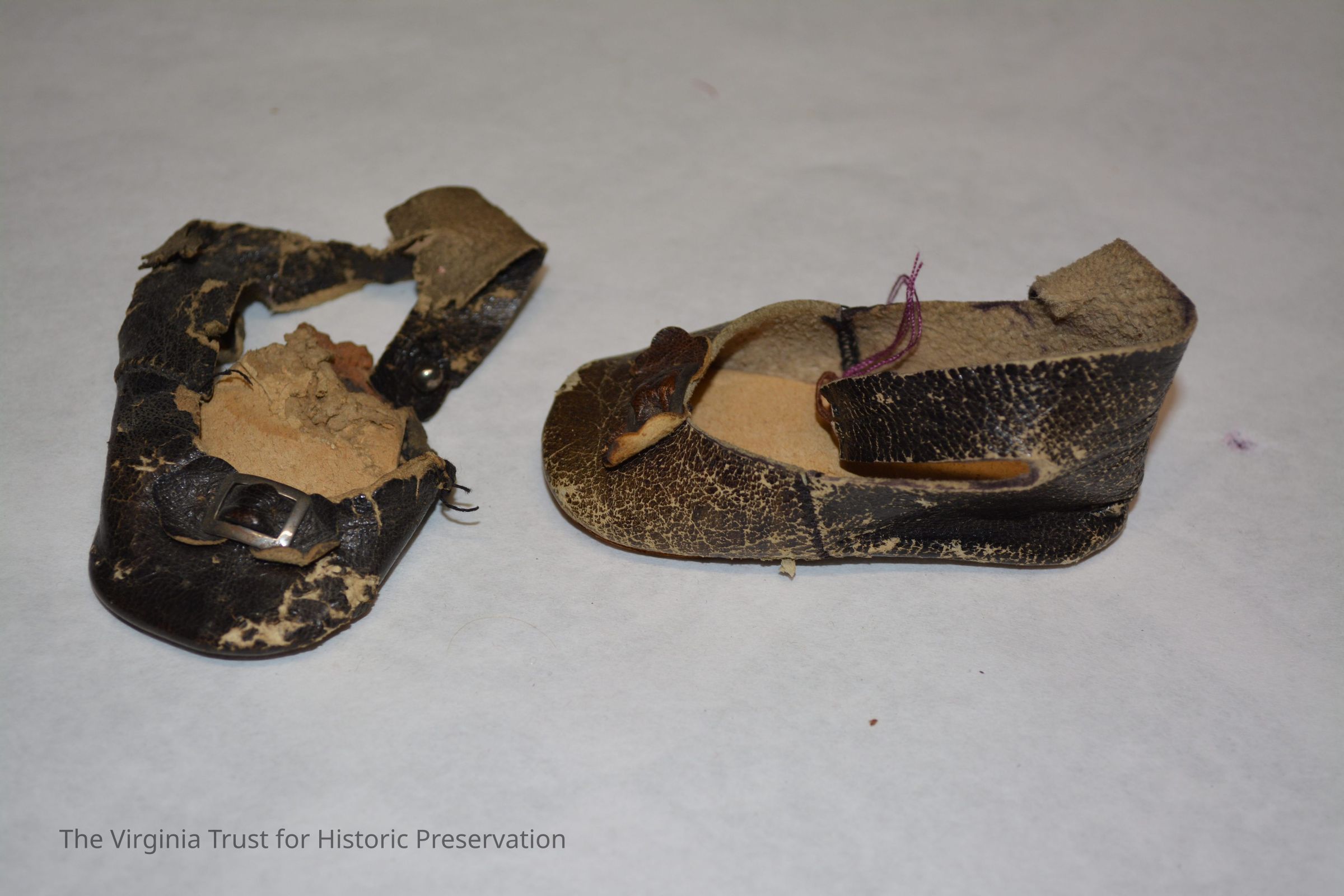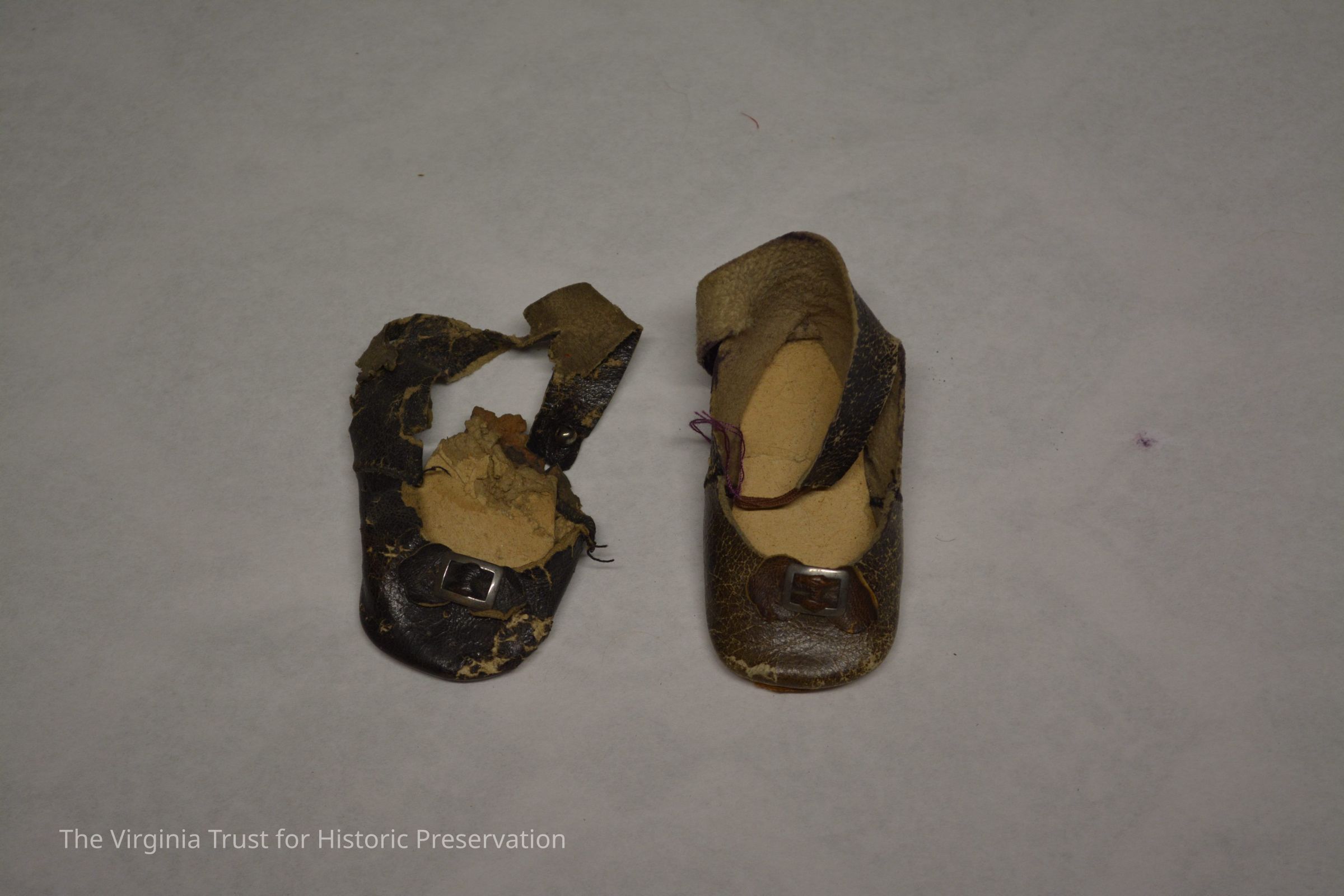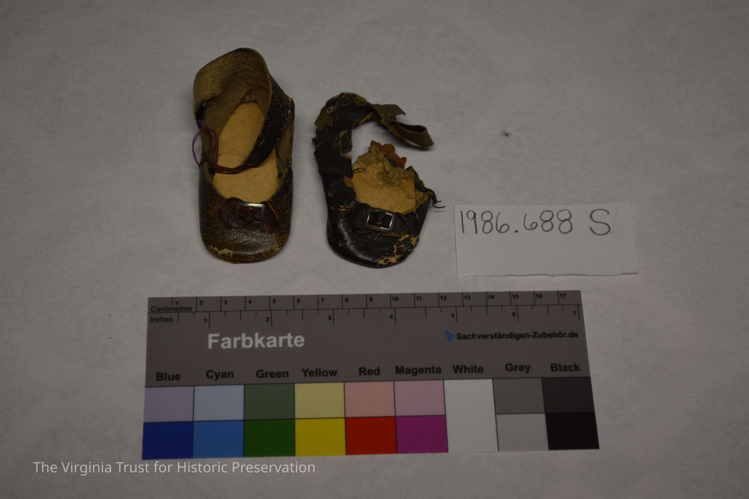 Pair of shoes originally reported as black in color but now (2022) more brown. Shoes fastened with a clip that wraps around the doll's legs.Dimensions