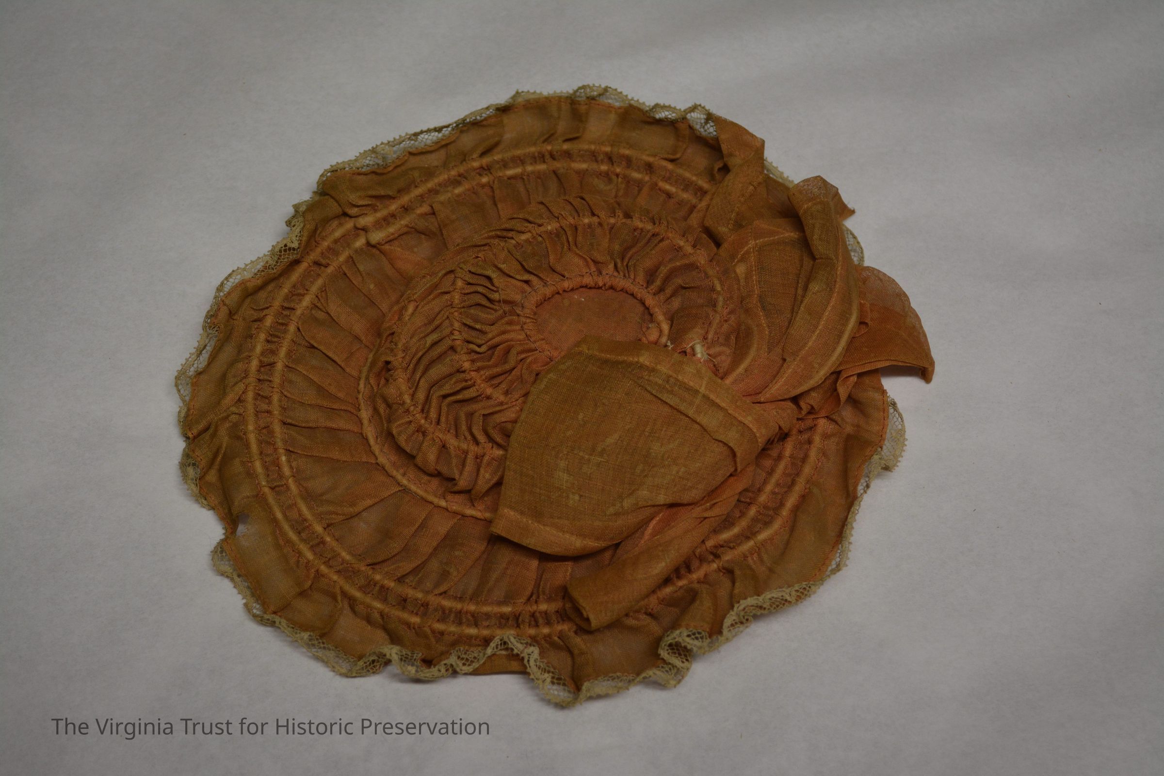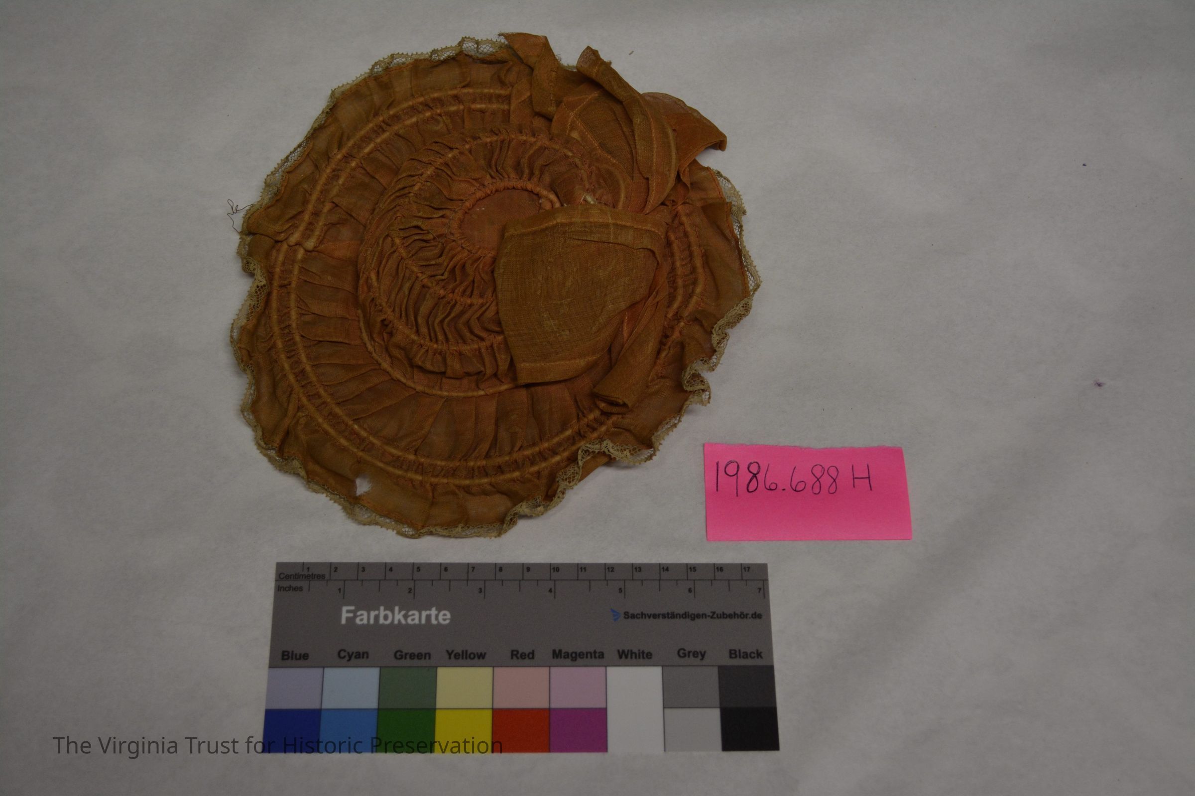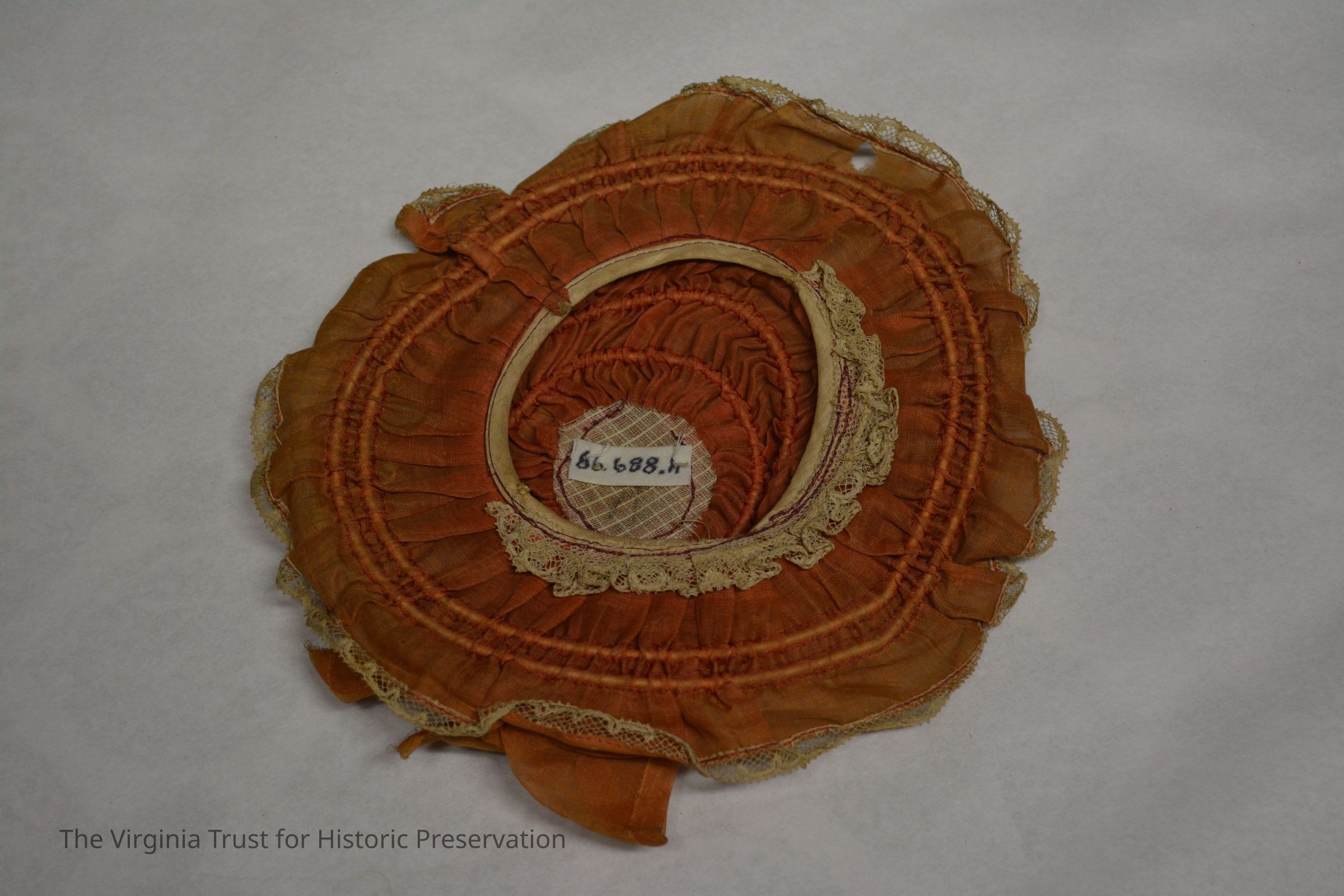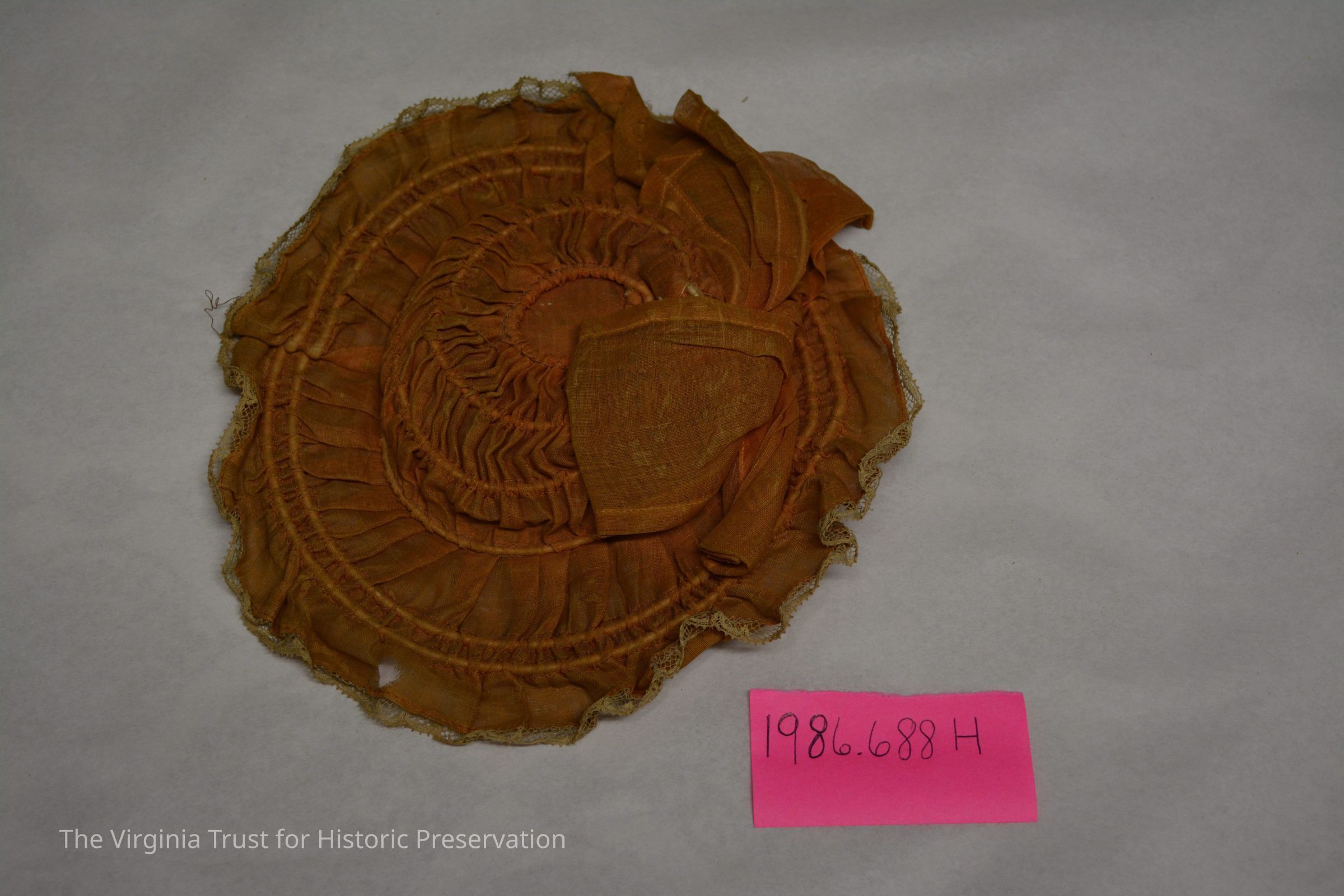Rust-colored bonnet located in the interior compartment of the top section of the doll's trunk. Placed in compartment with second bonnet (1986.688 I)Dimensions