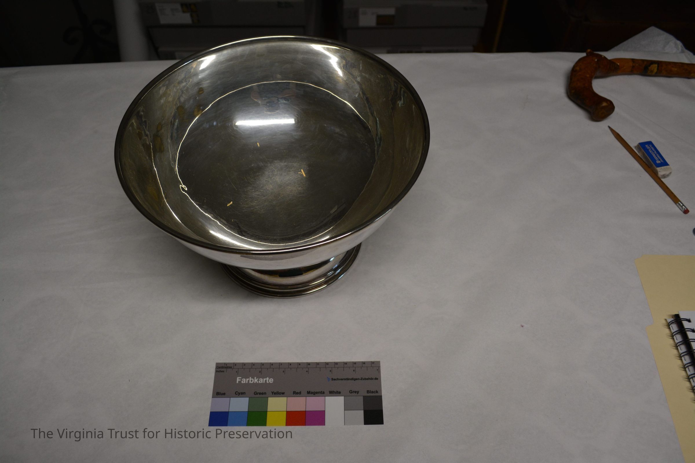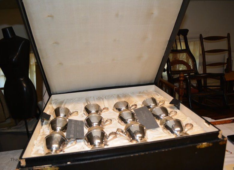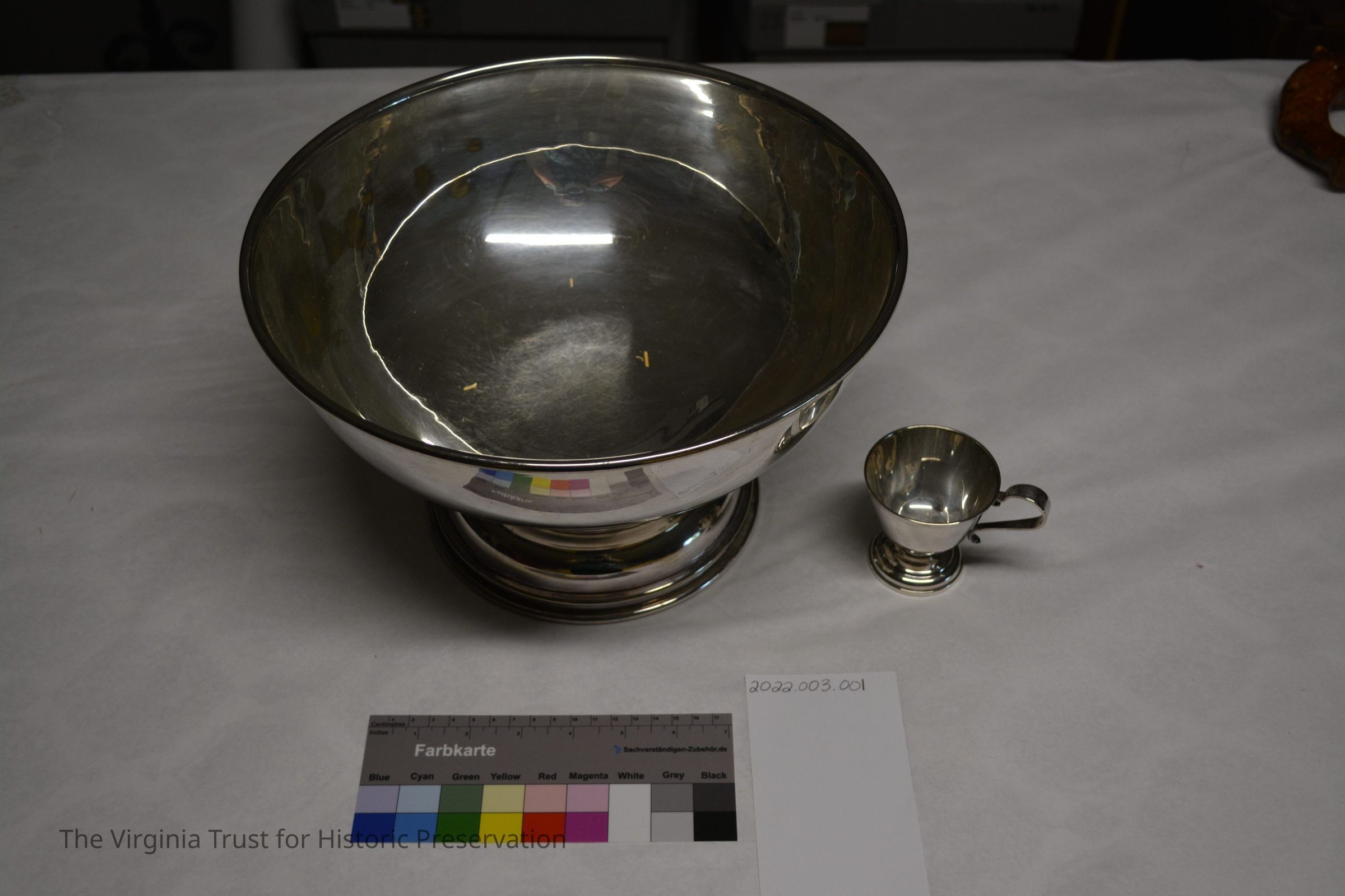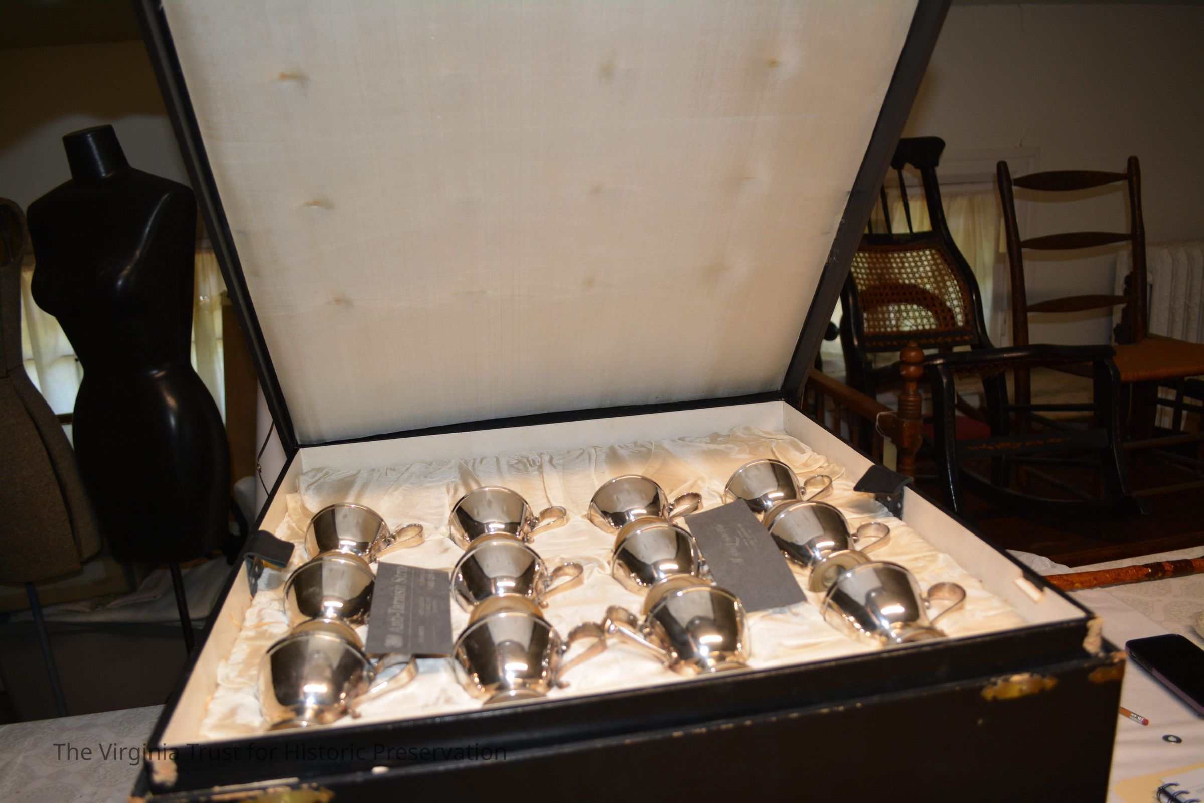 Silver punchbowl and 12 cups all stored in a black box with cushioning and anti-tarnish strips inside to protect the material. Bought at an Alexandria Symphony auction in 2007. Silver punchbowl and cups are in very good condition but the black box they are stored in is in poor condition, as the paint and metal latches are starting to come off.Dimensions