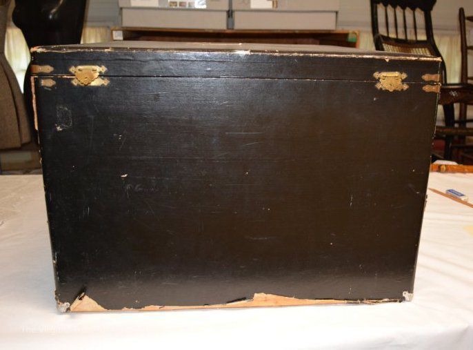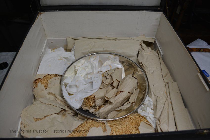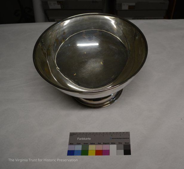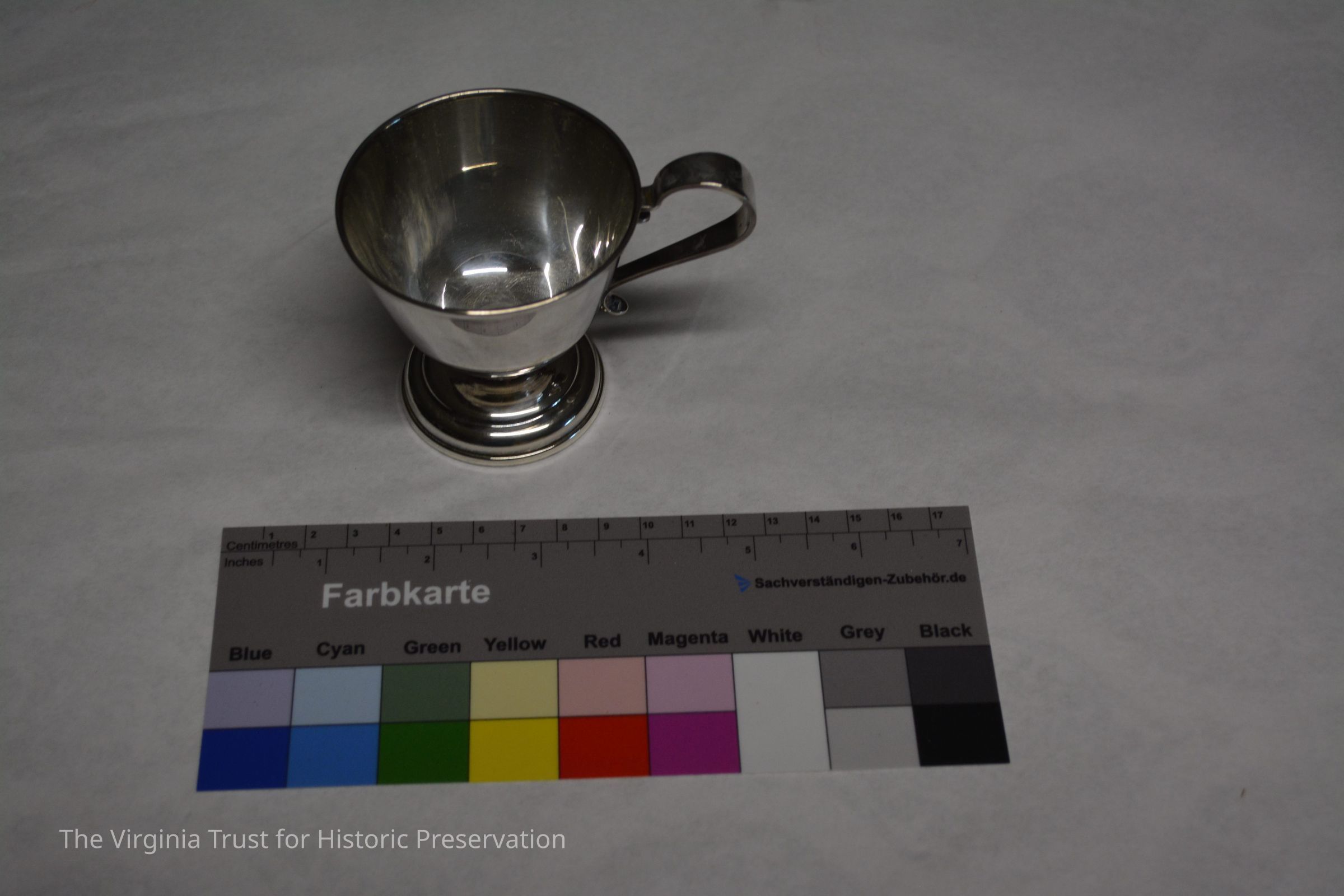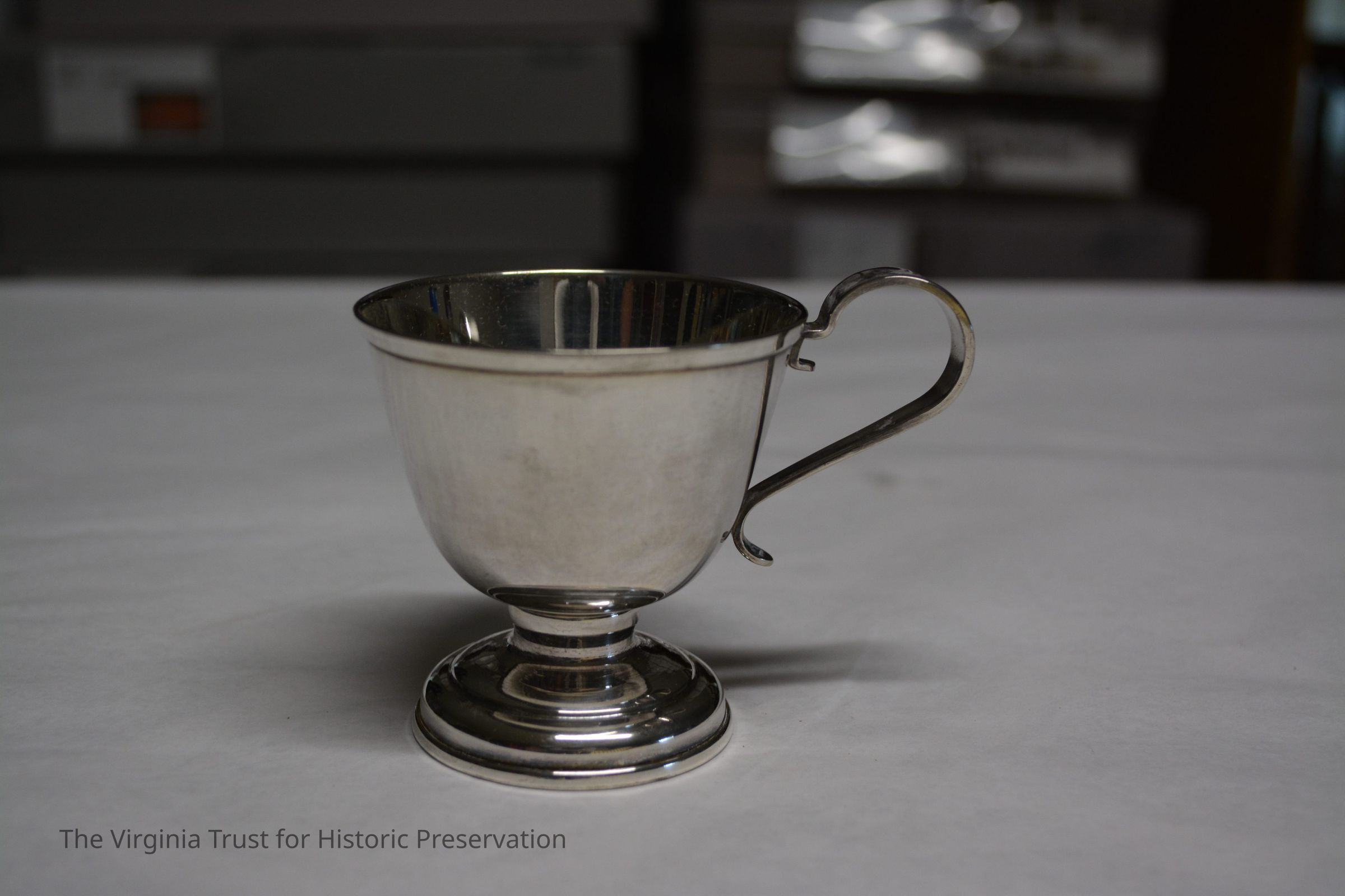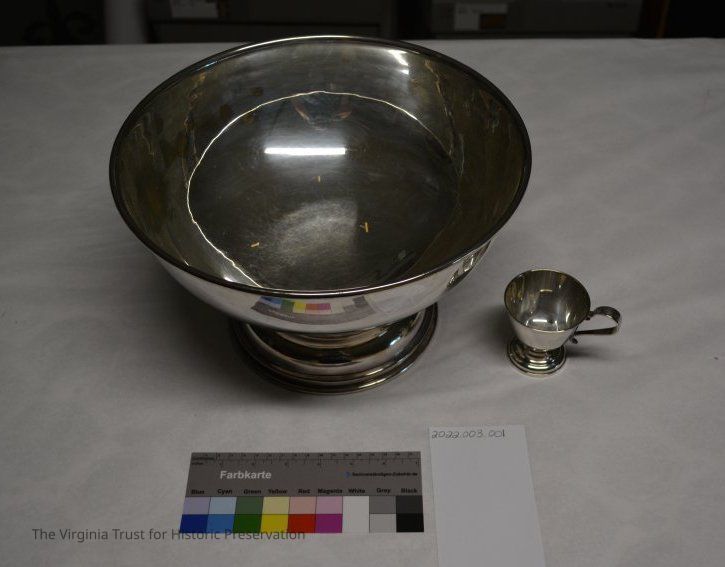 Silver punchbowl and 12 cups all stored in a black box with cushioning and anti-tarnish strips inside to protect the material. Bought at an Alexandria Symphony auction in 2007. Silver punchbowl and cups are in very good condition but the black box they are stored in is in poor condition, as the paint and metal latches are starting to come off.Dimensions
