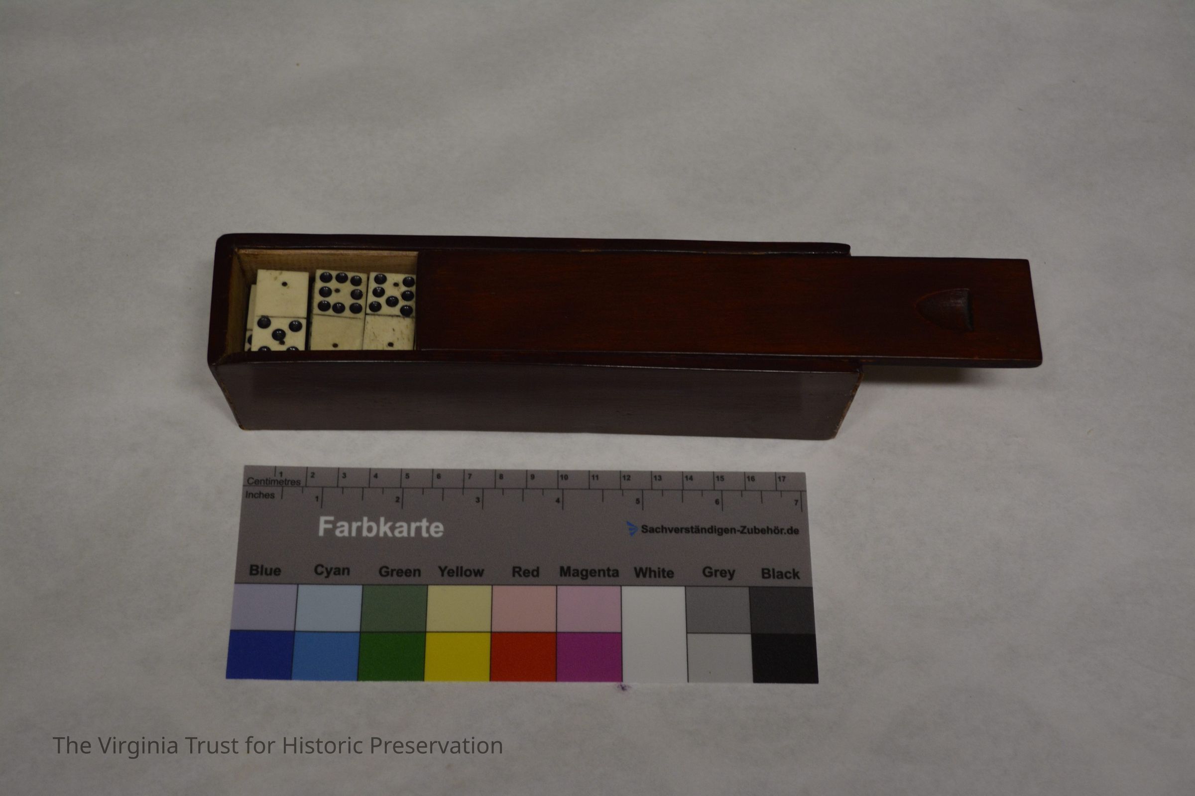 Set of 55 (double nines) dominoes, English, in original wooden (mahogany) storage box with a sliding lid.