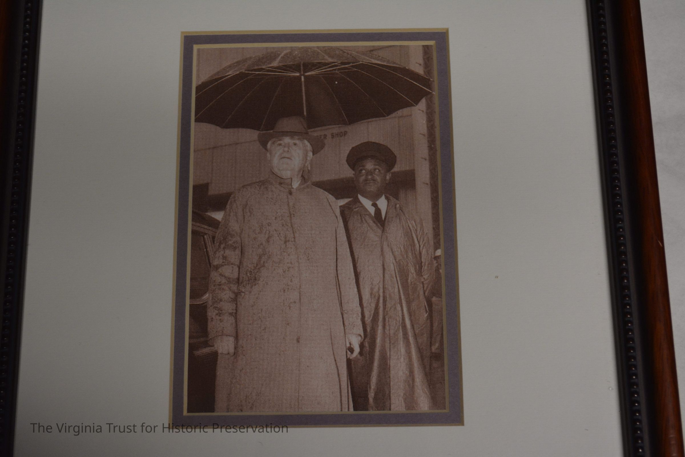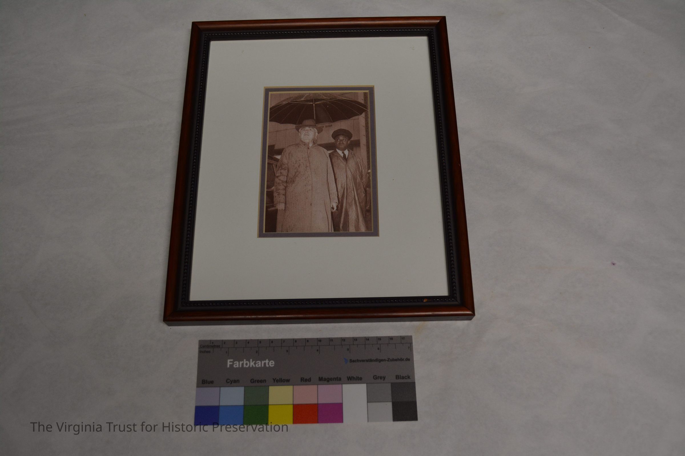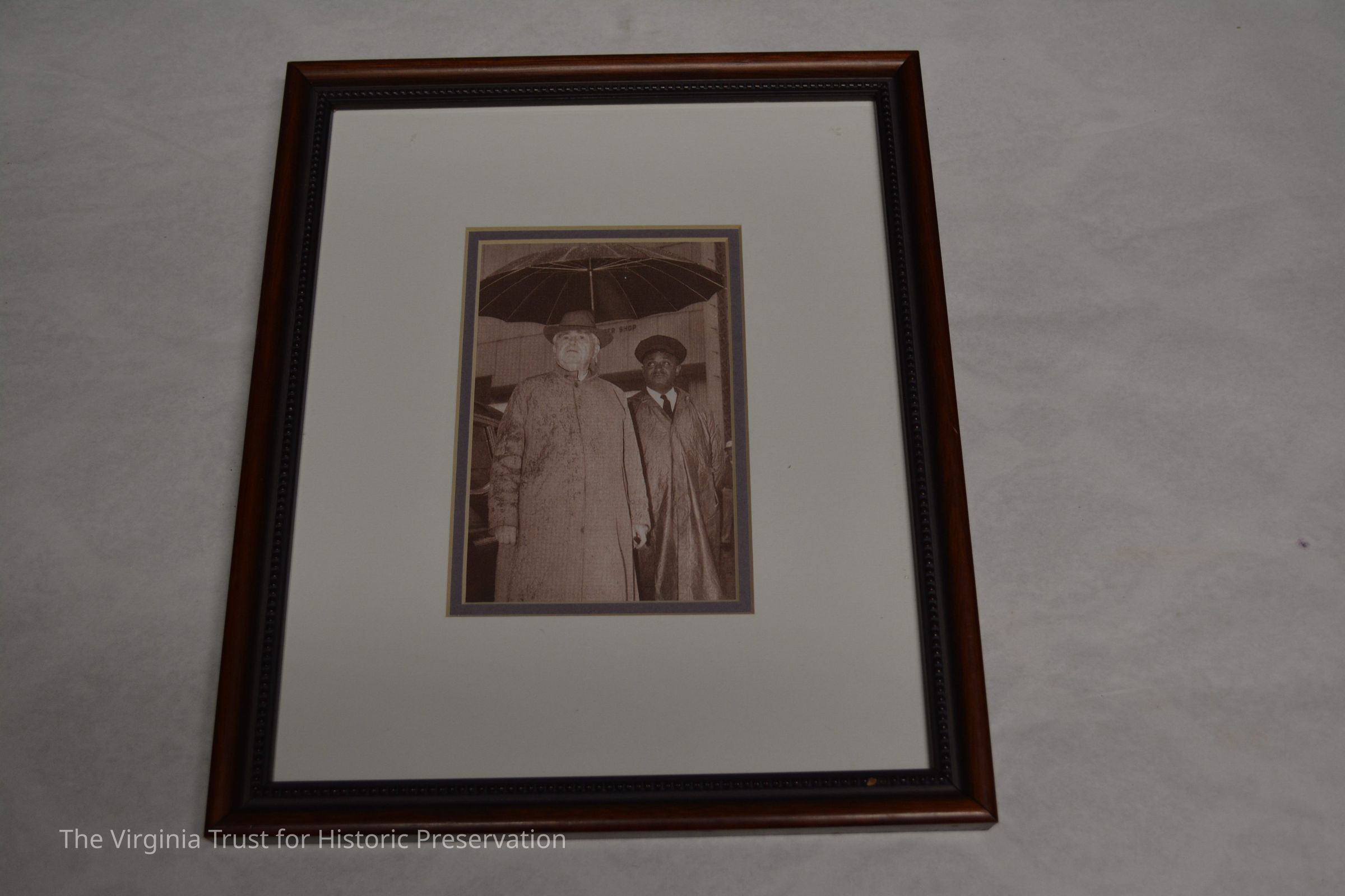 Framed photograph of John L. Lewis and James Lewis Jr. James Lewis Jr. is holding up an umbrella over John L. Lewis. Sticker of the framer is located on bottom left of the back.
