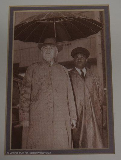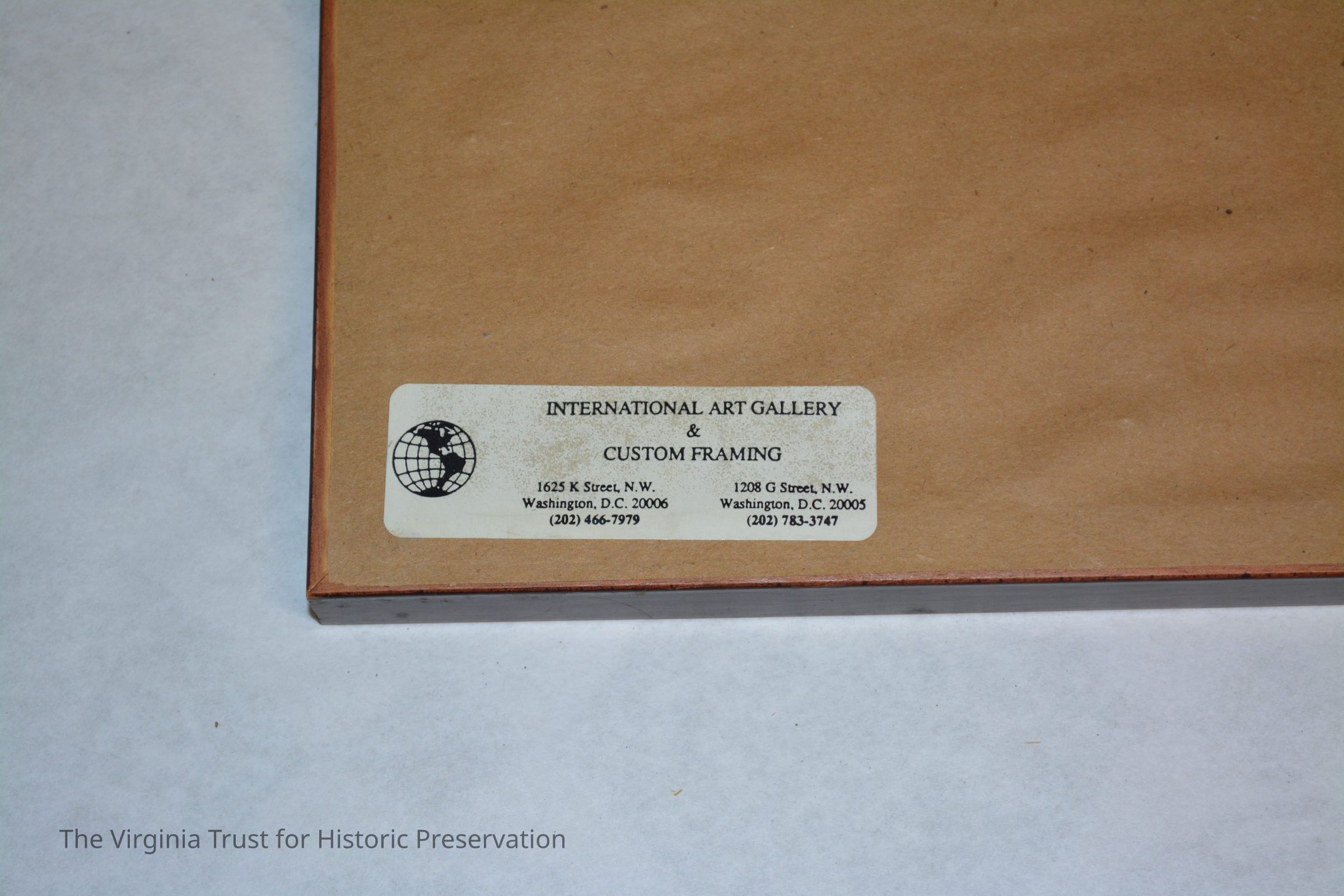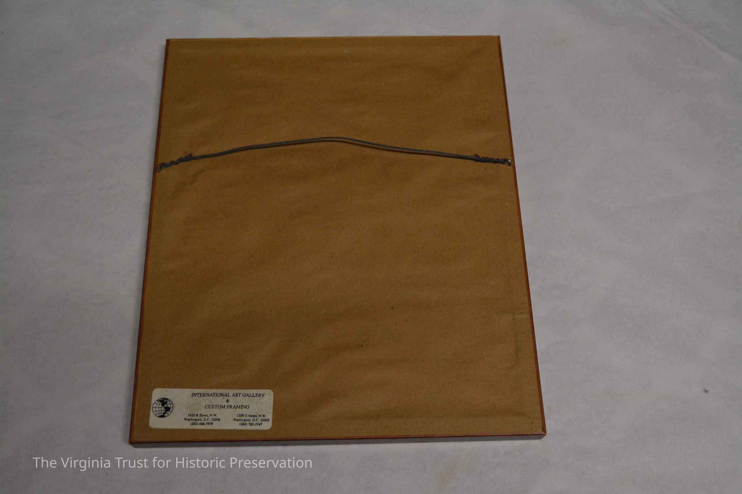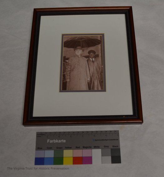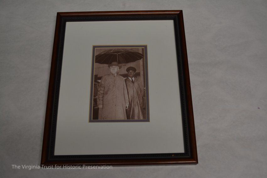 Framed photograph of John L. Lewis and James Lewis Jr. James Lewis Jr. is holding up an umbrella over John L. Lewis. Sticker of the framer is located on bottom left of the back.