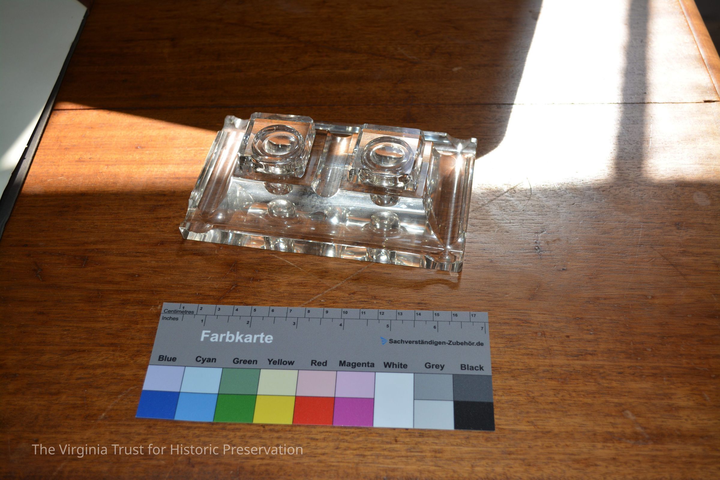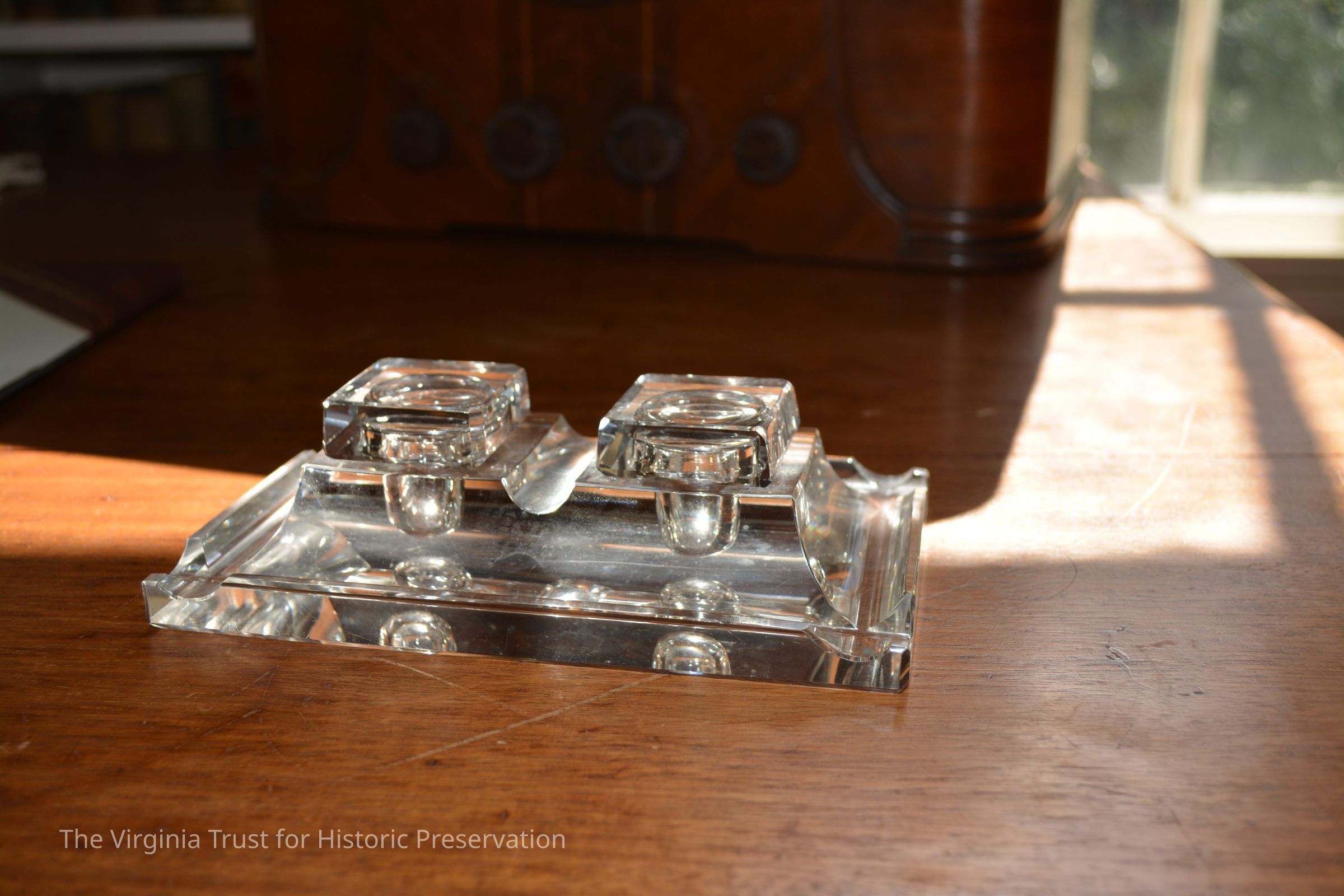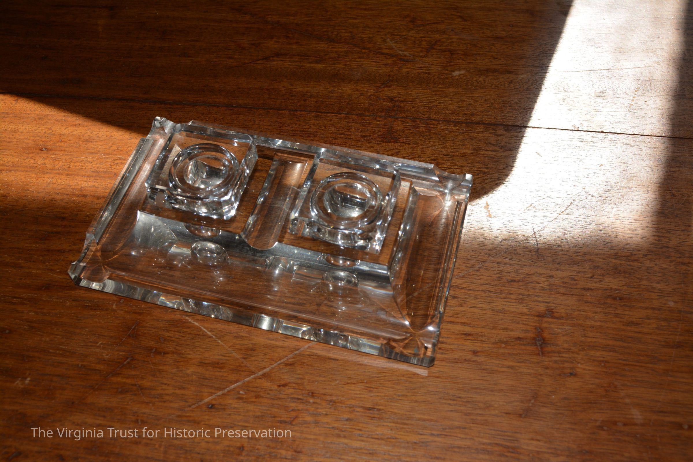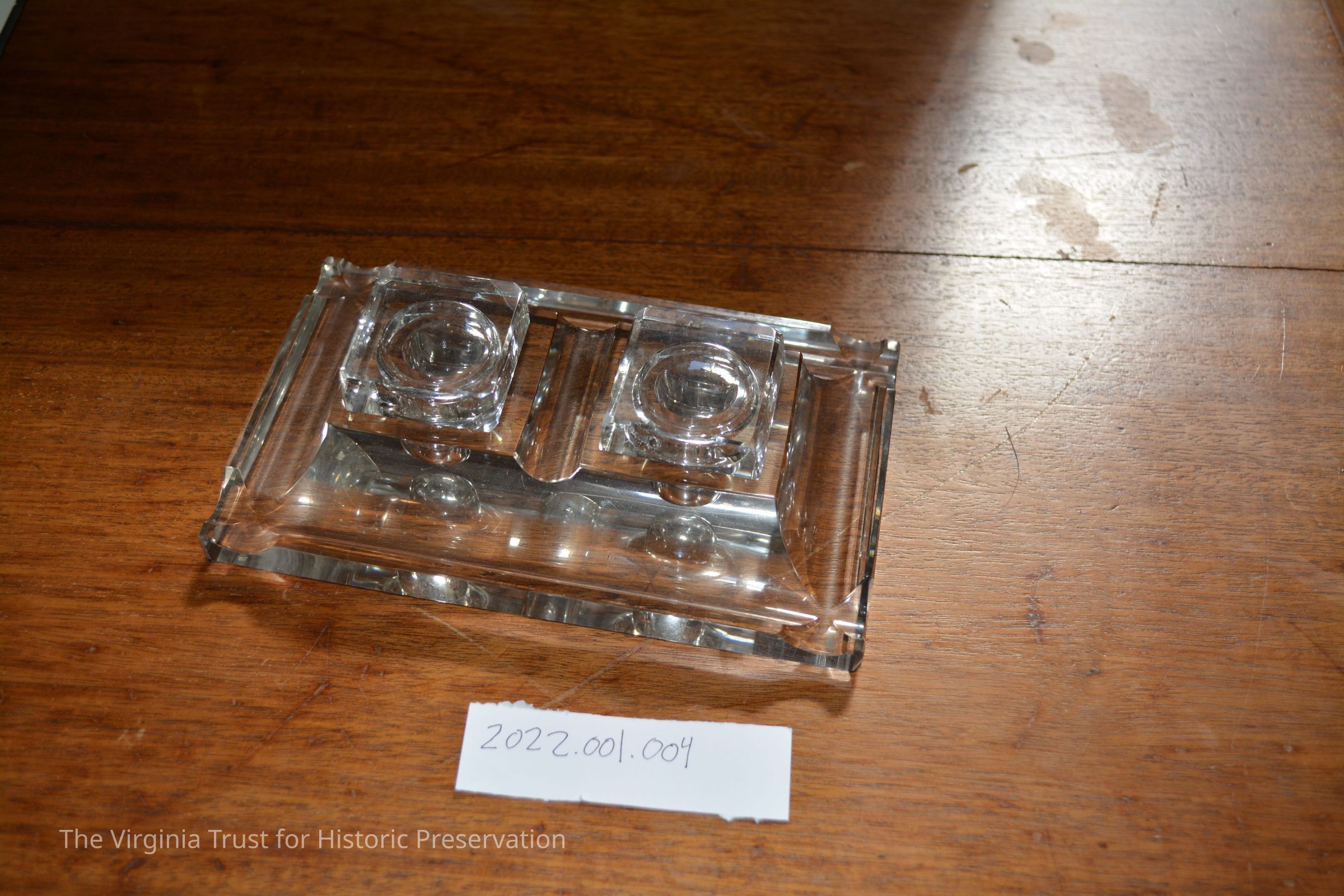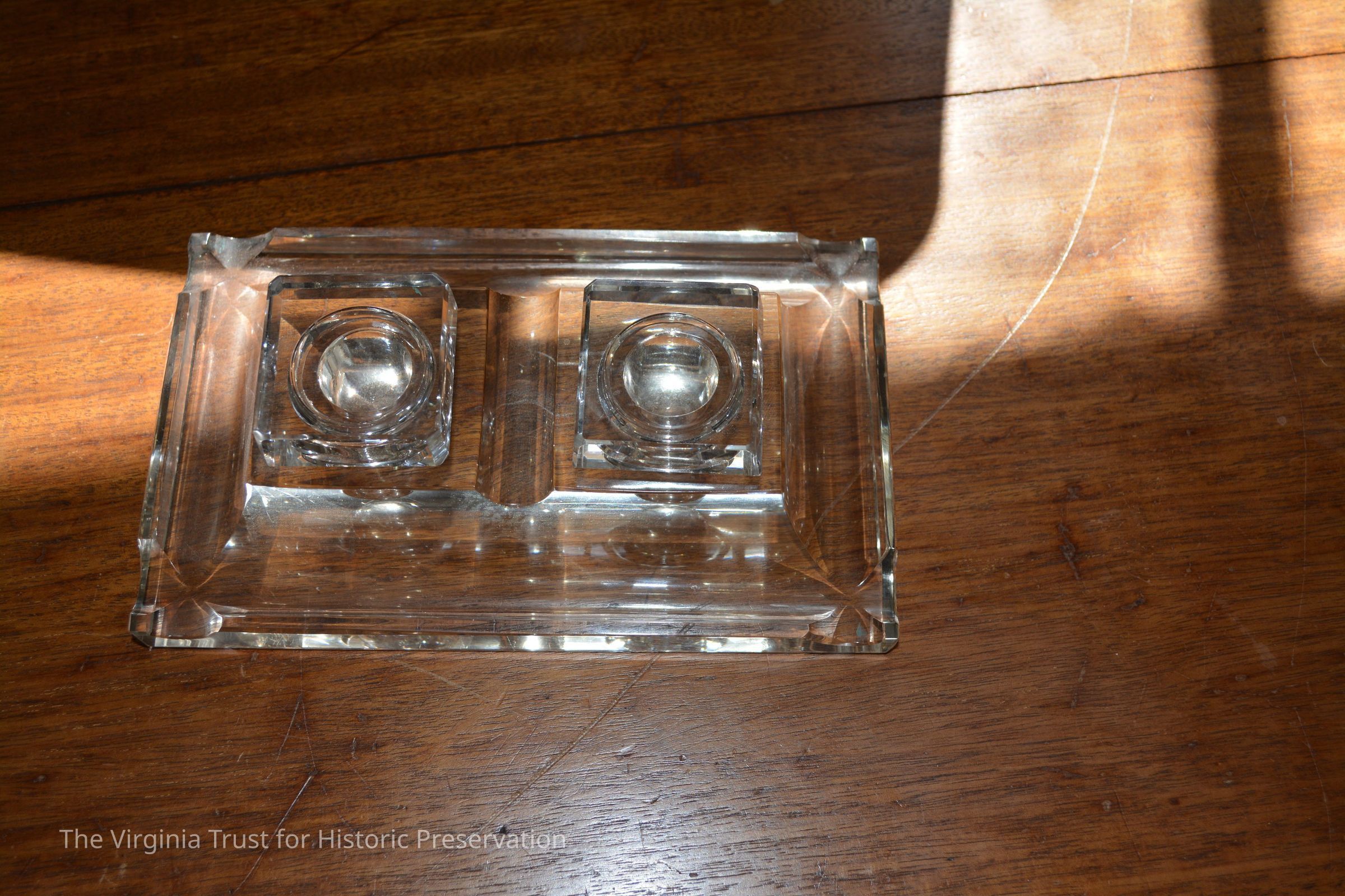 Cut glass double inkwell contains two separate compartments, each with removable glass caps. Art Deco style. There is a pen tray area on either side of the inkwell.Dimensions