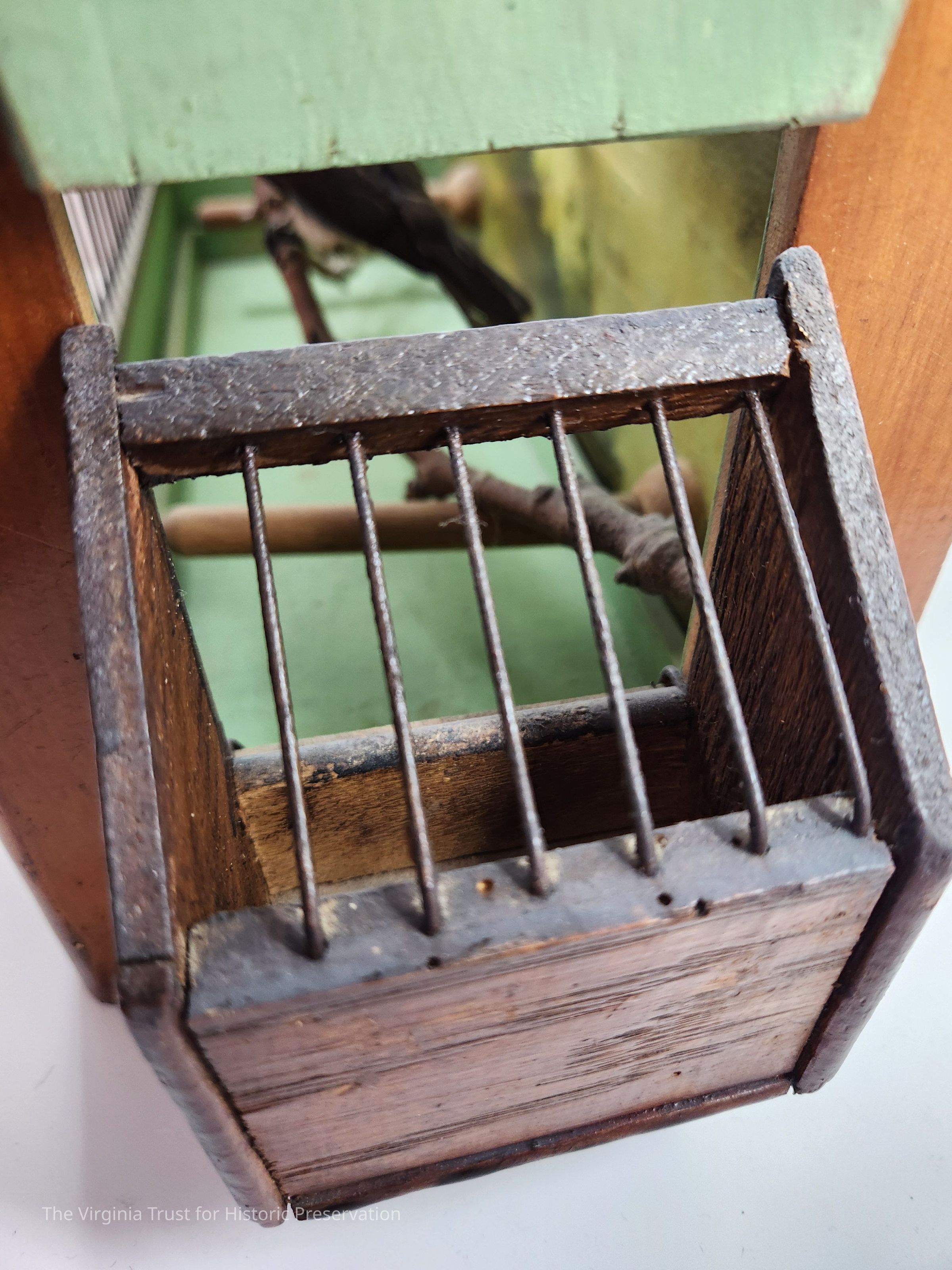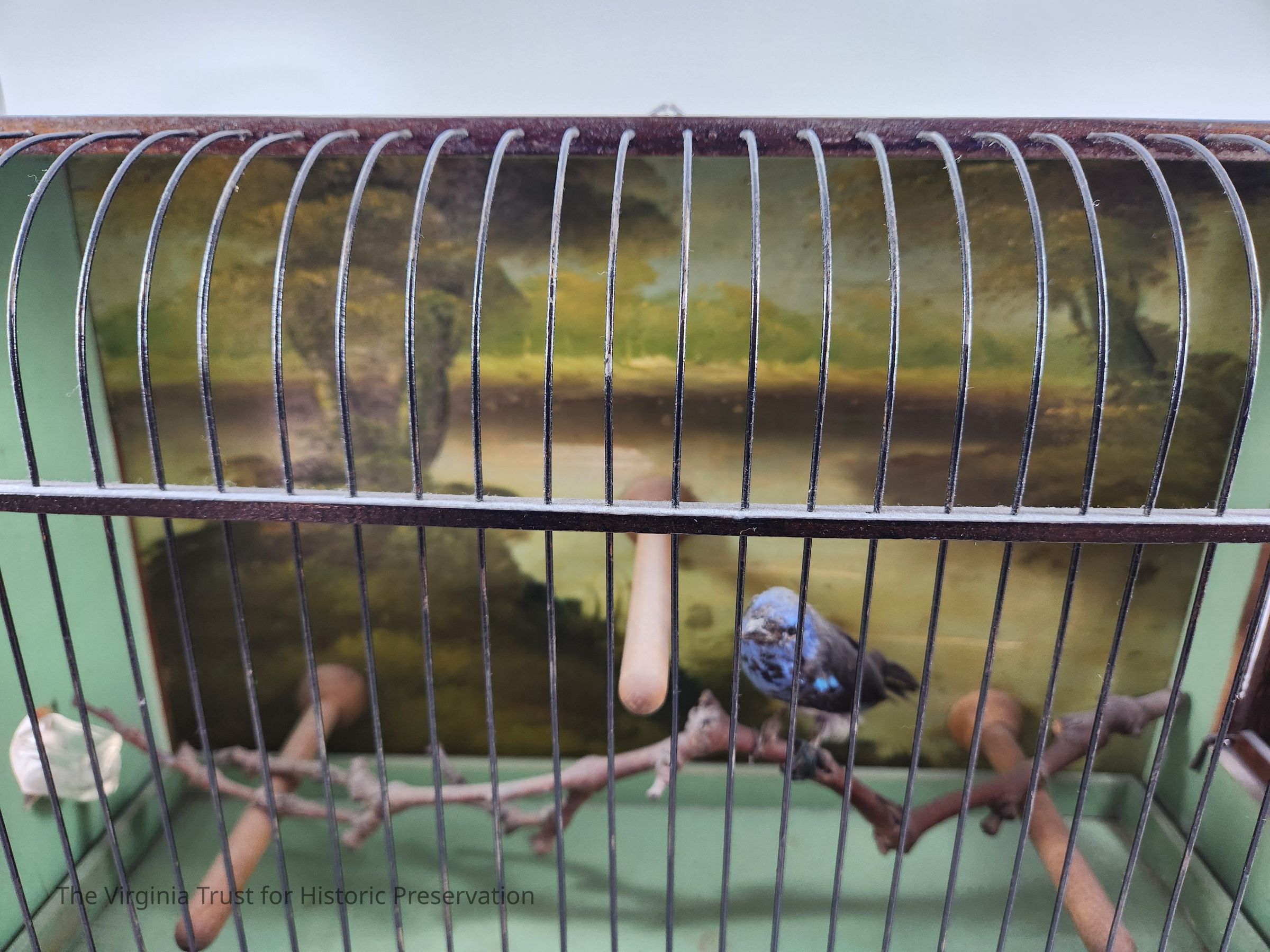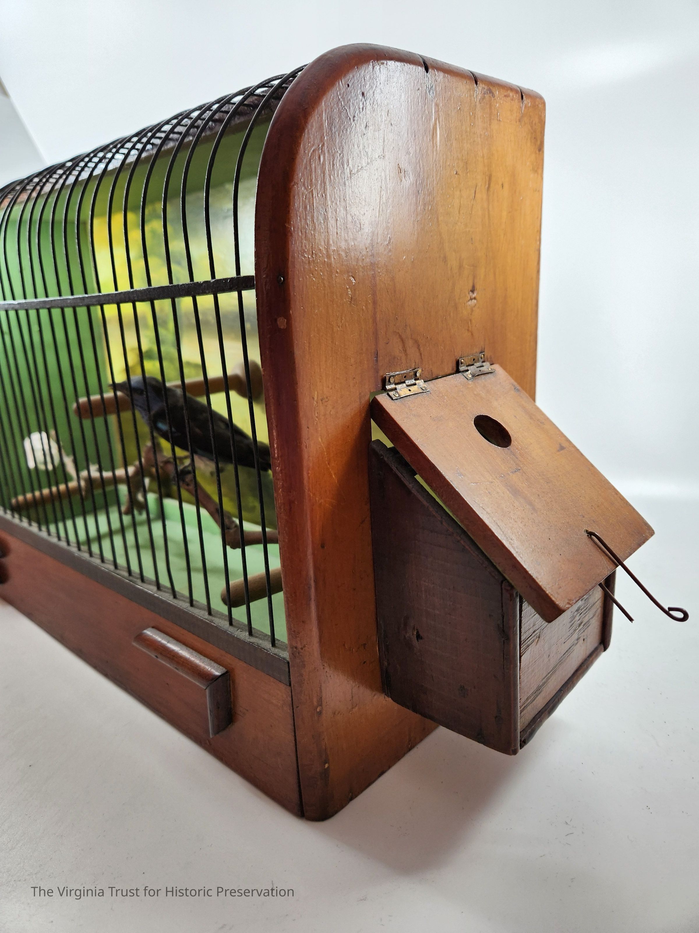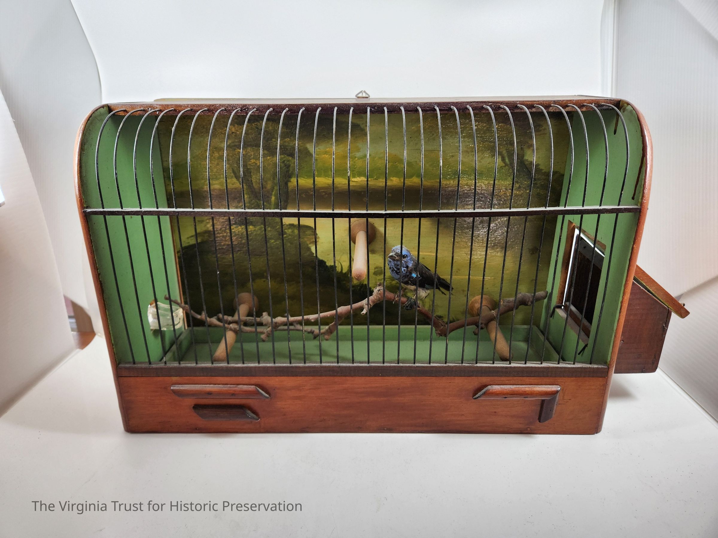 Late nineteenth century mahogany Dutch bird cage. Painted landscape in background of cage. Includes a blue stuffed bird, waters bottle and seed box on each side. Back of cage slides off so one can dust the interior.Dimensions
