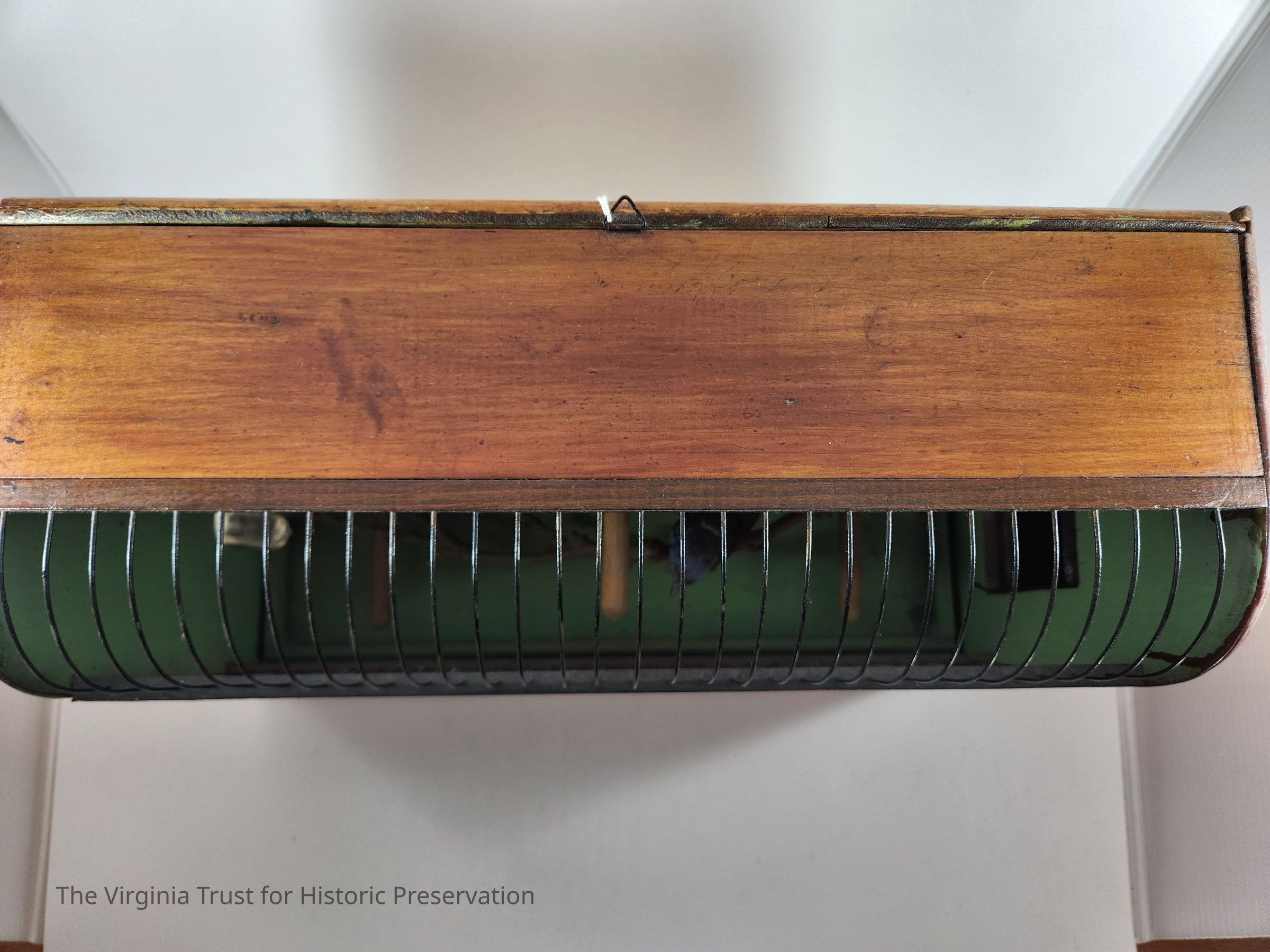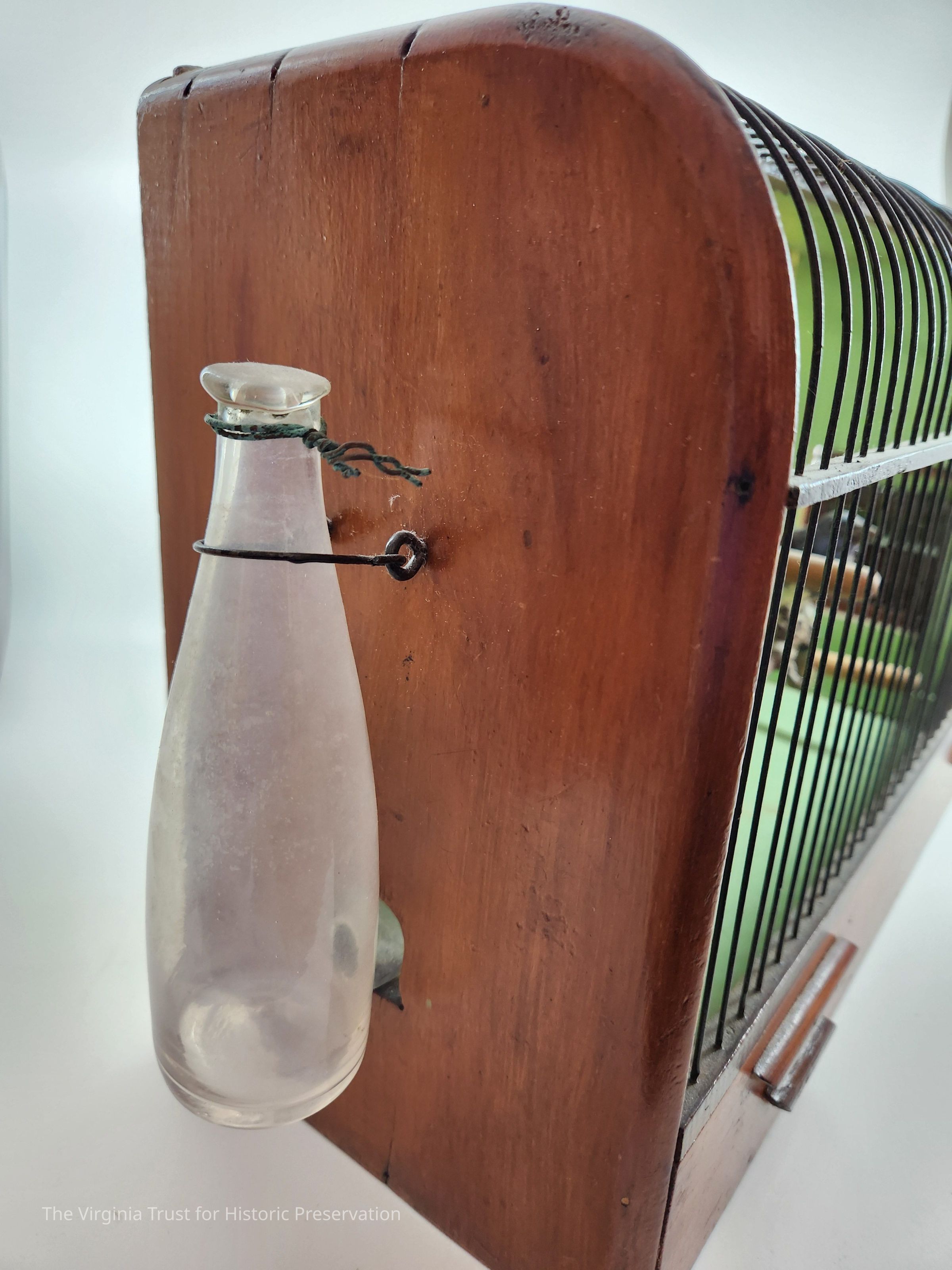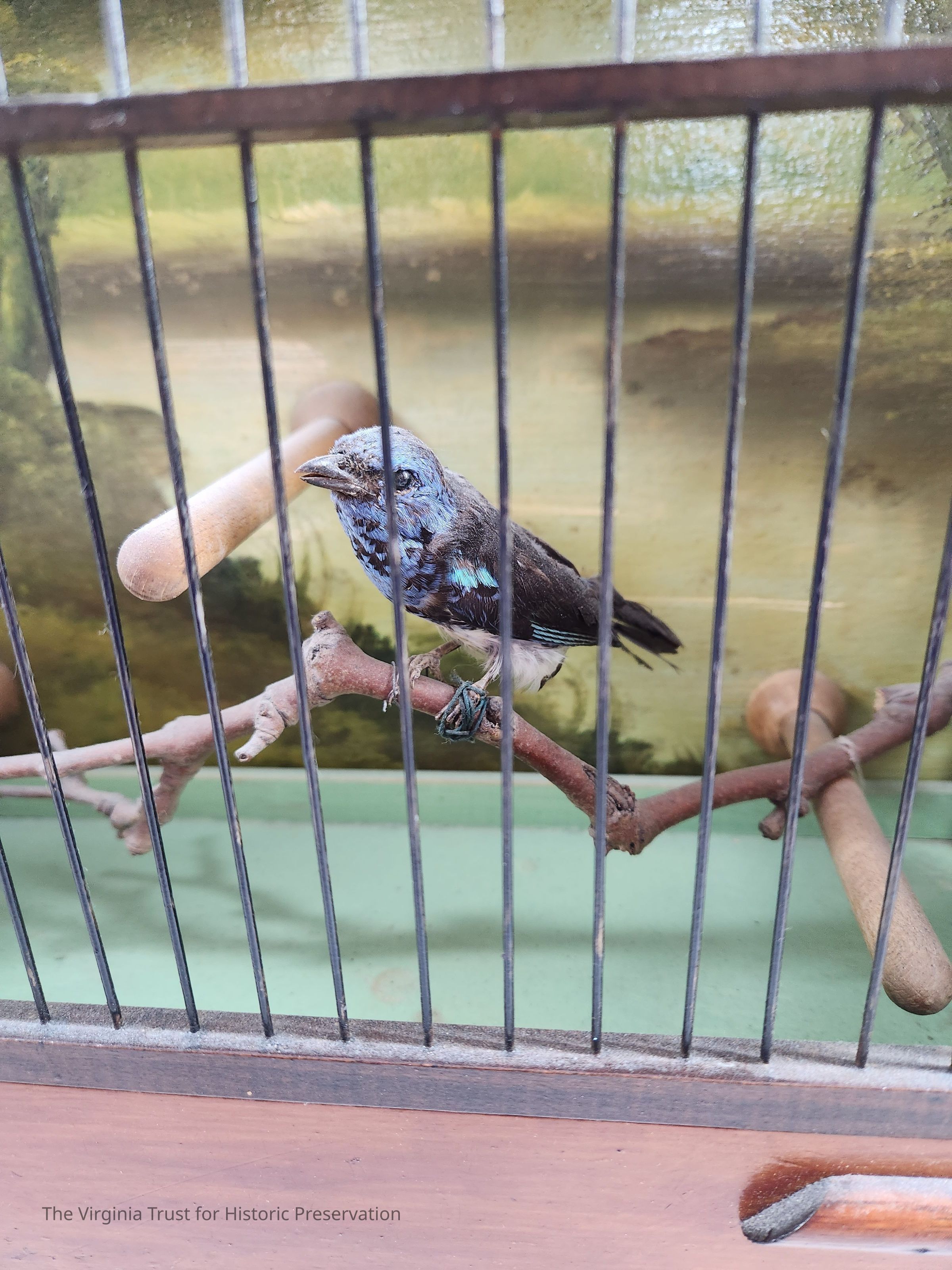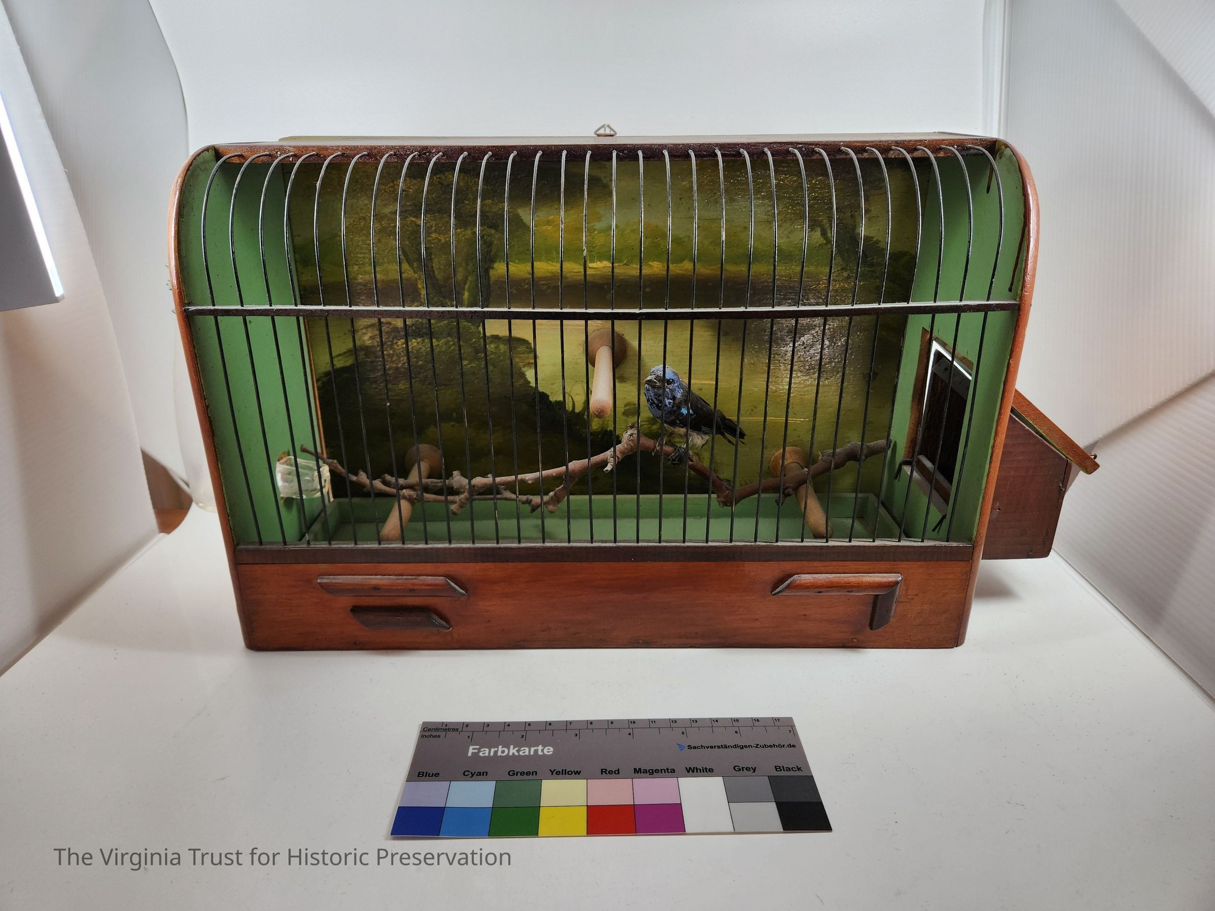 Late nineteenth century mahogany Dutch bird cage. Painted landscape in background of cage. Includes a blue stuffed bird, waters bottle and seed box on each side. Back of cage slides off so one can dust the interior.Dimensions