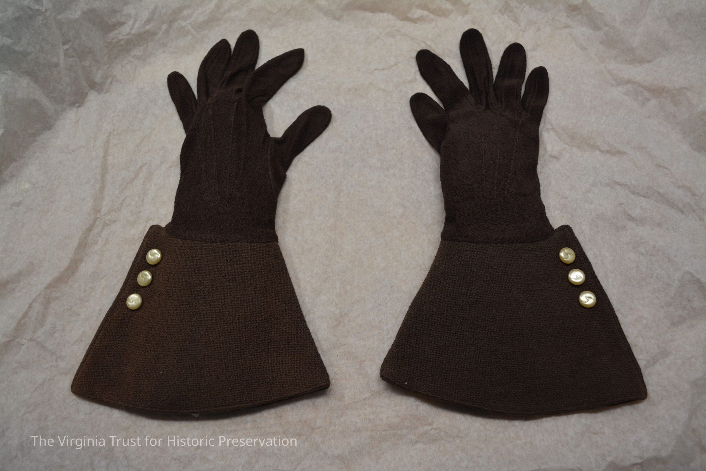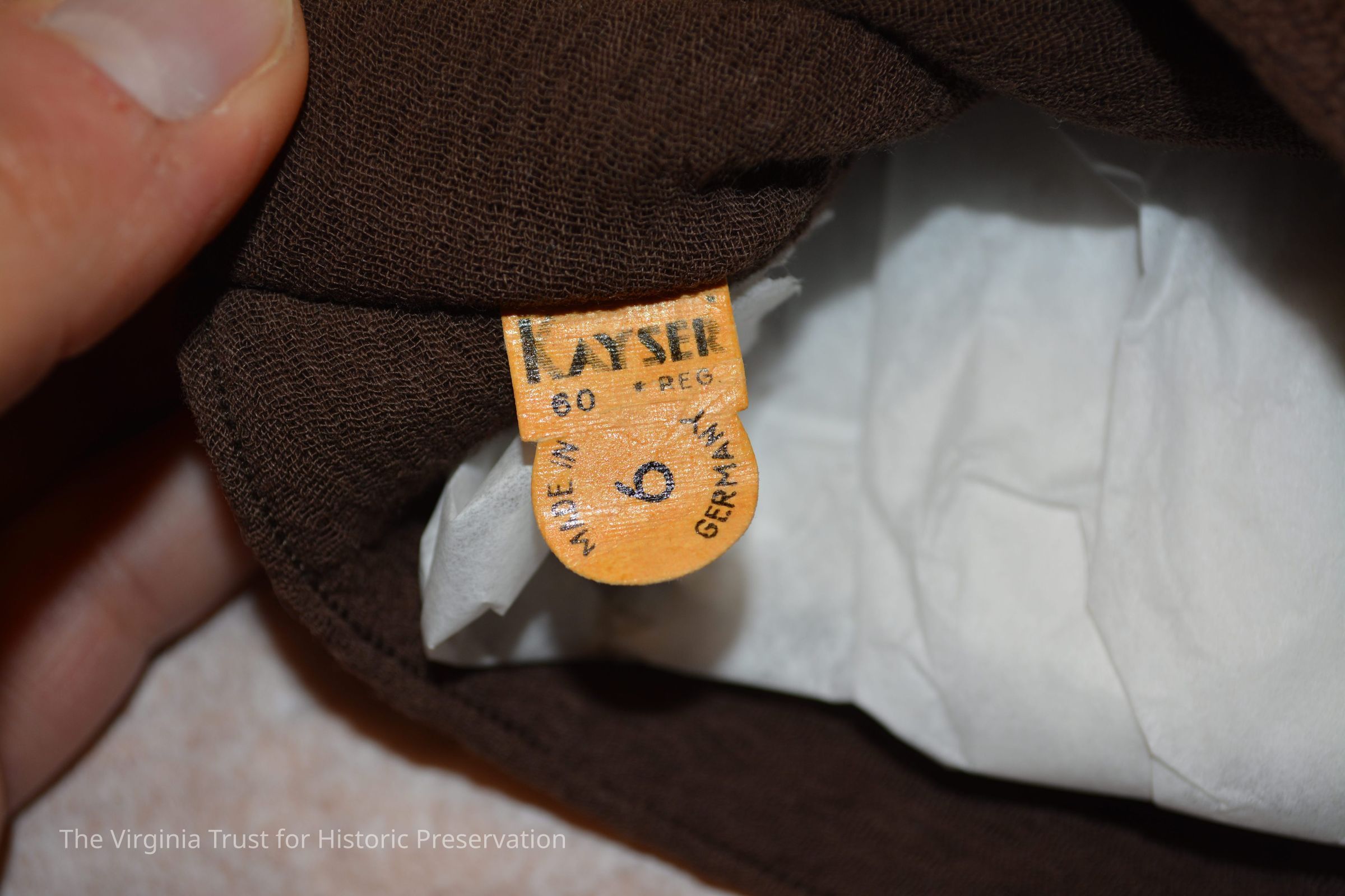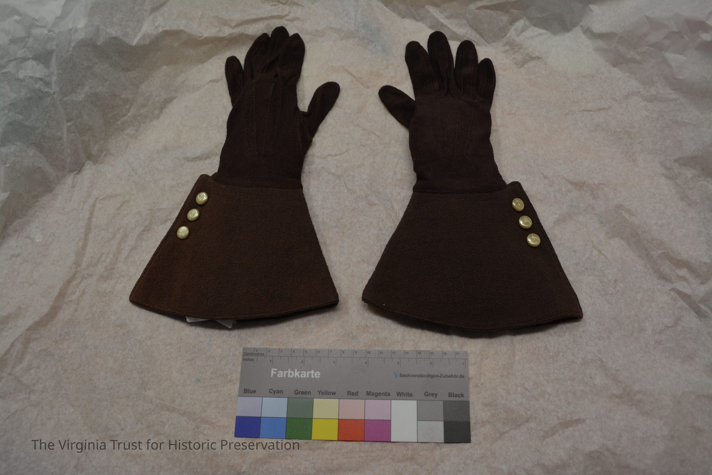 Pair of brown wrist-length gloves. Two halves were made separately and later sewed together. Three plastic buttons on each glove. Yellow tag located on the inside of the right glove reads "Made in Germany" with a "6" in the middle, "Kayser" at the top with "60" and "Reg" under.