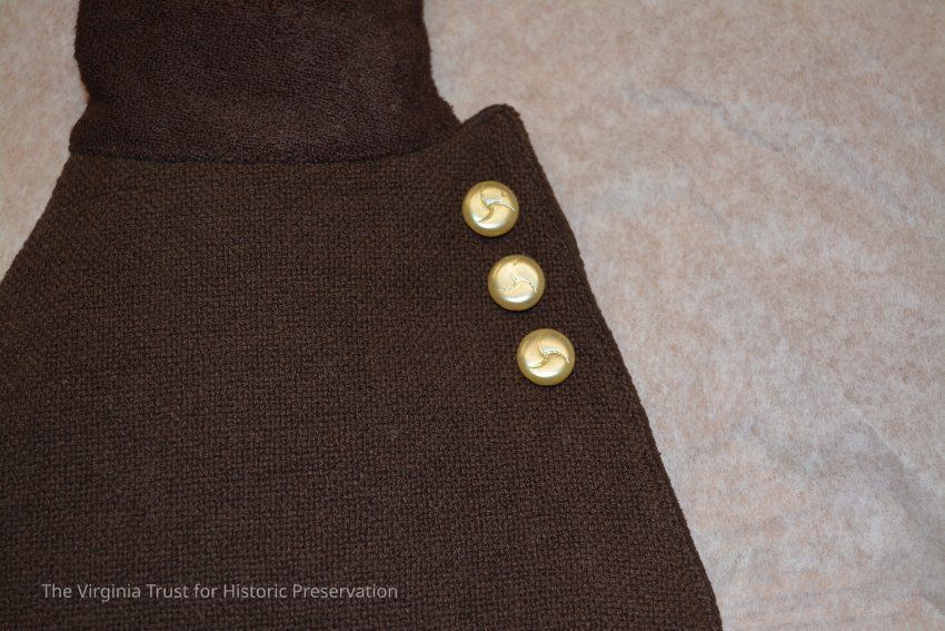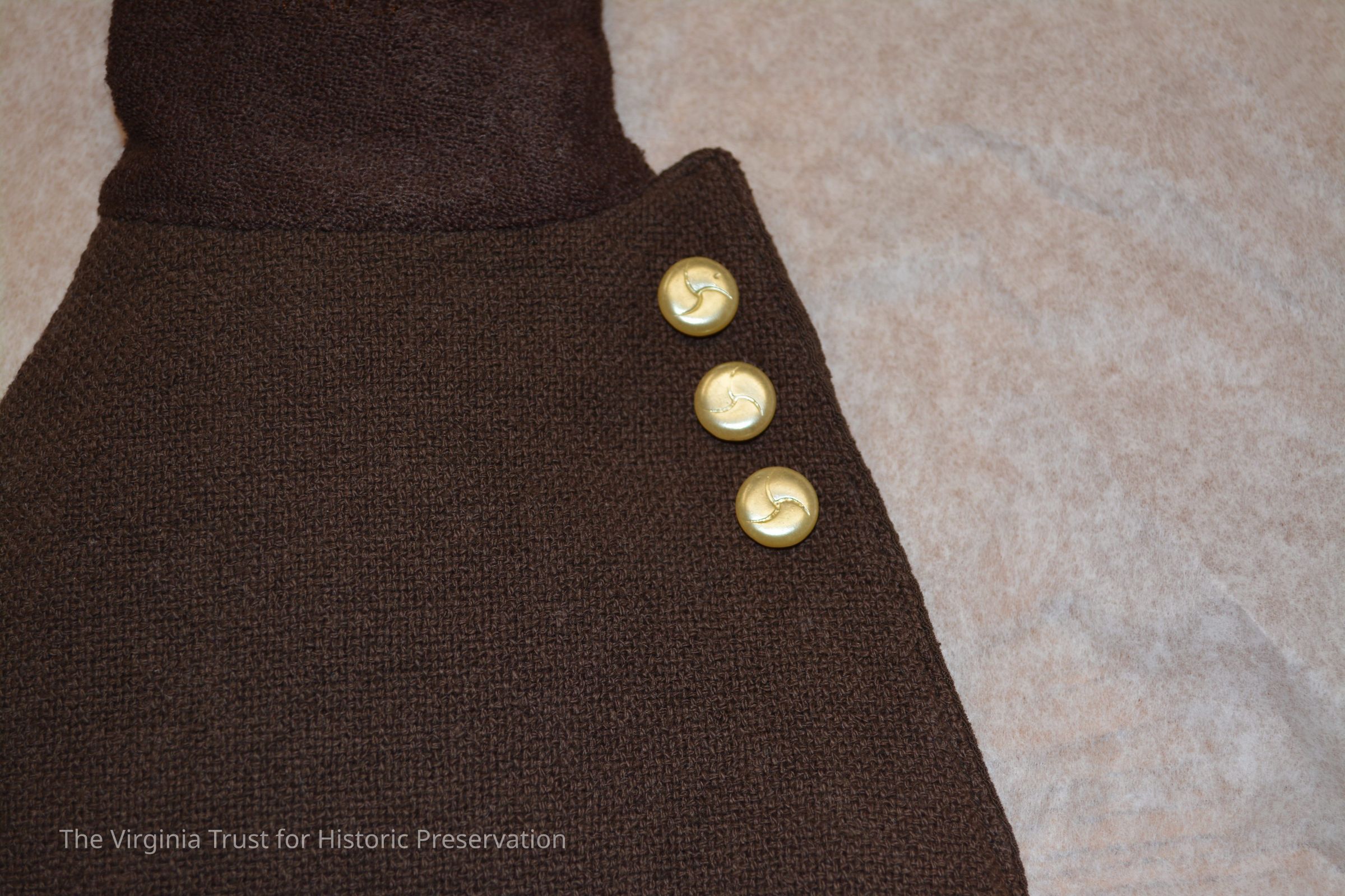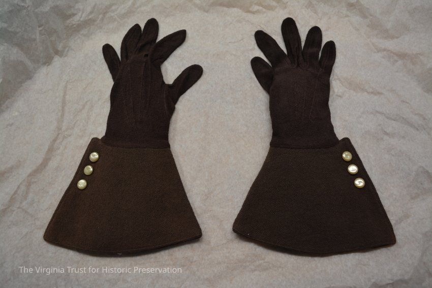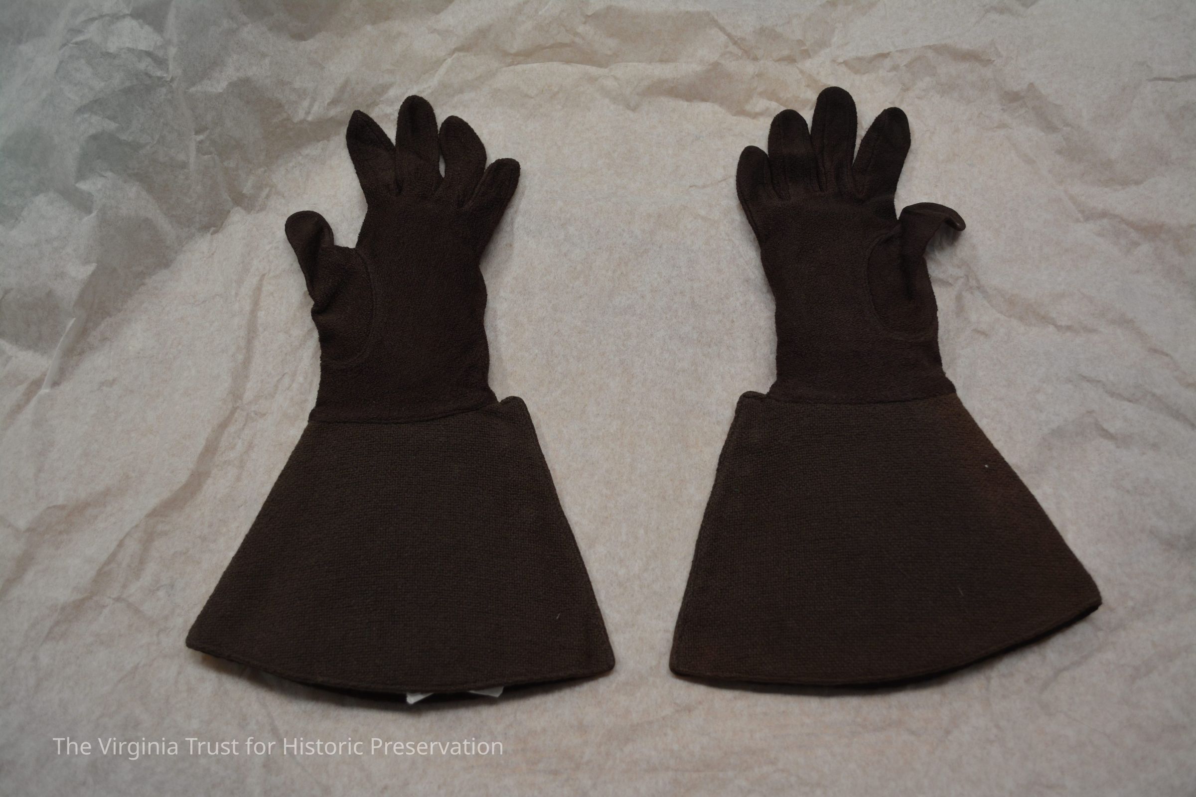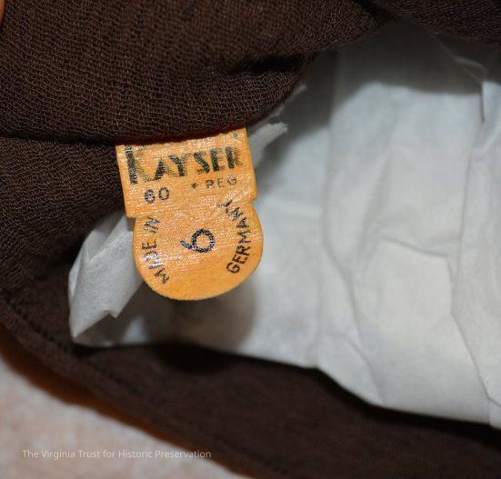 Pair of brown wrist-length gloves. Two halves were made separately and later sewed together. Three plastic buttons on each glove. Yellow tag located on the inside of the right glove reads "Made in Germany" with a "6" in the middle, "Kayser" at the top with "60" and "Reg" under.