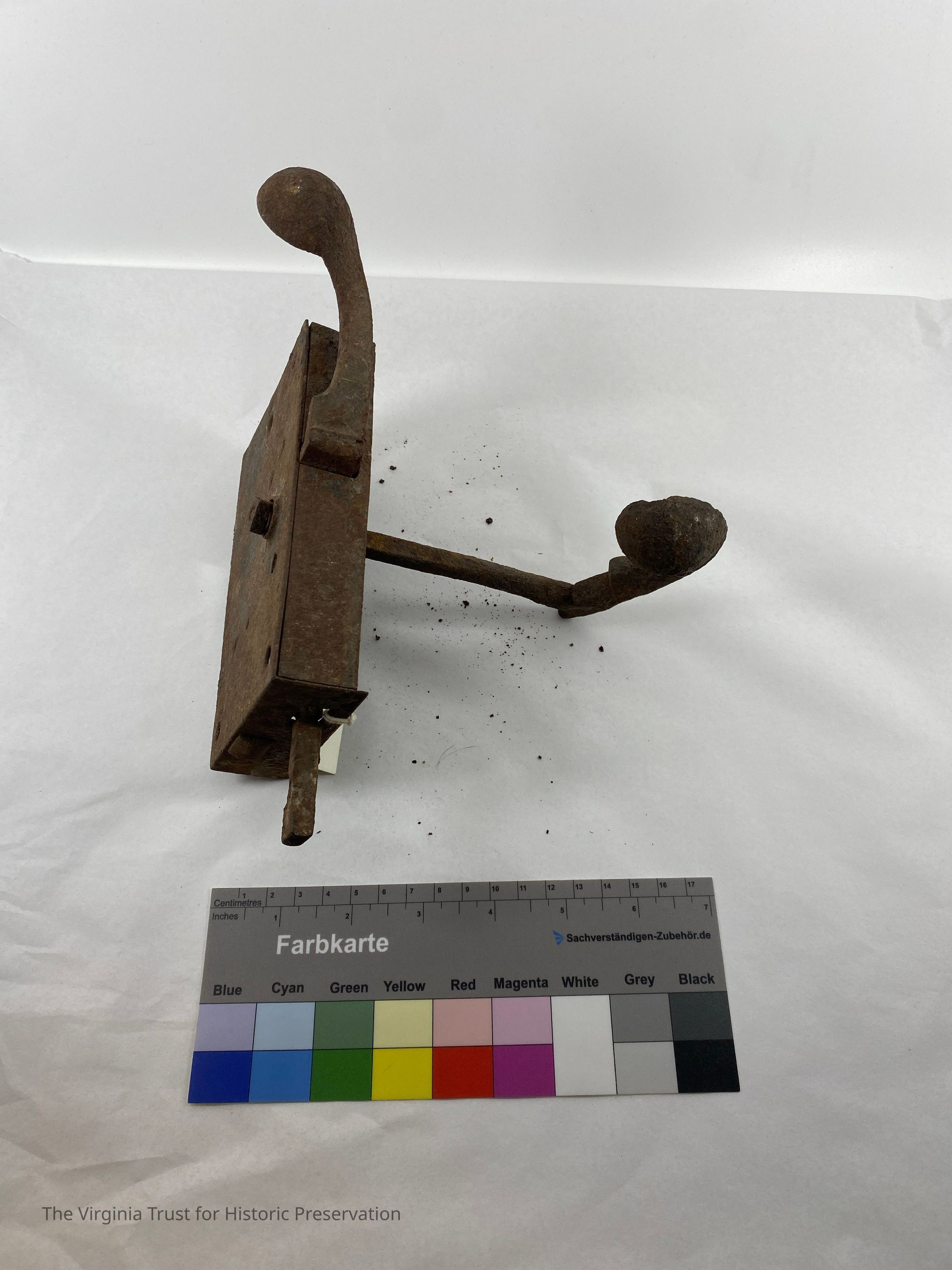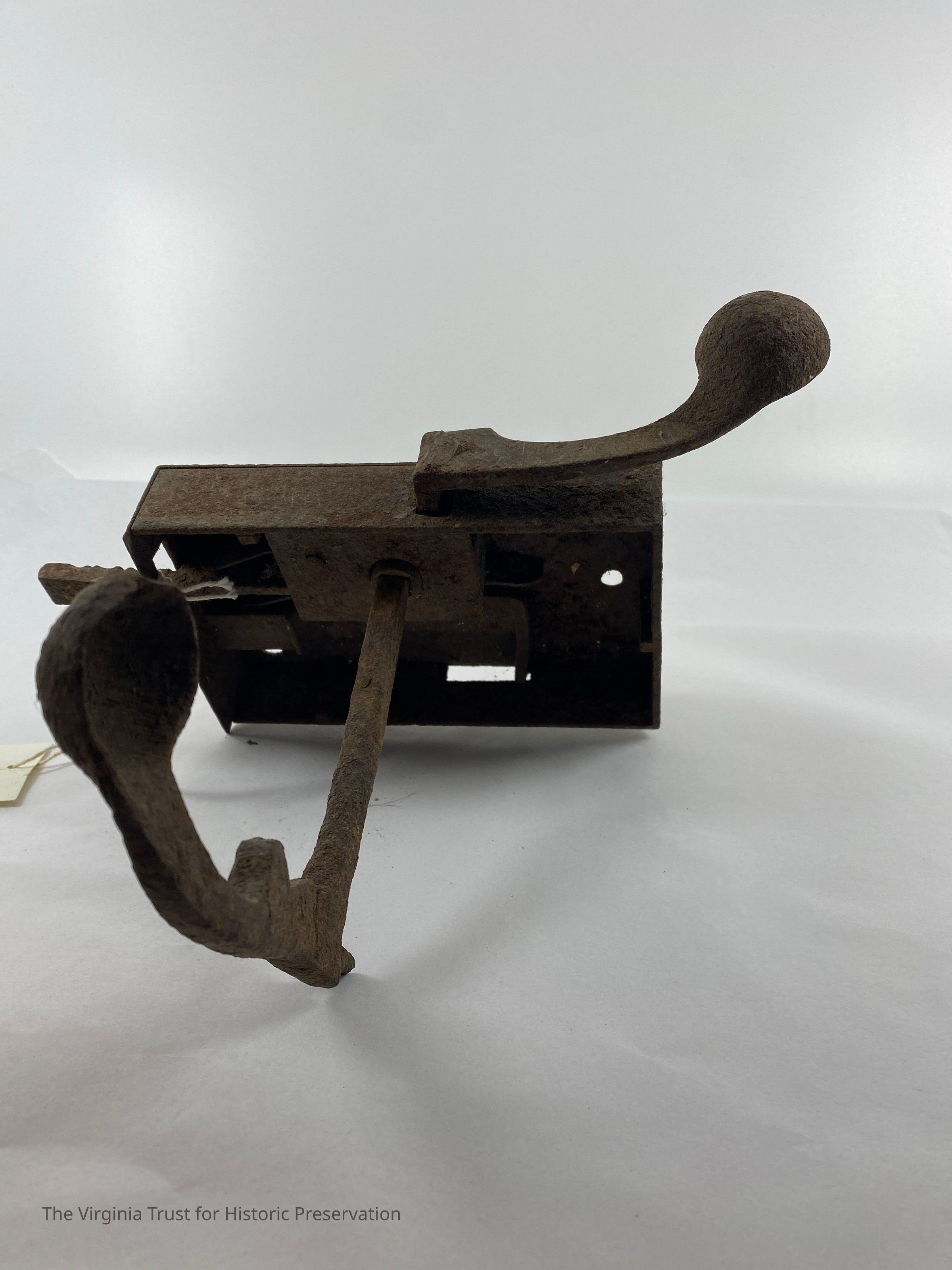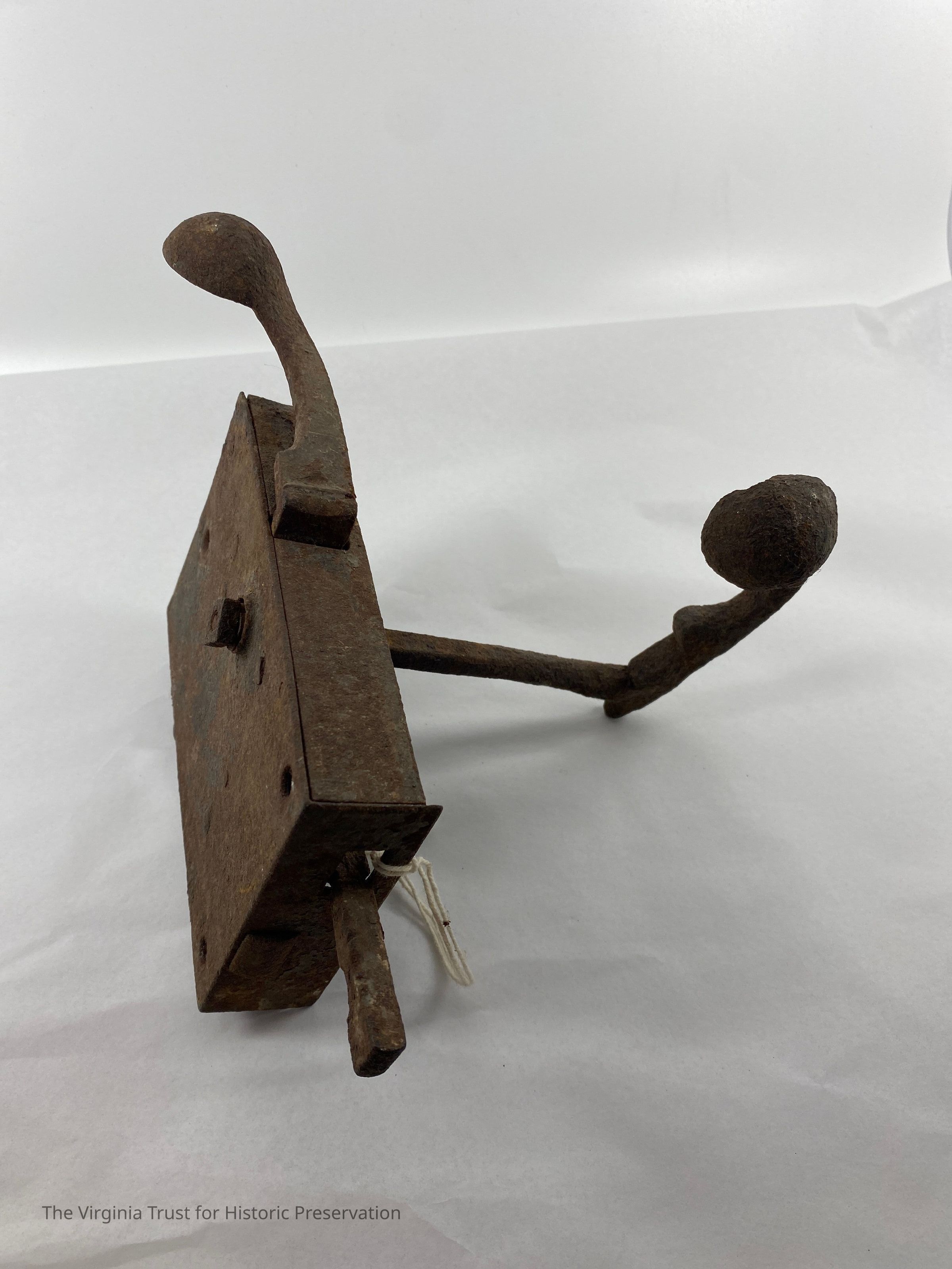 19th Century Door Lock. Made of cast iron. Interior and exterior handles that operate a latch. Deadbolt locks the door.