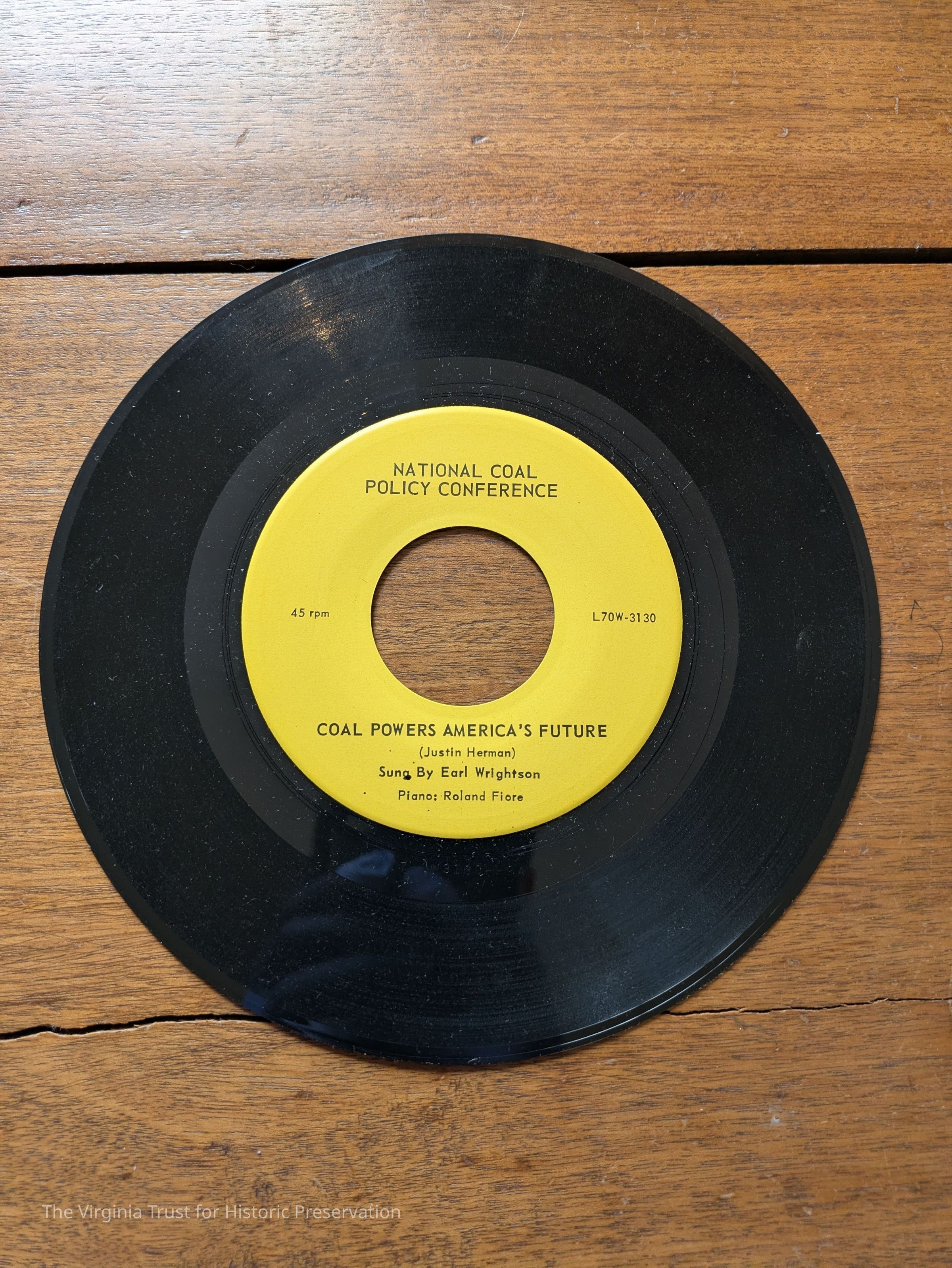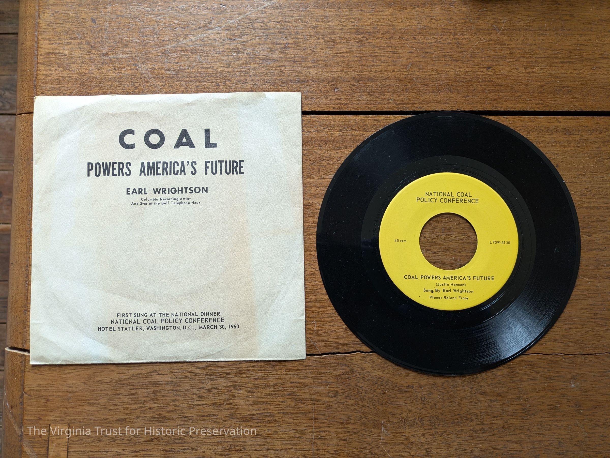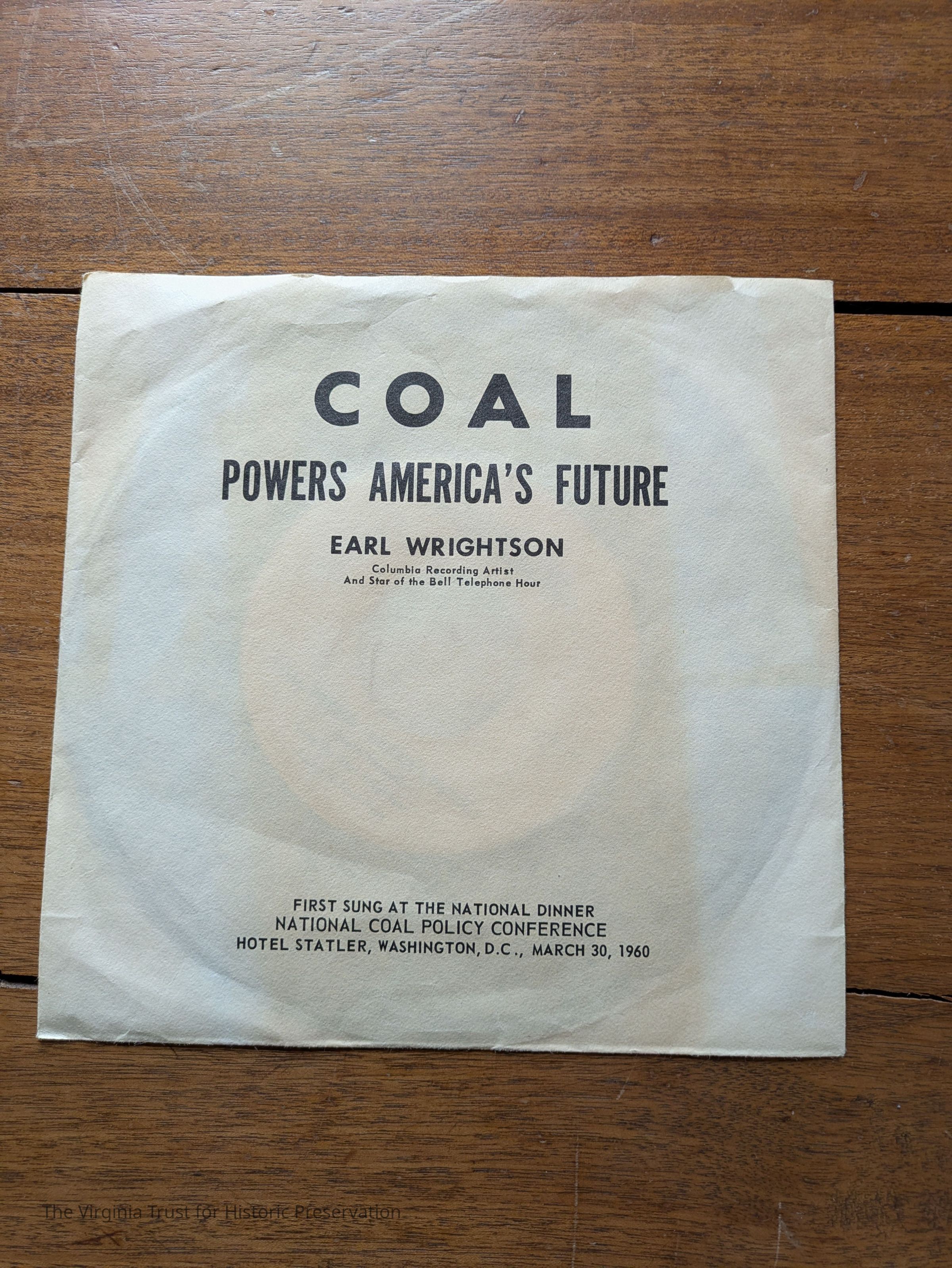 Phonographic record: "Coal Powers America's Future" sung by Earl Wrightson. 45 RPM. Enclosed in original sleeve.
