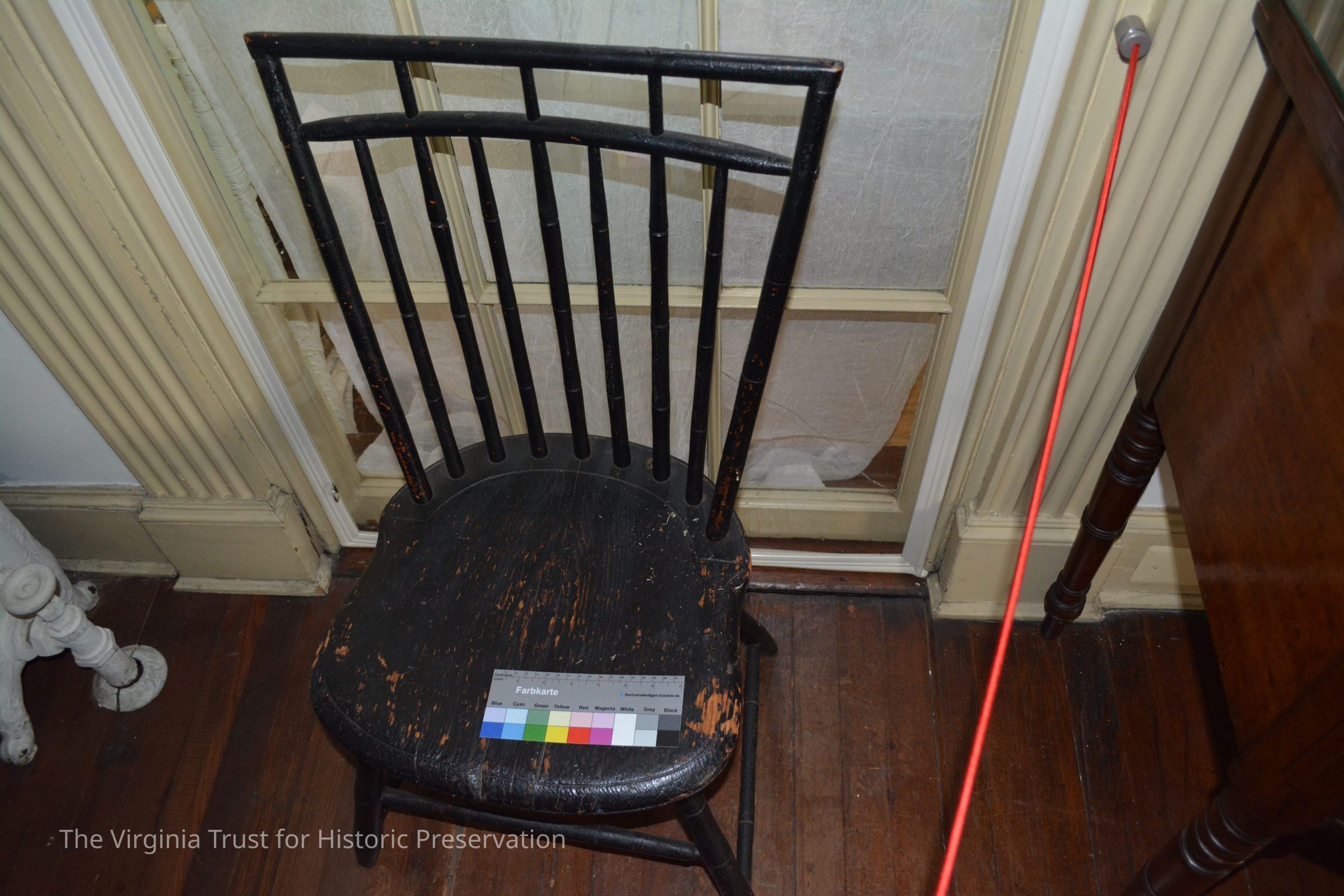 Small black painted Windsor chair. Rough grain seat. 9 spindles on the back. One of a pair.