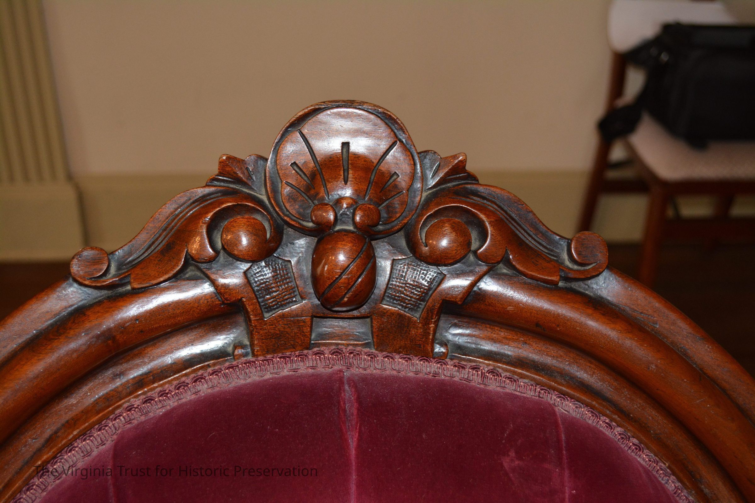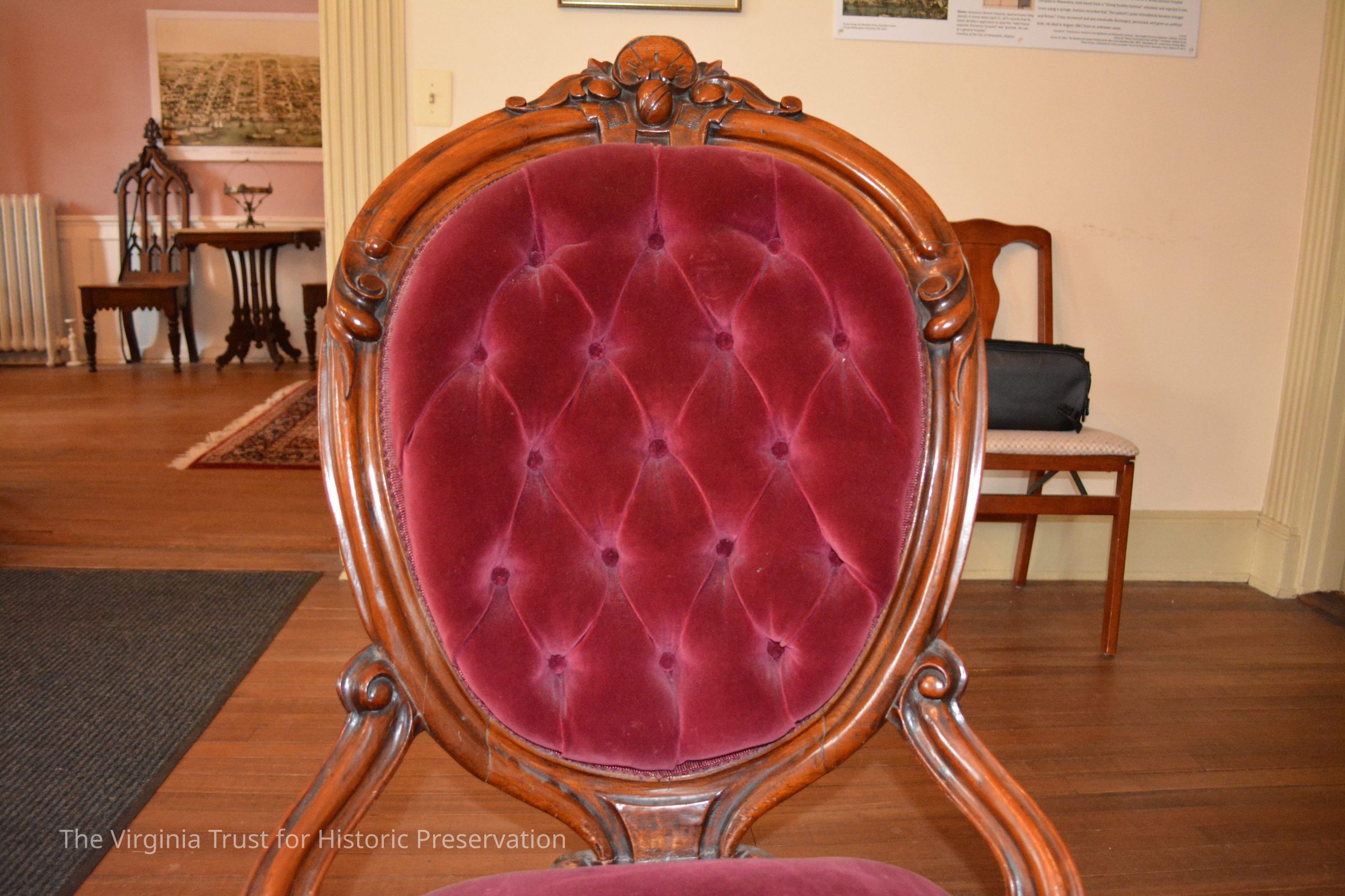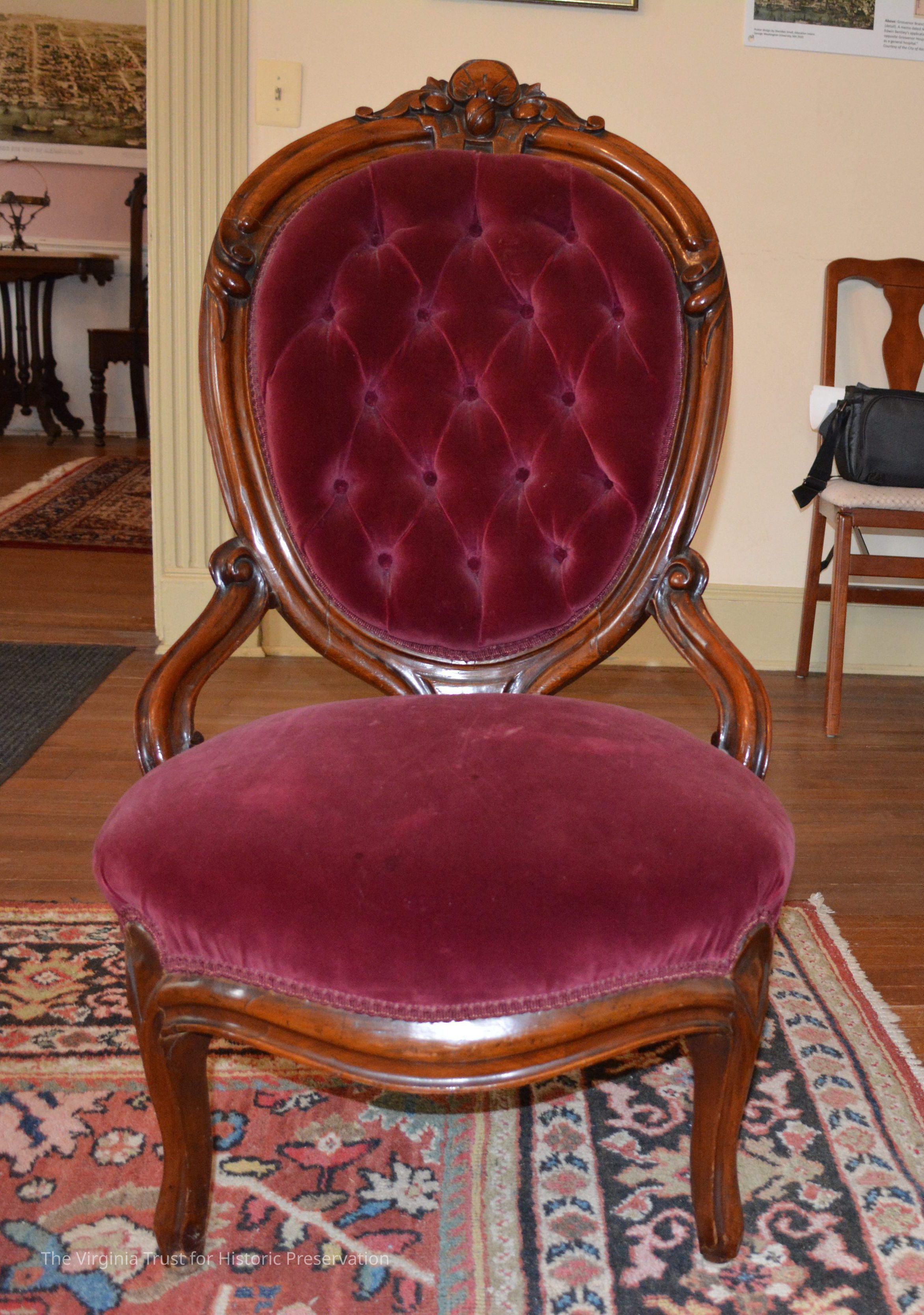 One piece of a Victorian parlor set that includes his and her chairs and a loveseat. Original upholstery was black horse hair and was then reupholstered in the 1970s to the cranberry velvet still present.Dimensions