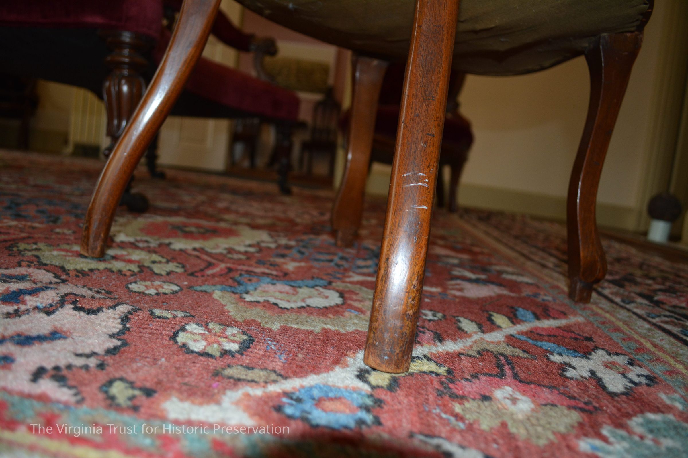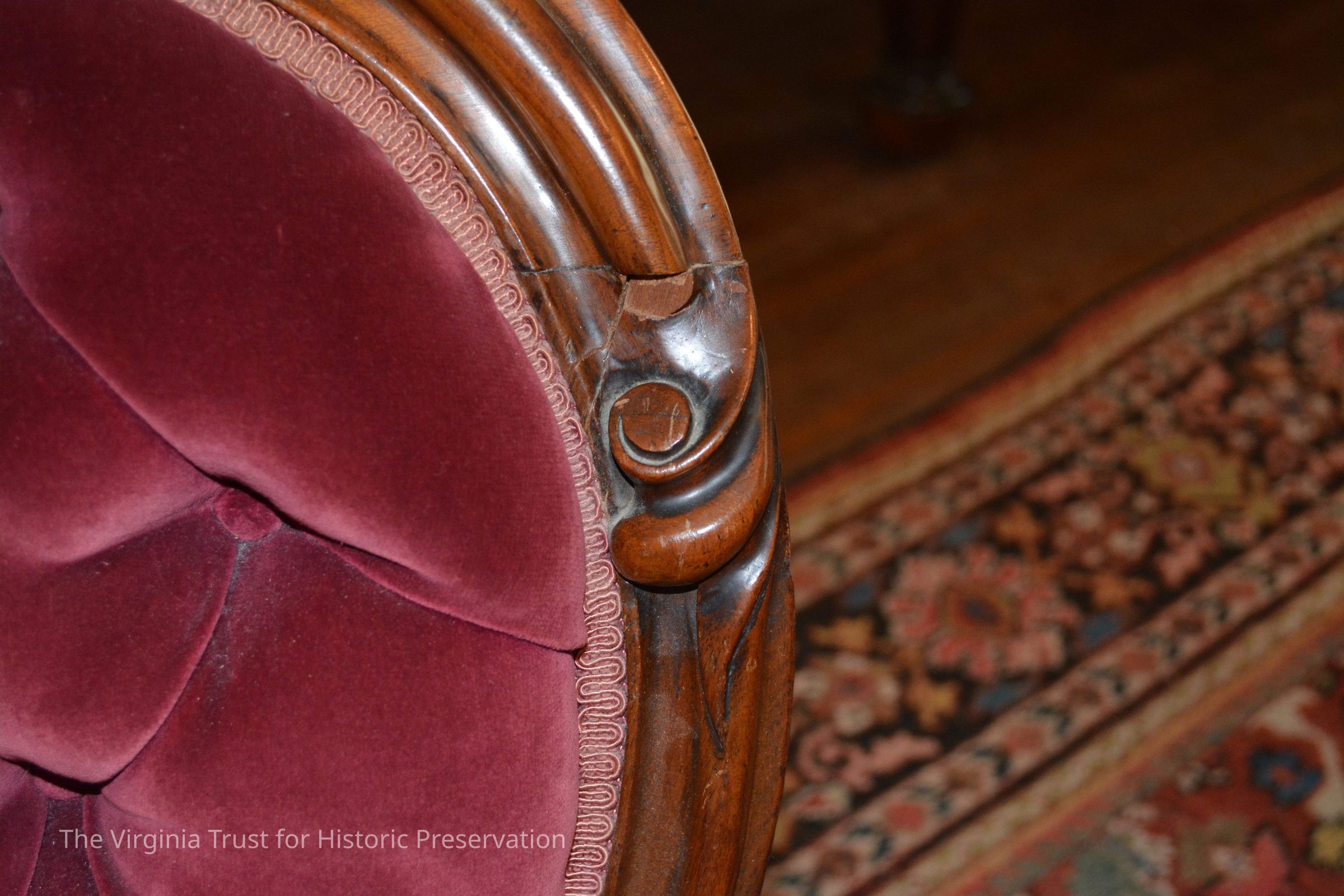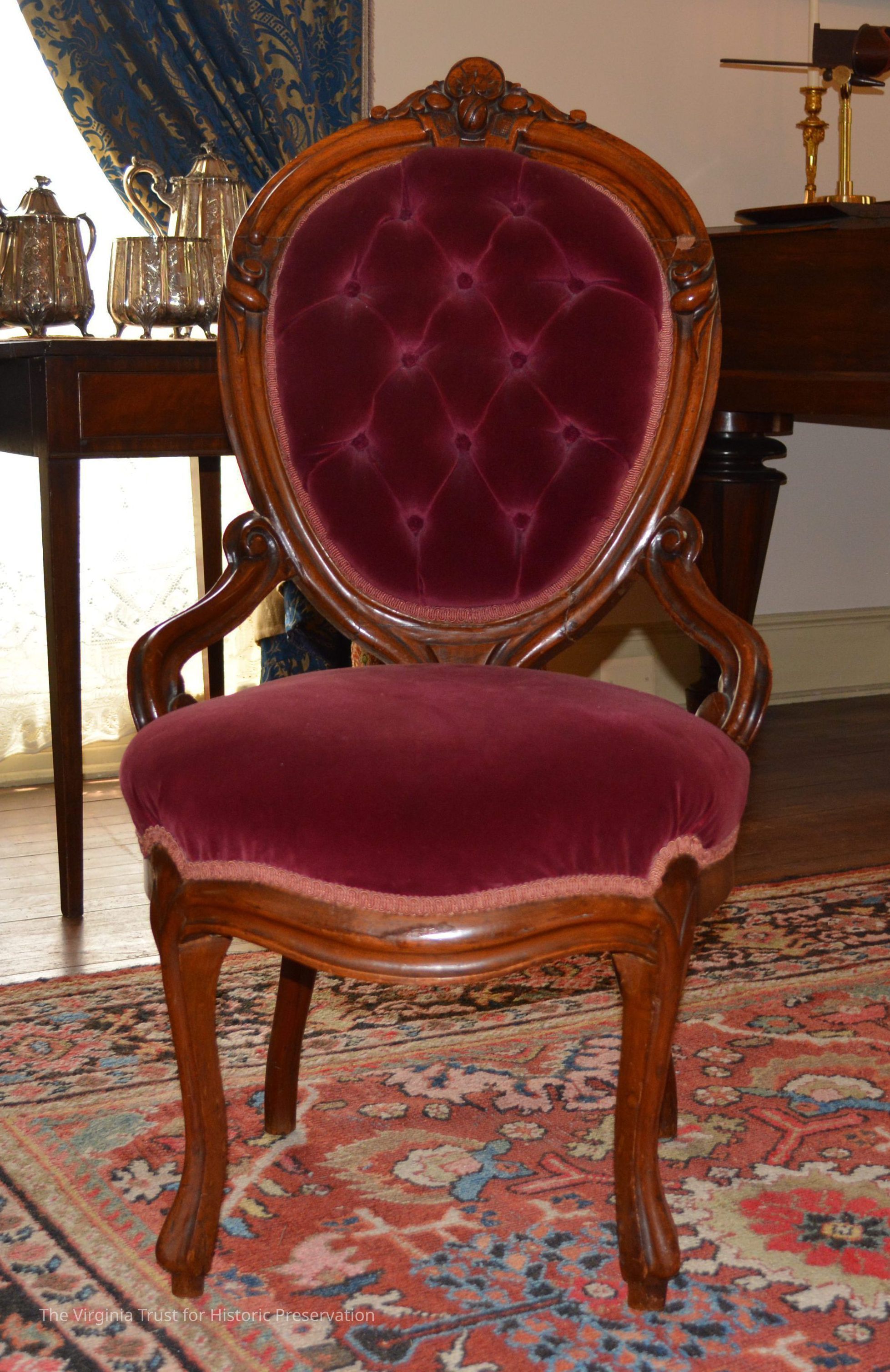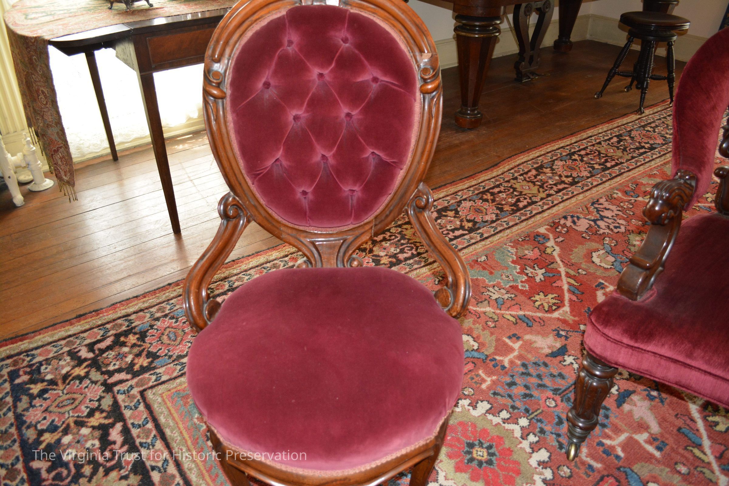 One piece of a Victorian parlor set that includes his and her chairs and a loveseat. Red velvet button back upholstery is not original. The front legs of this chair are raised to be balanced with the back legs. There is a crack on the right side of the back rest.Dimensions