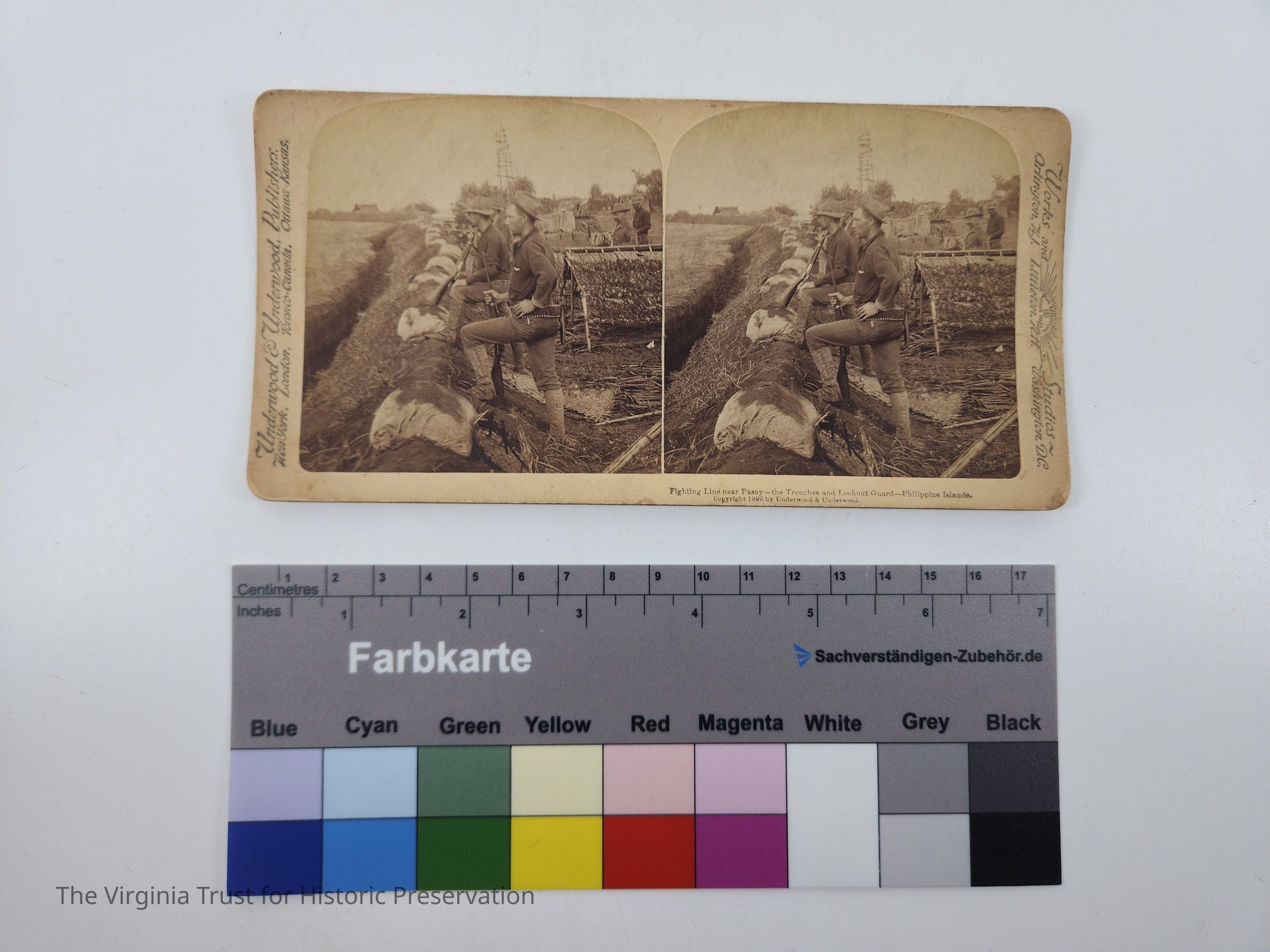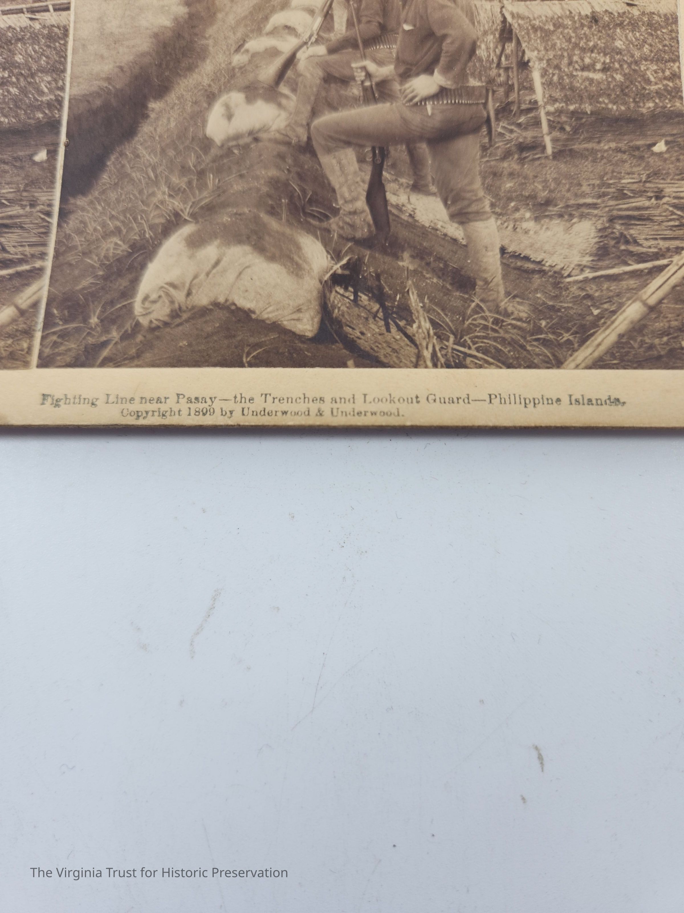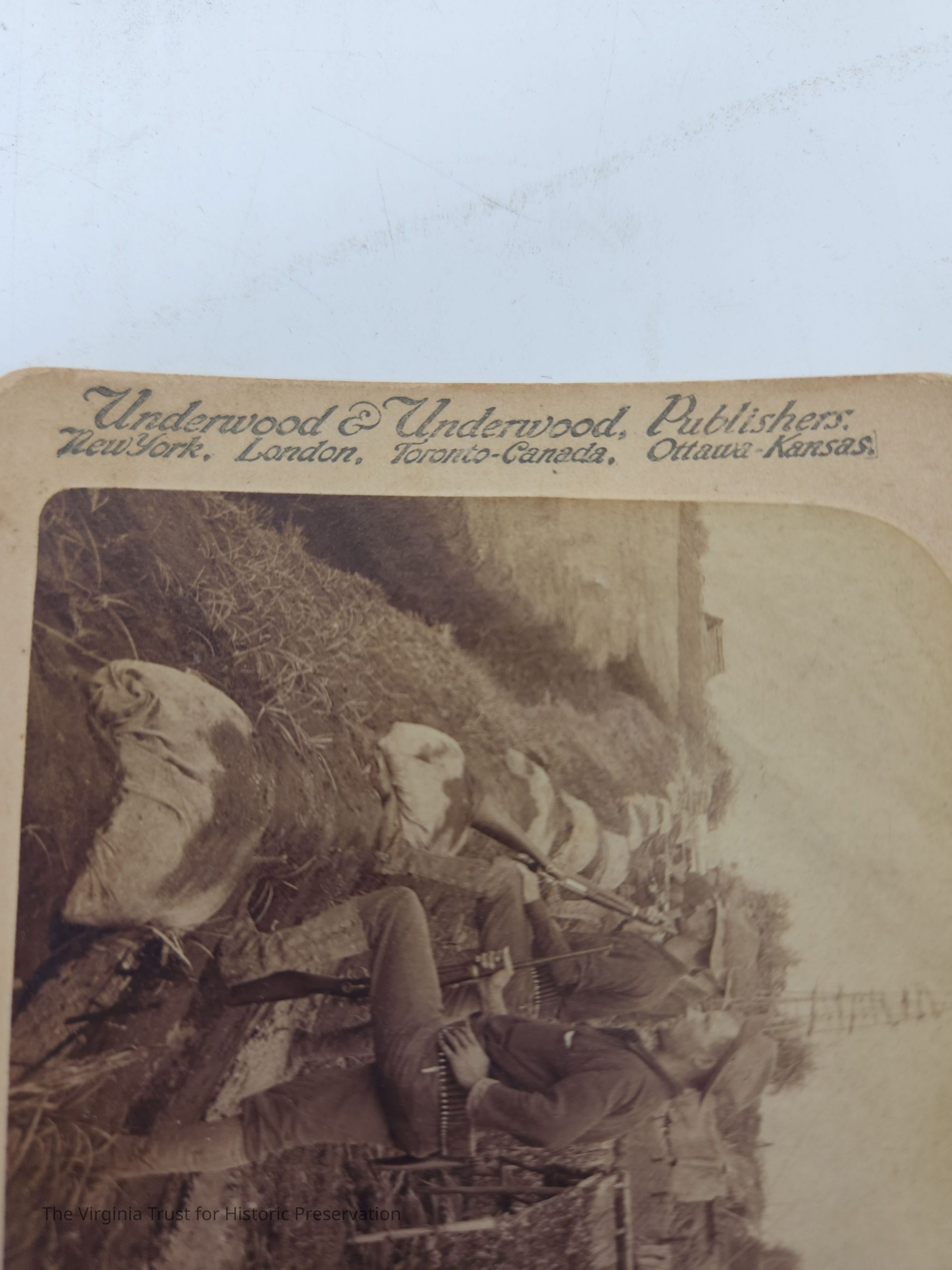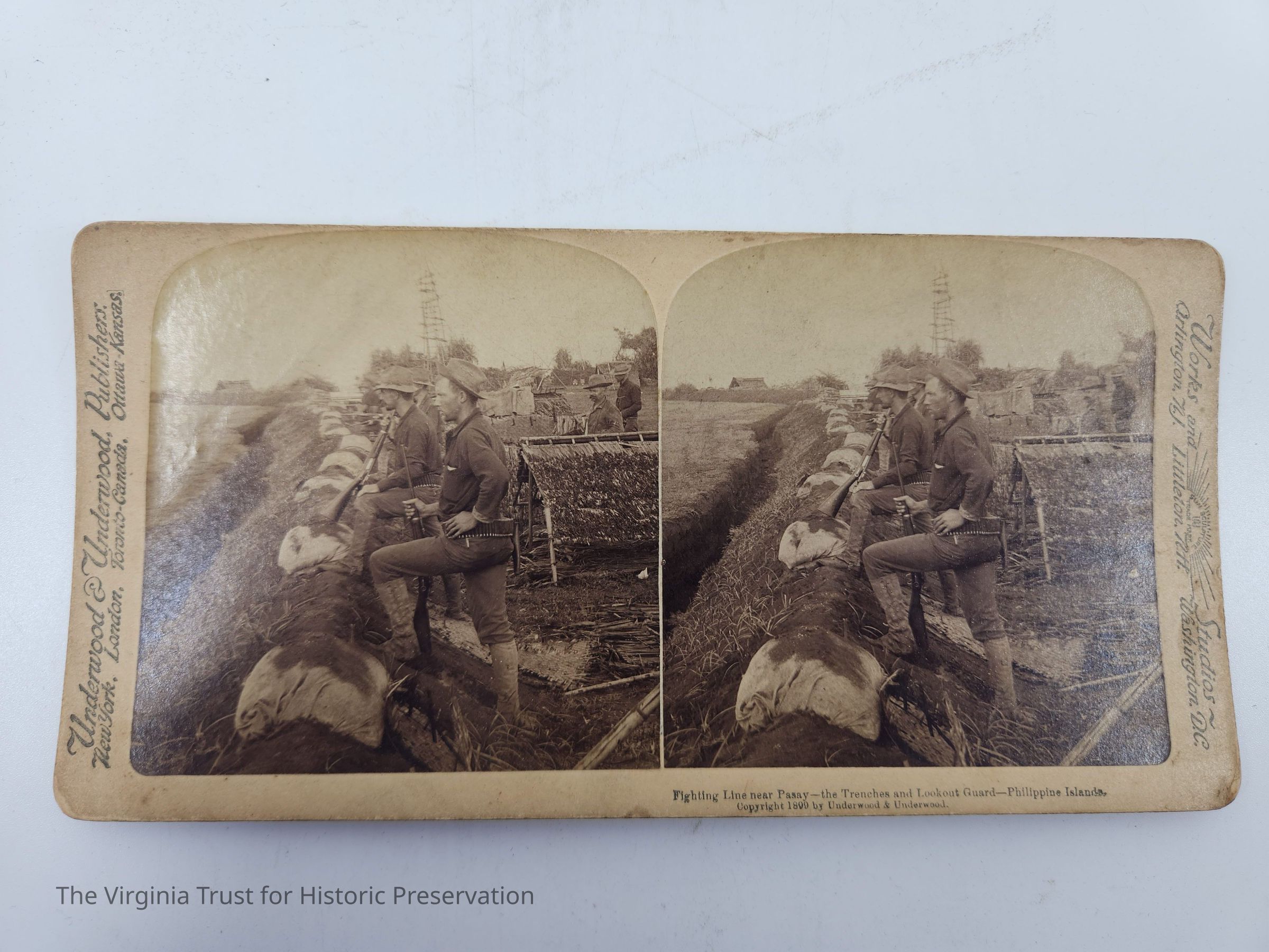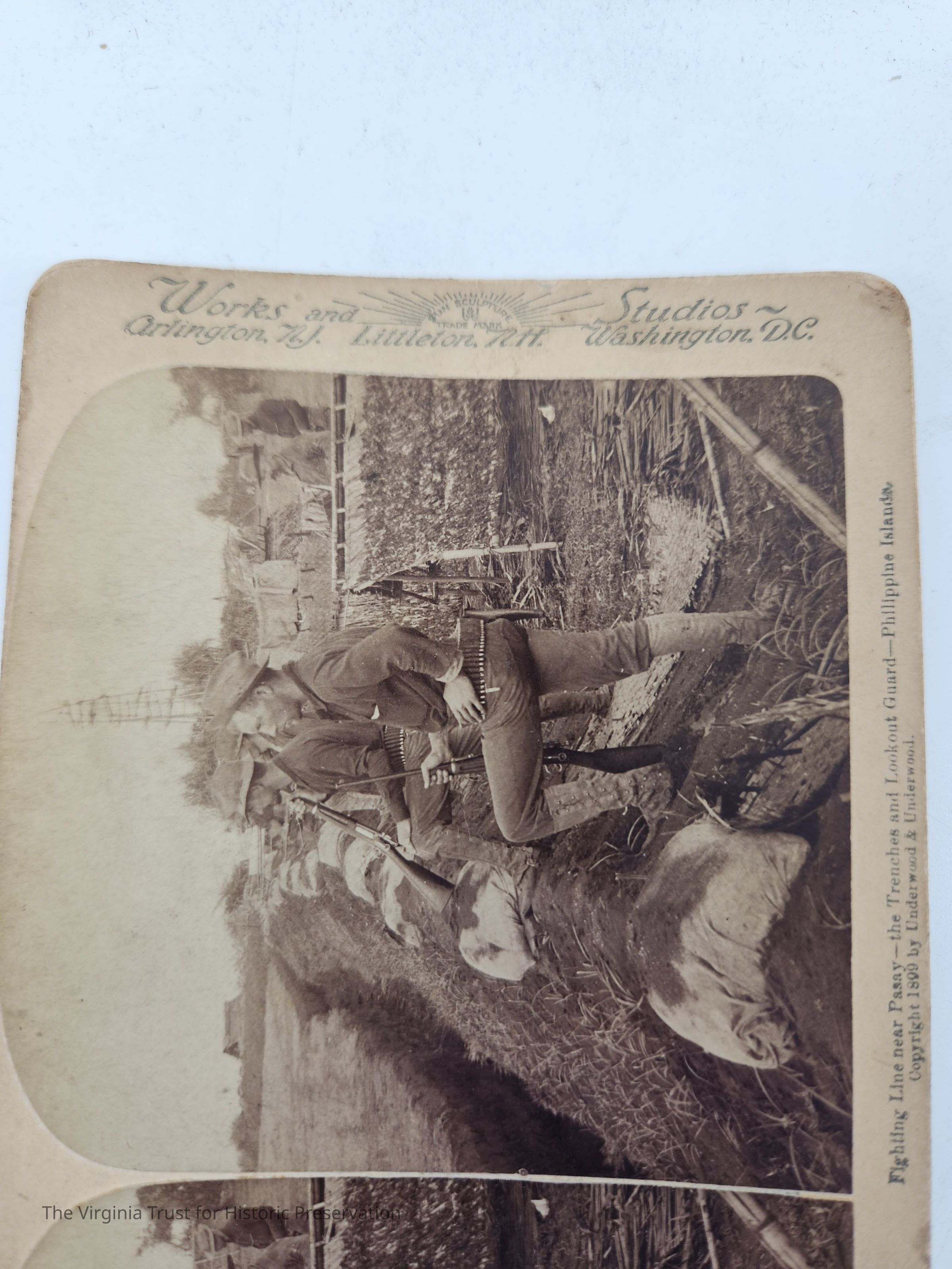 Stereograph titled "Fighting Line near Pasay - the Trenches and Lookout Guard" depicting men in uniform with rifles standing in front of a trench. Labeled with "Underwood & Underwood Publishers" and "Works and Studios Sun Sculpture Trademark." Copyright 1899 by Underwood & Underwood.